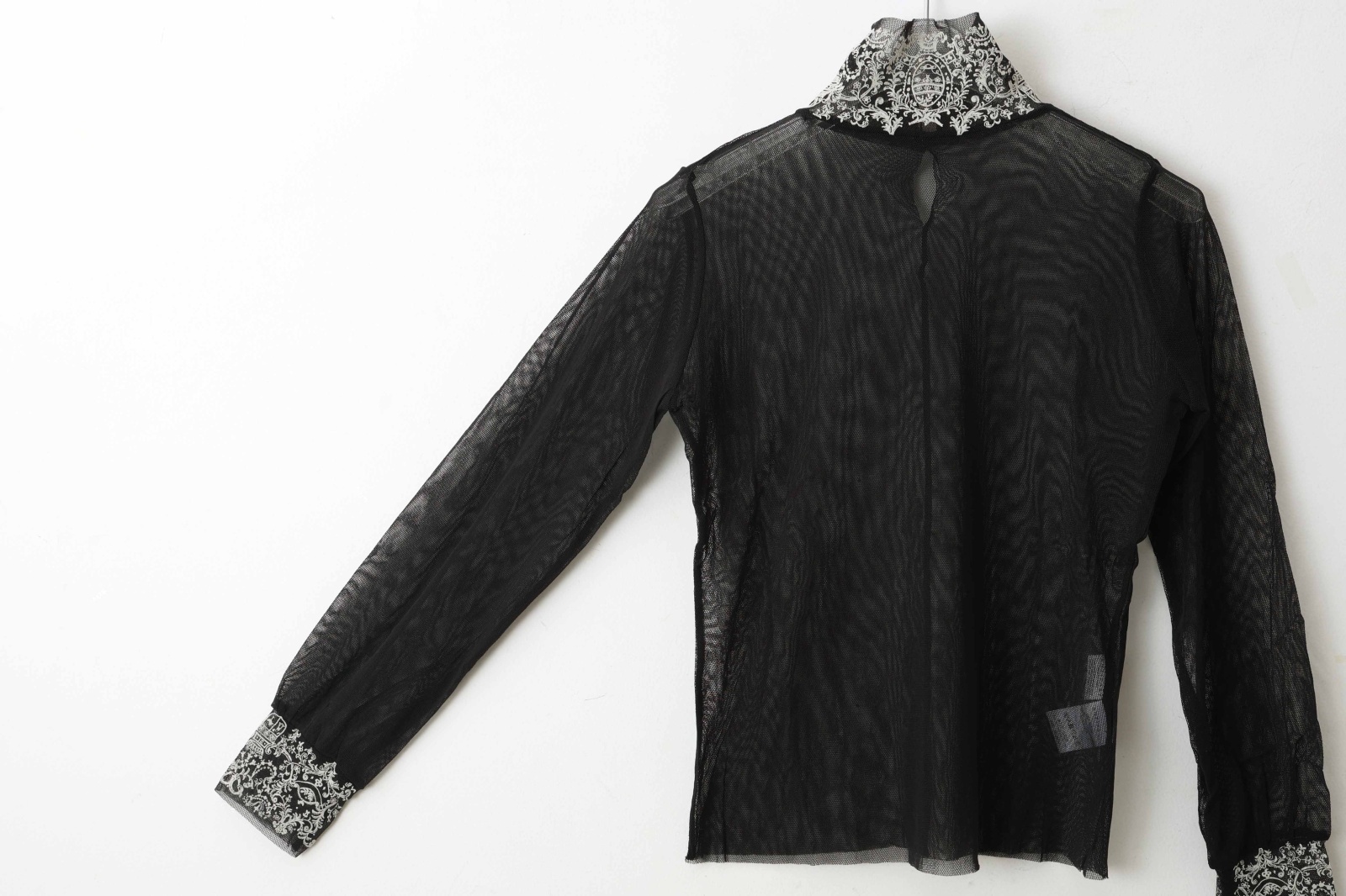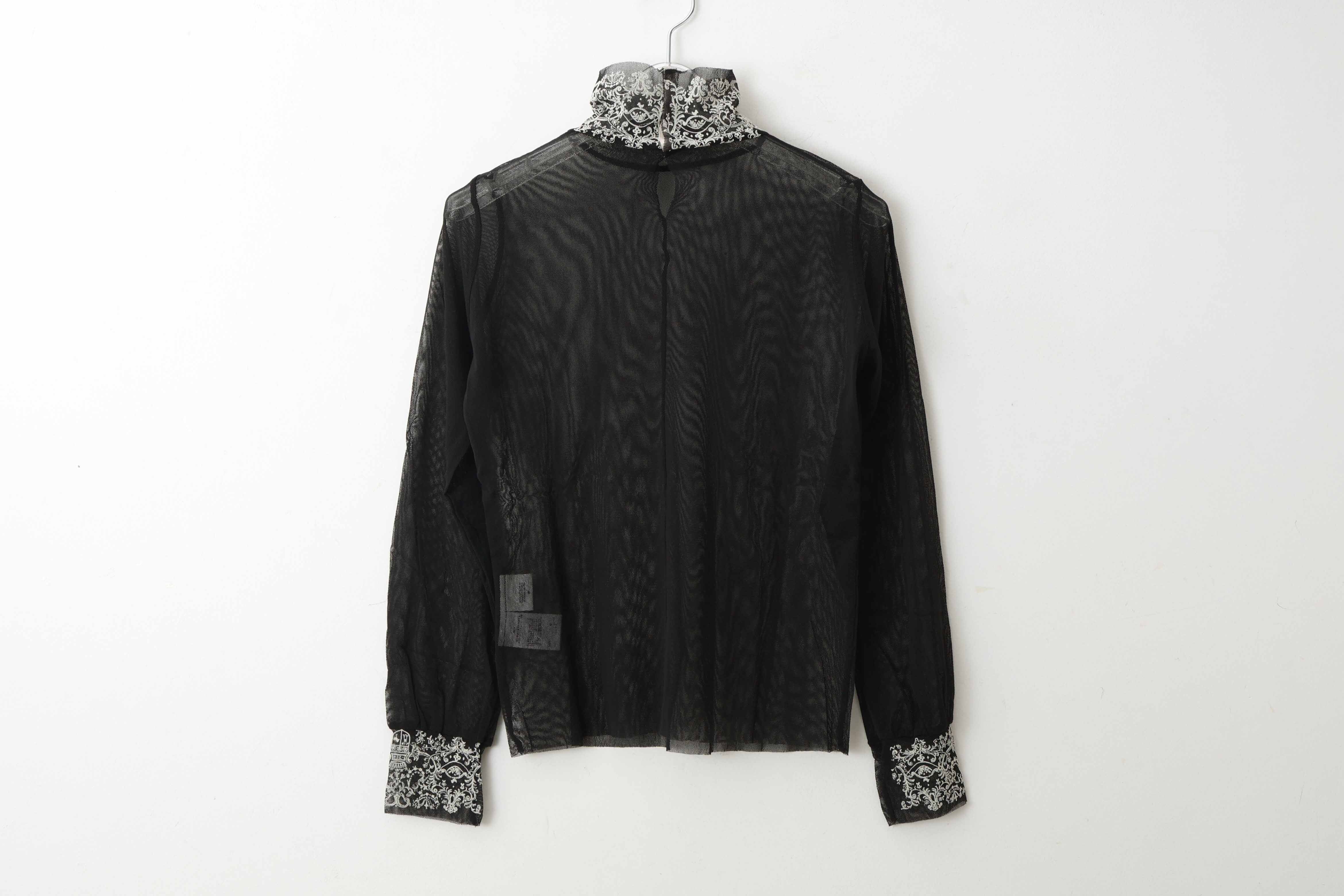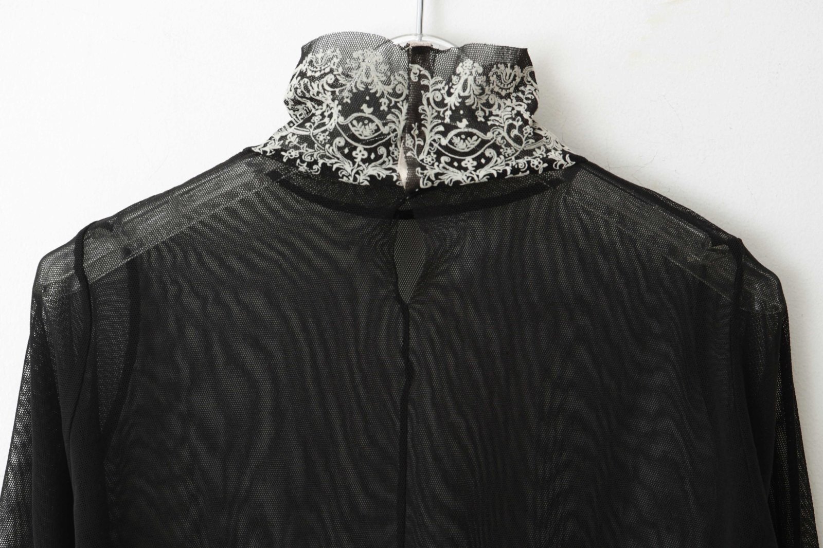 | 商品説明 | メッシュ素材に袖口とネック部分にフロッキープリントが施されたカットソー。柔らかな肌触り。ワンピースやベストのインナーとしてお召し頂くと、抜け感が演出できます。タートルネックの後ろがボタン開き。 |