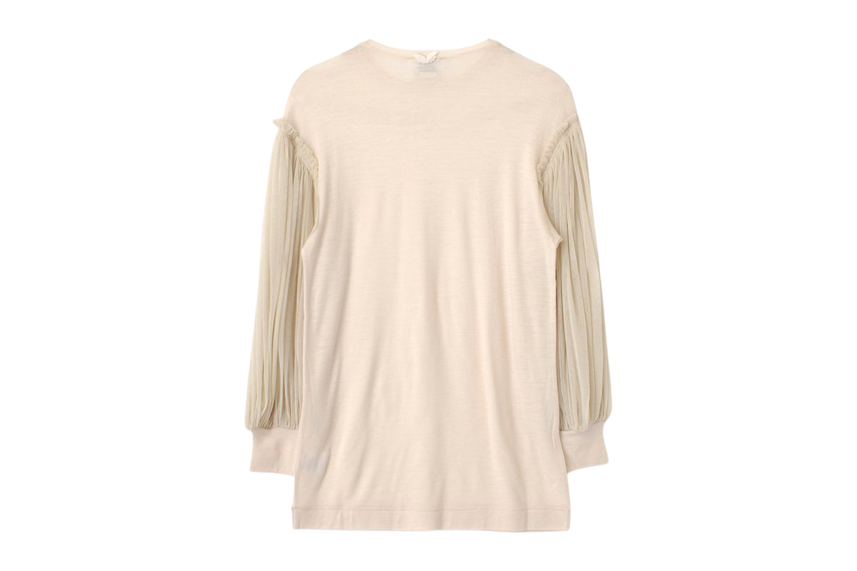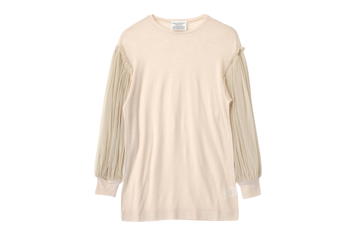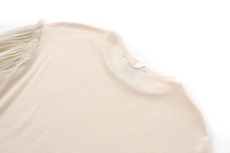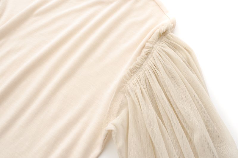 柔らかなチュールが重なった袖が特徴的なカットソー。ウールの柔らかでさらりとした生地感。バックの羽モチーフがポイントに。デニムとやシンプルなボトムとのコーディネートやノースリーブワンピースのレイヤードとしてもおすすめです。