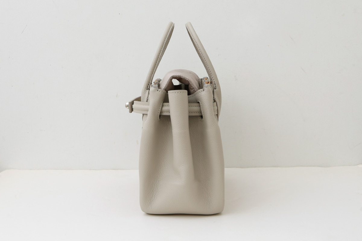 | 商品説明 | 厚みとコシがありながらもフニャフニャした感触が特徴のシュリンク・エンボスレザーと紅藤の組み合わせのケリー風バッグです。キャンバスのかぶせは本体についており、マグネットで留める仕様。中はキャンバス貼りで便利な内ポケット付き。手前のベルトは閉めて頂くとかっちりキレイめに、外すとカジュアルな印象になり、デニムなどのコーディネートに合わせても素敵です。 |