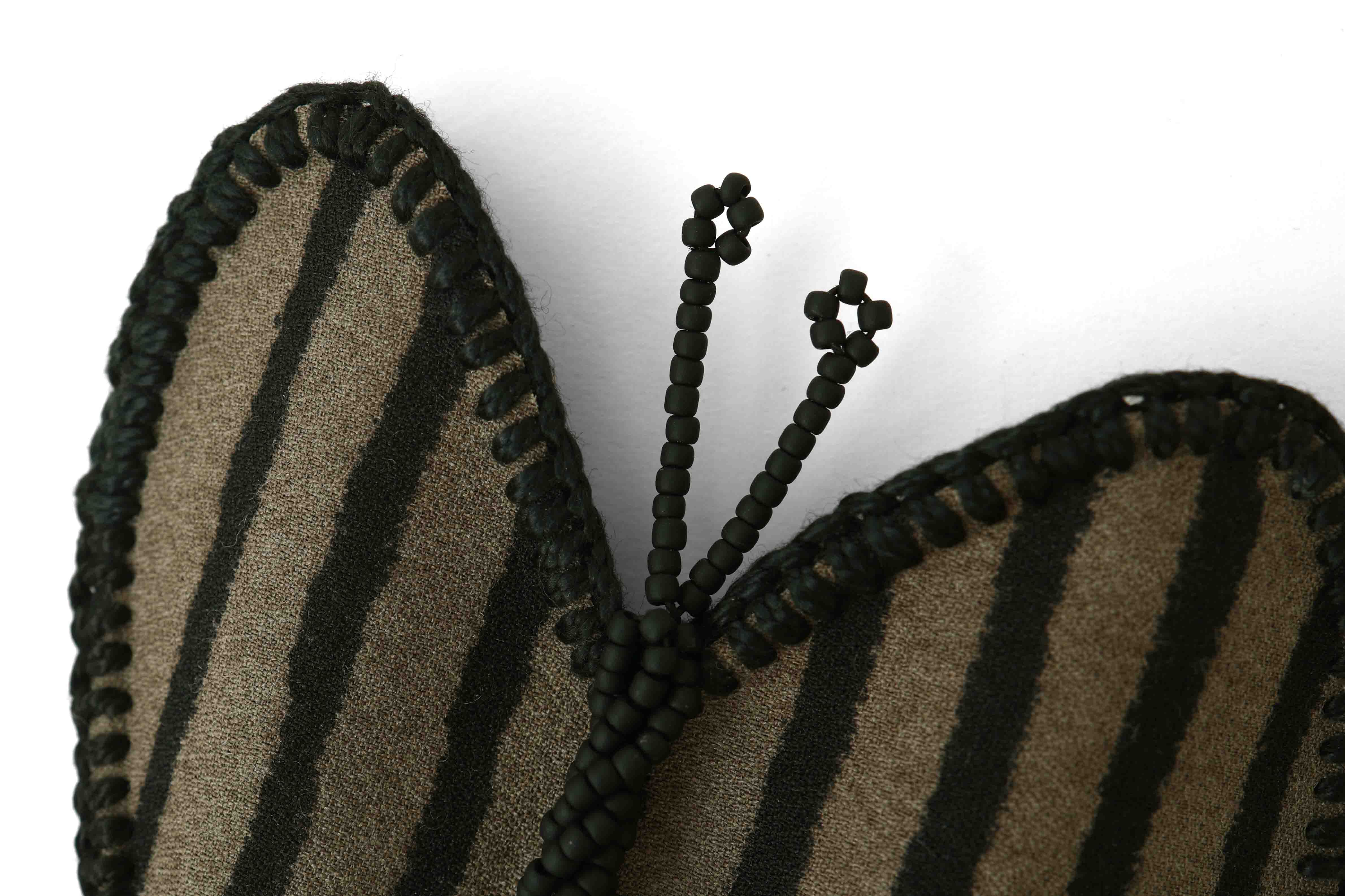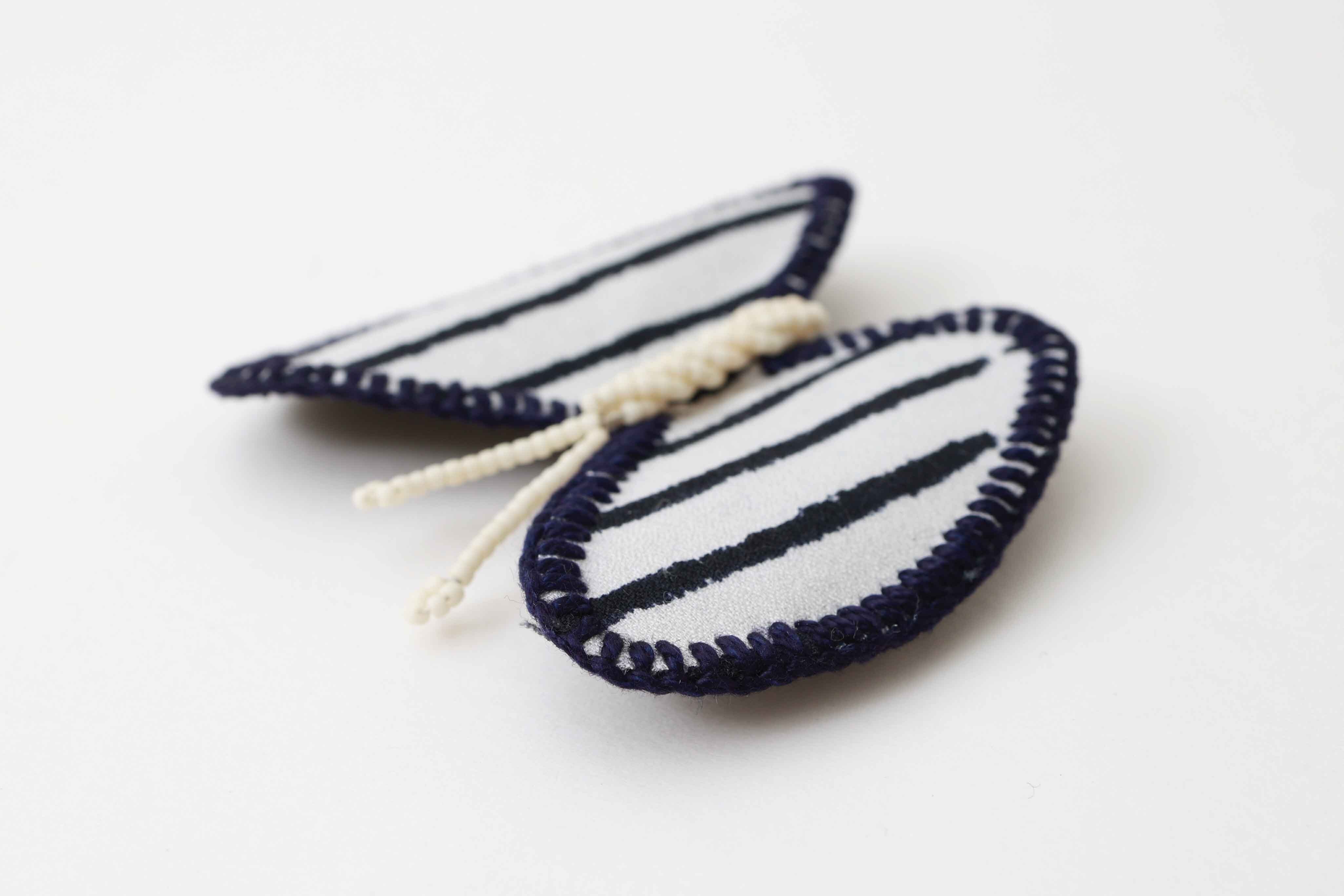 商品説明 | ストライプ柄の中に、おぼろげに花のフォルムが浮かび上がる“misty flower(ミスティー フラワー)”。ストライプのラインが途中で途切れたり、線の不均一な表情がデザインに独特のリズムを与えています。しなやかなコットンシルク地で作られた蝶々を象ったコサージュです。ブランケット刺繍で周りを縁取り、ガラスビーズで細かなパーツが添えられています。 |