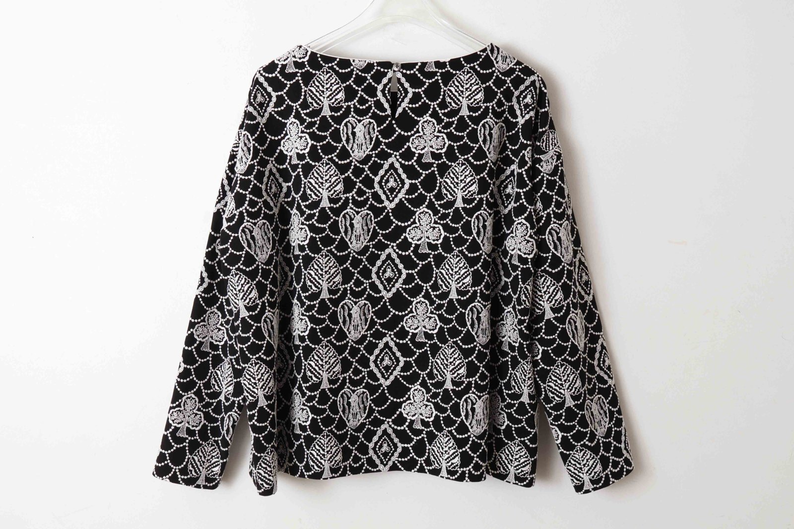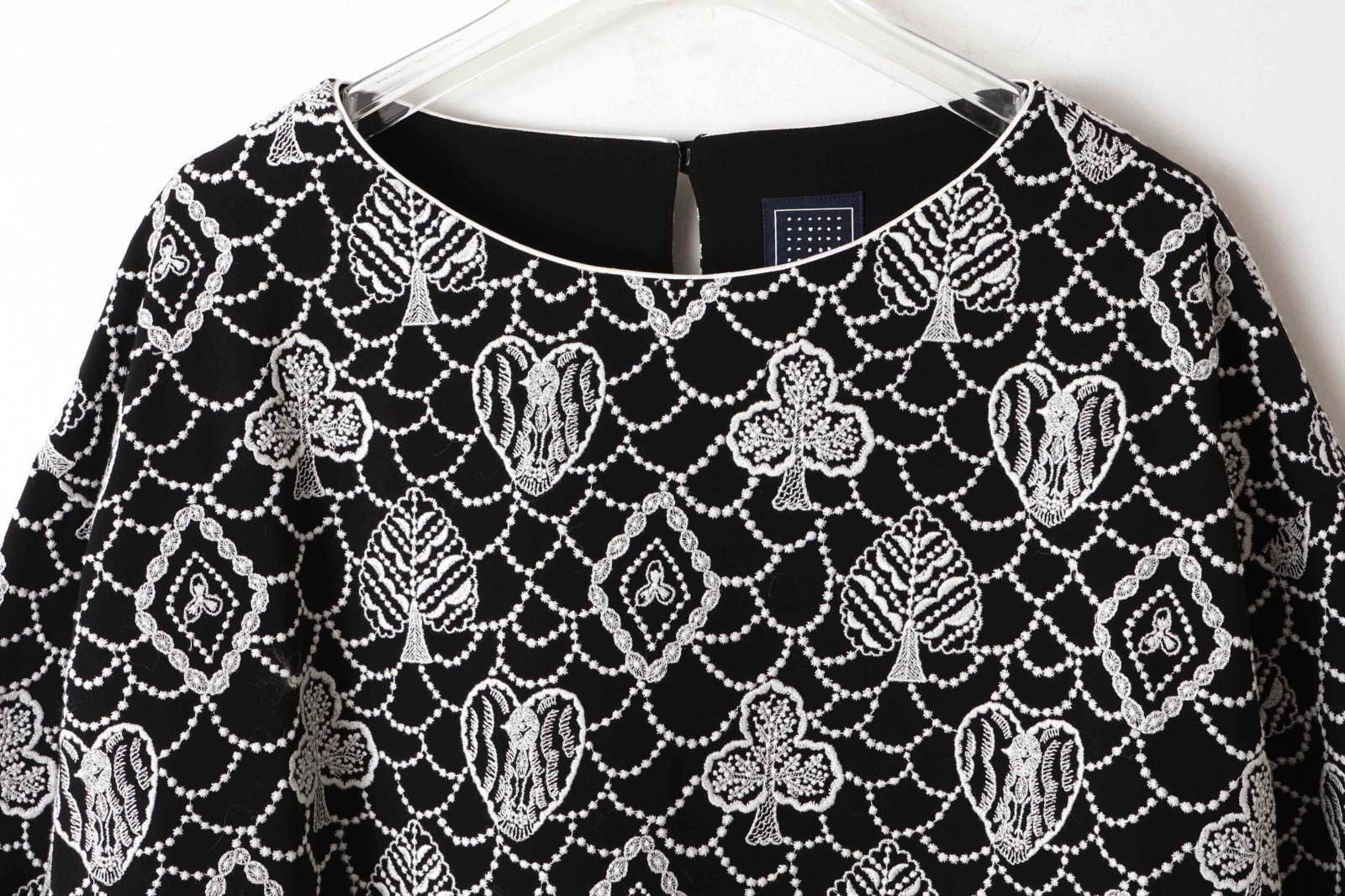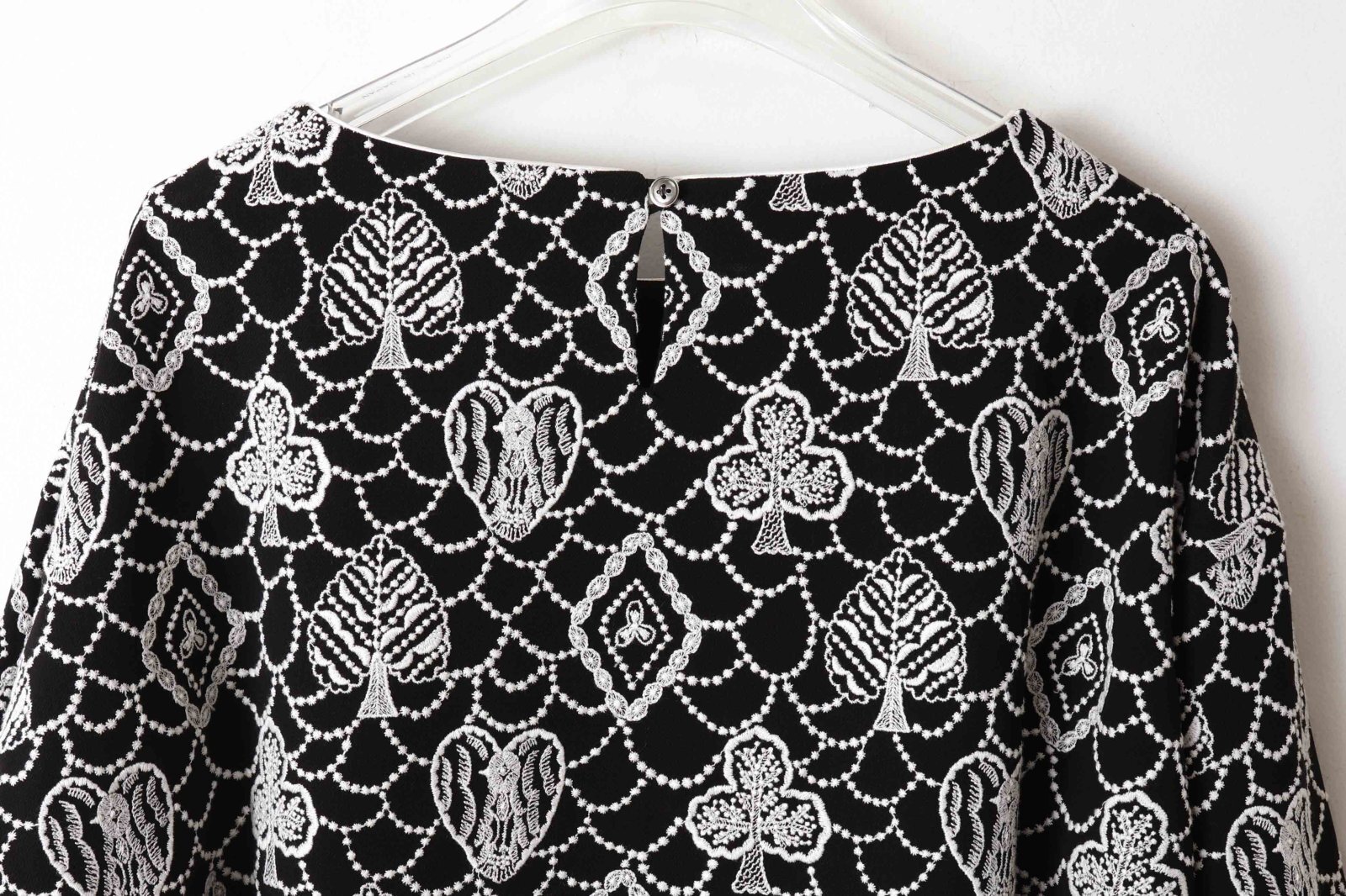 | 商品説明 | トランプのモチーフに森の情景を映した“forest card(フォレスト カード)”。アイコニックなフォルムの中に、別世界が広がっているような、幻想的な雰囲気が漂うデザインです。細番手の良質なウール糸を撚って織り上げた綾織りの生地に刺繍が施されたブラウス。ふくらみのある糸を使用した生地は、ナチュラルな伸縮性を持ち、心地よくお召しいただけます。しなやかな風合いが、ドレープを美しく引き立てます。 |