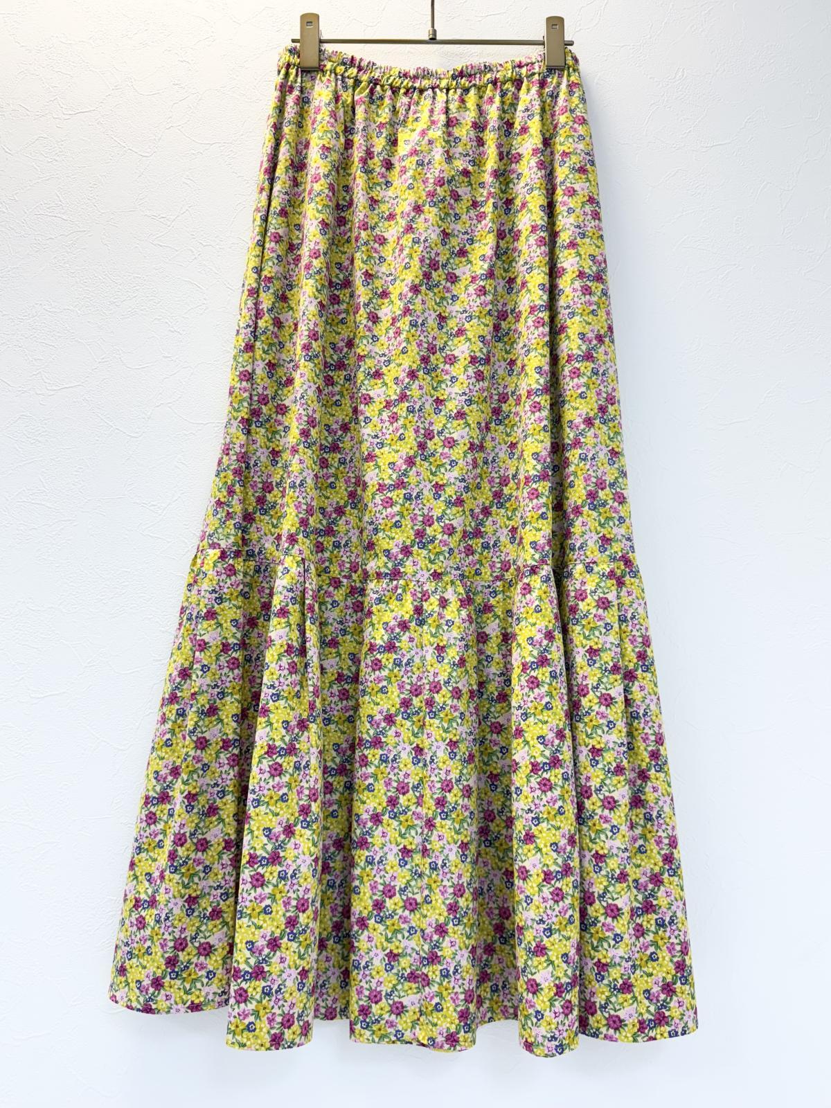 leur logetteアーカーイブのフラワープリント生地でショップ別注のティアードスカートをお作り頂きました。裾から程よく広がるティアードが大人のかわいさを演出します。レースブラウスでガーリーに、Tシャツやスウェットと合わせてカジュアルダウンするのも素敵です。ウエストゴムでラクな着心地。オールシーズンお召し頂けます。