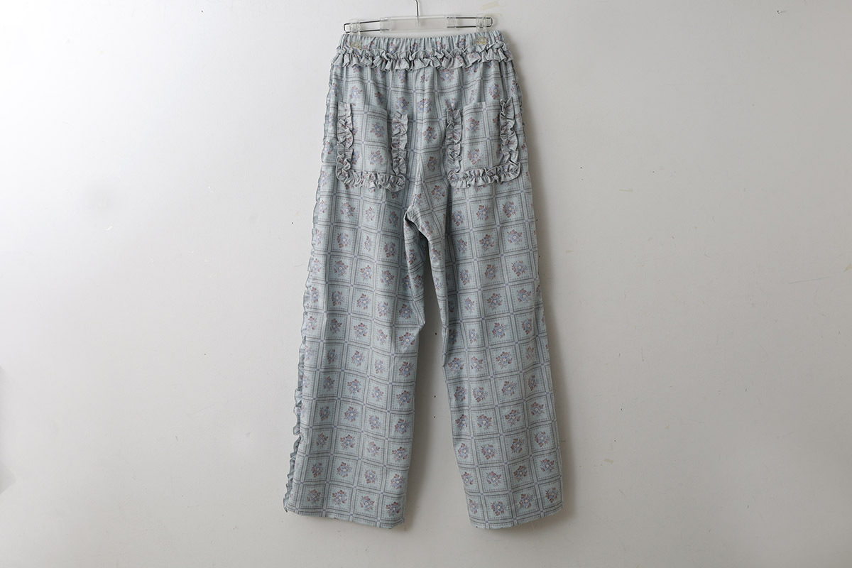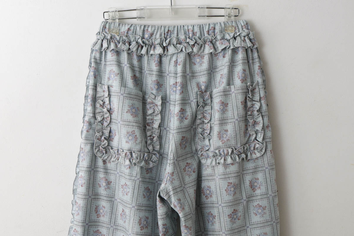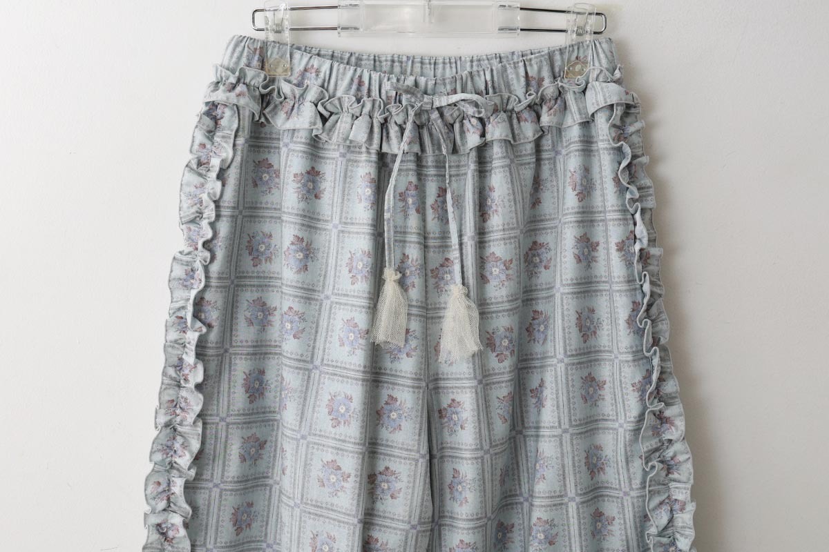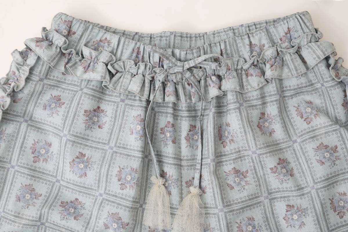 サイドやバックポケットにあしらわれたラッフルがかわいい格子とお花柄のパンツ。紐先のチュールがSOWAらしいこだわりが感じられます。両ポケット付き。