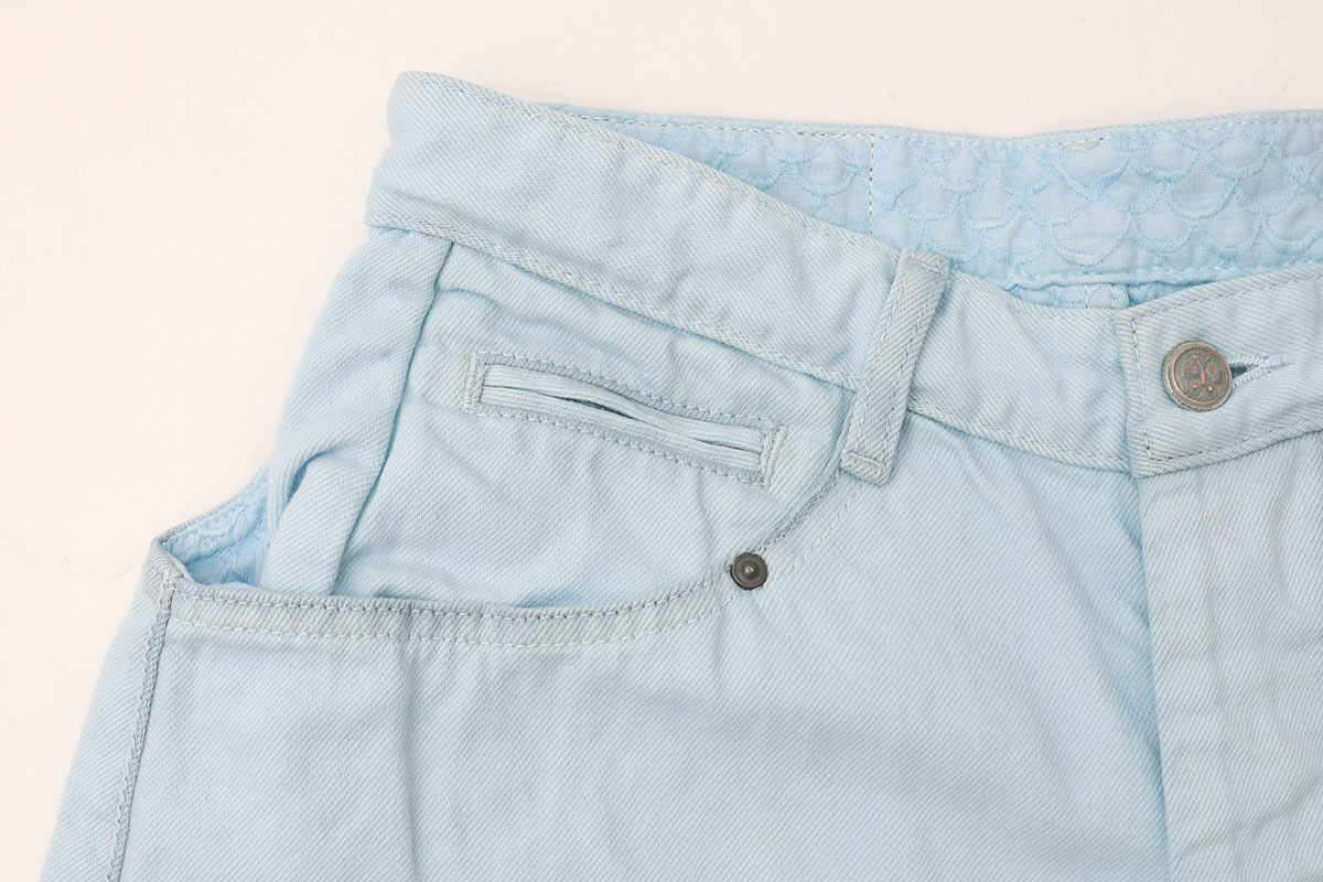 商品説明 | 横糸にリネンを使用した、さわやかでやわらかな手触りのalwaysデニム。フロントのボタンは蝶のモチーフがデザインされ、バックポケットの内側には“mermaid”の刺繍柄を配したディテールにもこだわった一着です。 2025s/sコレクションから、新しくお作りしたワイドシルエットのデニム。前ポケットがデニムのサイドラインからすこし飛び出るようにデザインされ、脇の直線的なフォルムが魅力です。 「indigo」はワンウォッシュ仕上げで、程よい張りを感じられ、「blue」はくったりと馴染んだような風合い。「light blue」はデニム生地を一度ブリーチ加工した後にブルーの染料で染めた、淡く澄んだ色合いです。履き続ける中で、色や風合いの変化をお楽しみください。 |