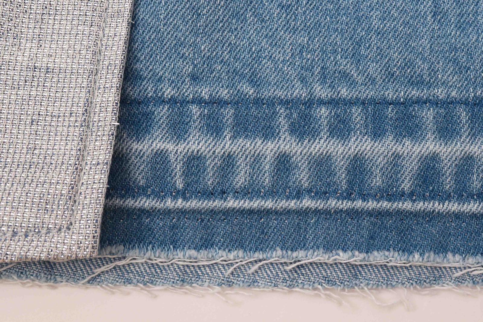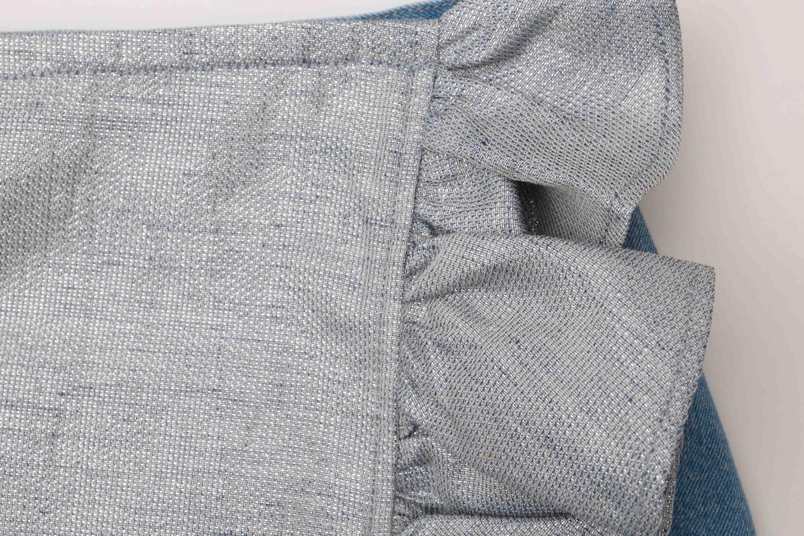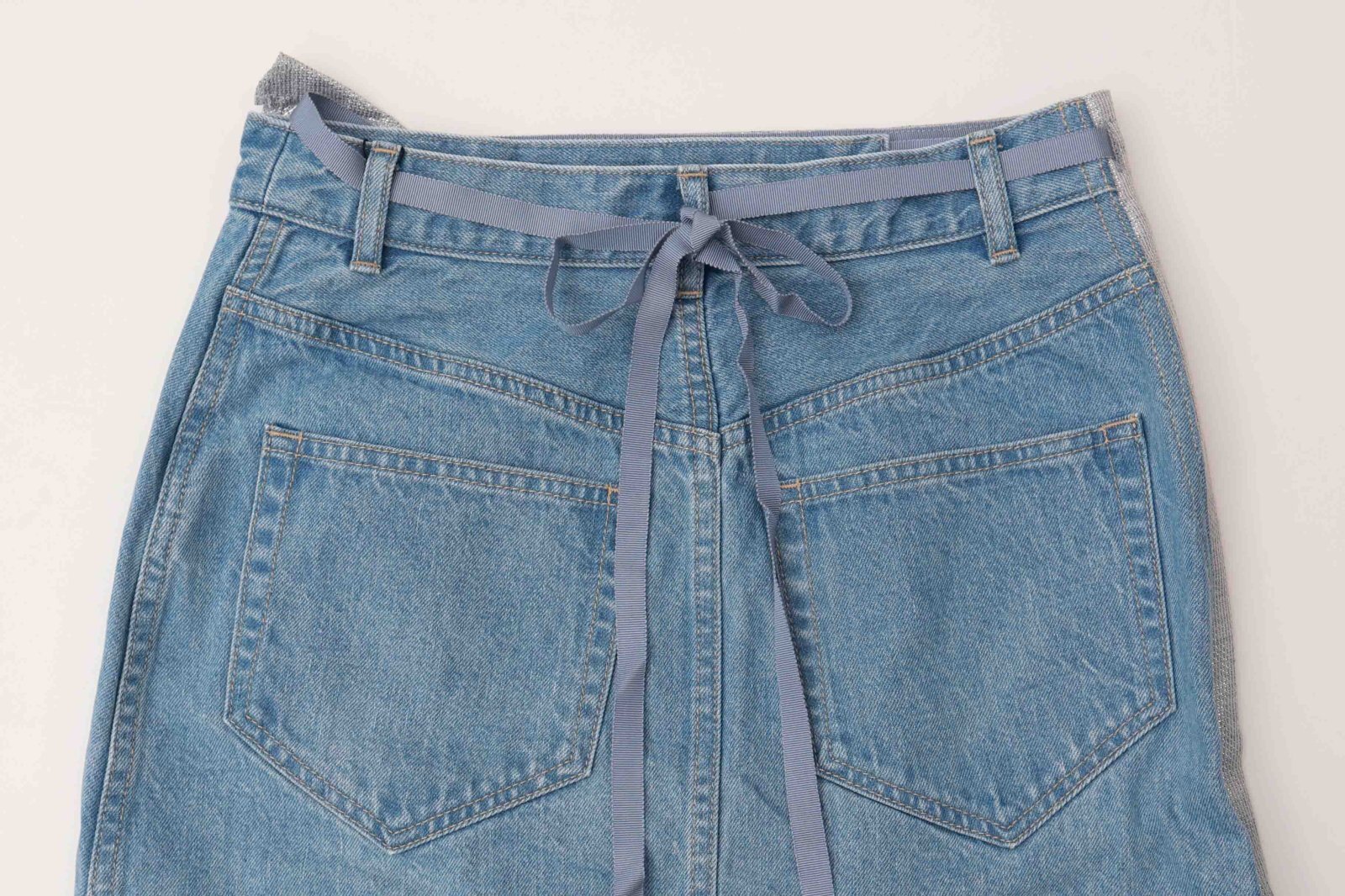 岡山デニムと上品に煌めくミラークロスのコンビネーションが目を惹く華やかなラップスカート(巻きスカート)。