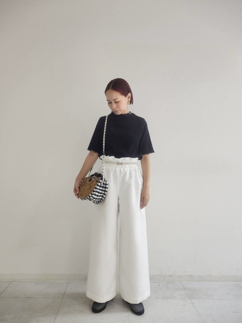 ブラックのマトラッセジャガードが上品な存在感を醸し出すパンツ。タックインすると現れるデザイン性のあるウエストシャーリング。足のラインをストンときれいに覆うので、体型カバーが叶い、かつリラックスした着用感でデイリー使いにもお出かけにも最適です。ホームクリーニング可。