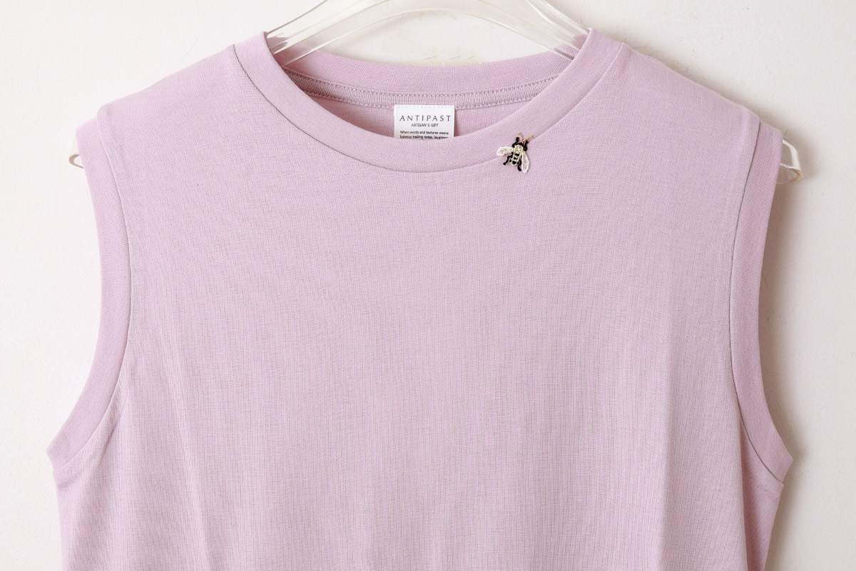 刺繍で象られたハチモチーフがちょこんとついたアンティパスト定番のカットソー。コットン100%のやや薄手で柔らかな肌触りのとても良い生地感です。この着心地の良さが癖になり、リピート買いする方が後を絶たない人気のカットソーです。程よく肩幅があるので、サラリとお召し頂くのも素敵。パンツやスカートとのシンプルなコーディネートやノースリーブワンピースの重ね着用としてもおすすめです。