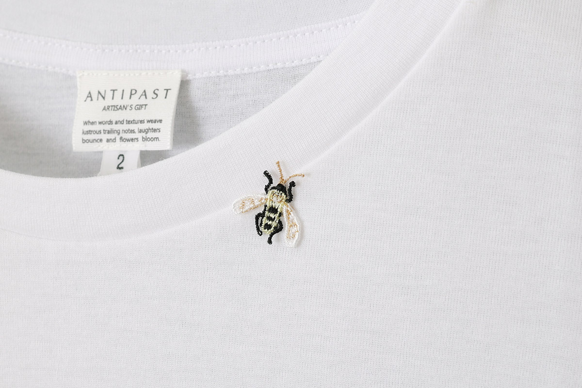 刺繍で象られたハチモチーフがちょこんとついたアンティパスト定番のカットソー。コットン100%のやや薄手で柔らかな肌触りのとても良い生地感です。この着心地の良さが癖になり、リピート買いする方が後を絶たない人気のカットソーです。程よく肩幅があるので、サラリとお召し頂くのも素敵。パンツやスカートとのシンプルなコーディネートやノースリーブワンピースの重ね着用としてもおすすめです。