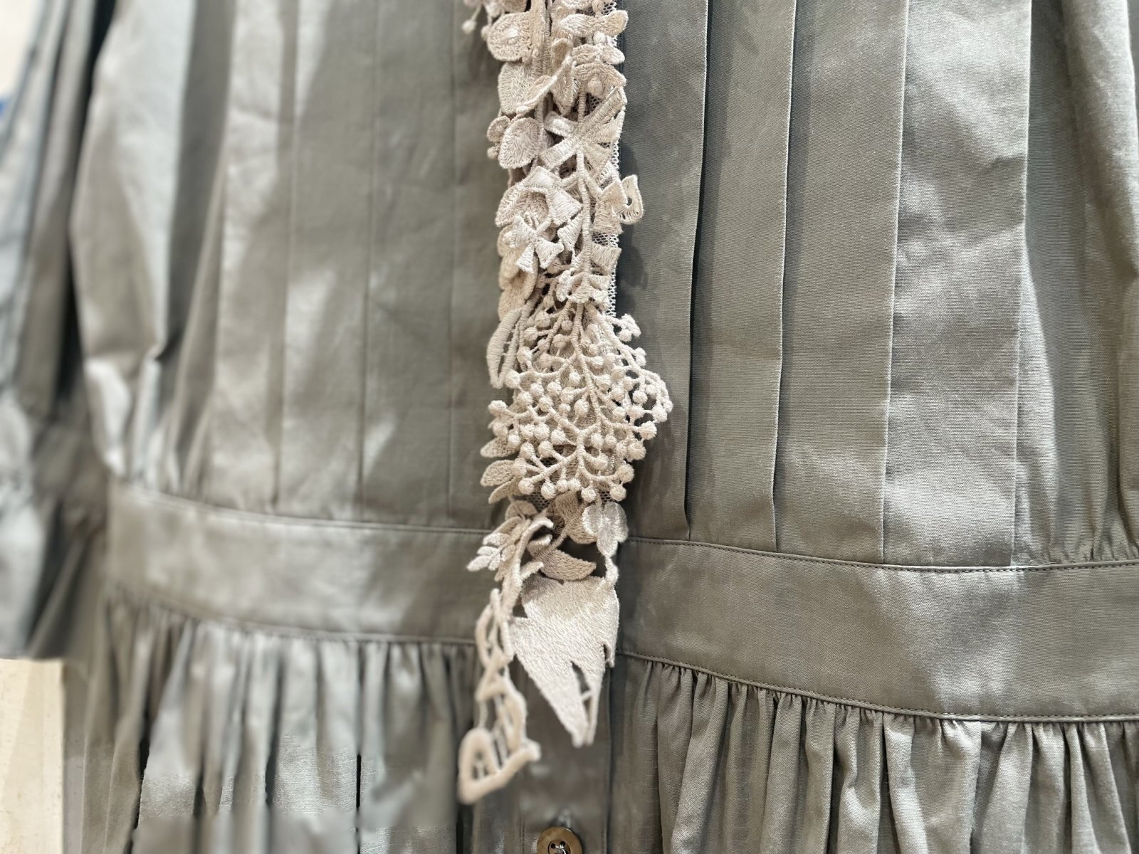 商品説明 | 経糸に細番手のコットン糸、横糸にコットン糸とシルク糸を使い、高密度に織り上げたテキスタイル。生地にはシルク糸による、陰影のような淡いボーダー模様が浮かびます。 ウエスト部分に切り替えを入れたドレス。上半身部分に細かなタックを入れ、スカート部分はギャザーにて仕上げられています。ギャザーのやわらかな表情が加わることで、日常にも取り入れやすい、優しい雰囲気に感じられます。フロントには“forest parade”のレースが添えられています。 |