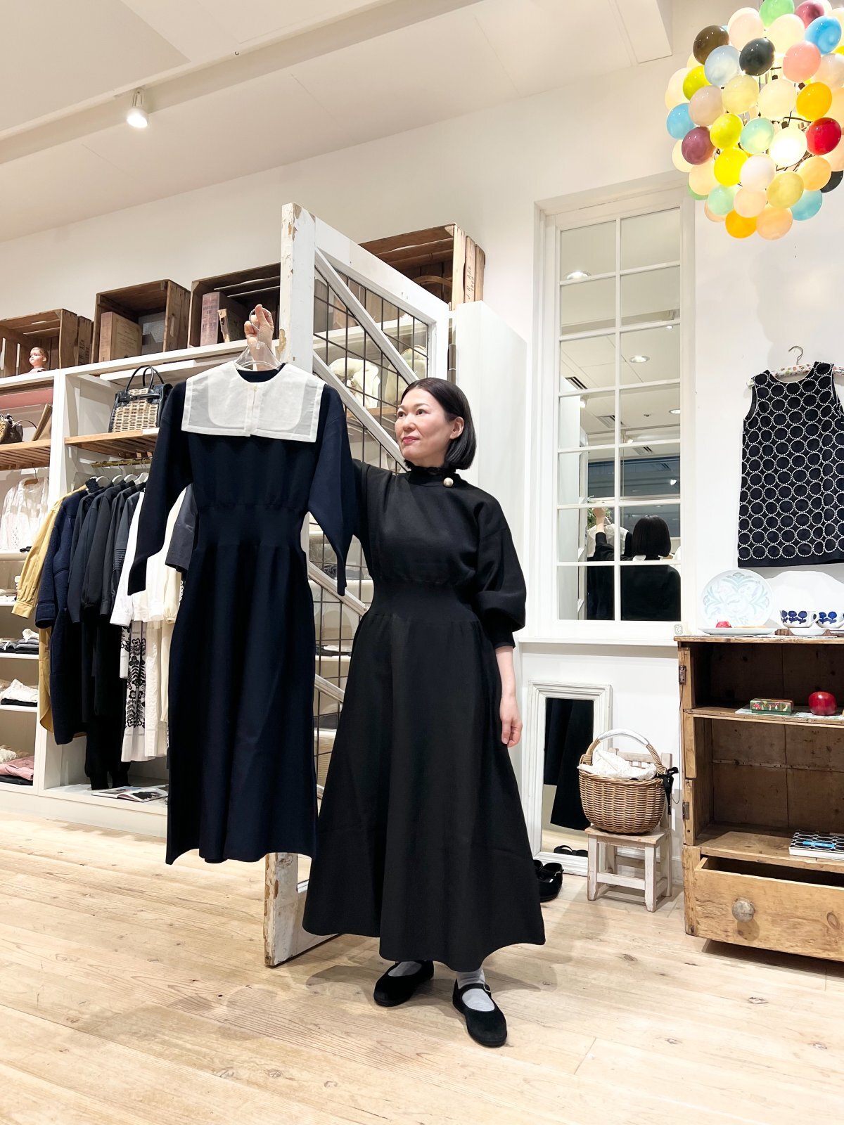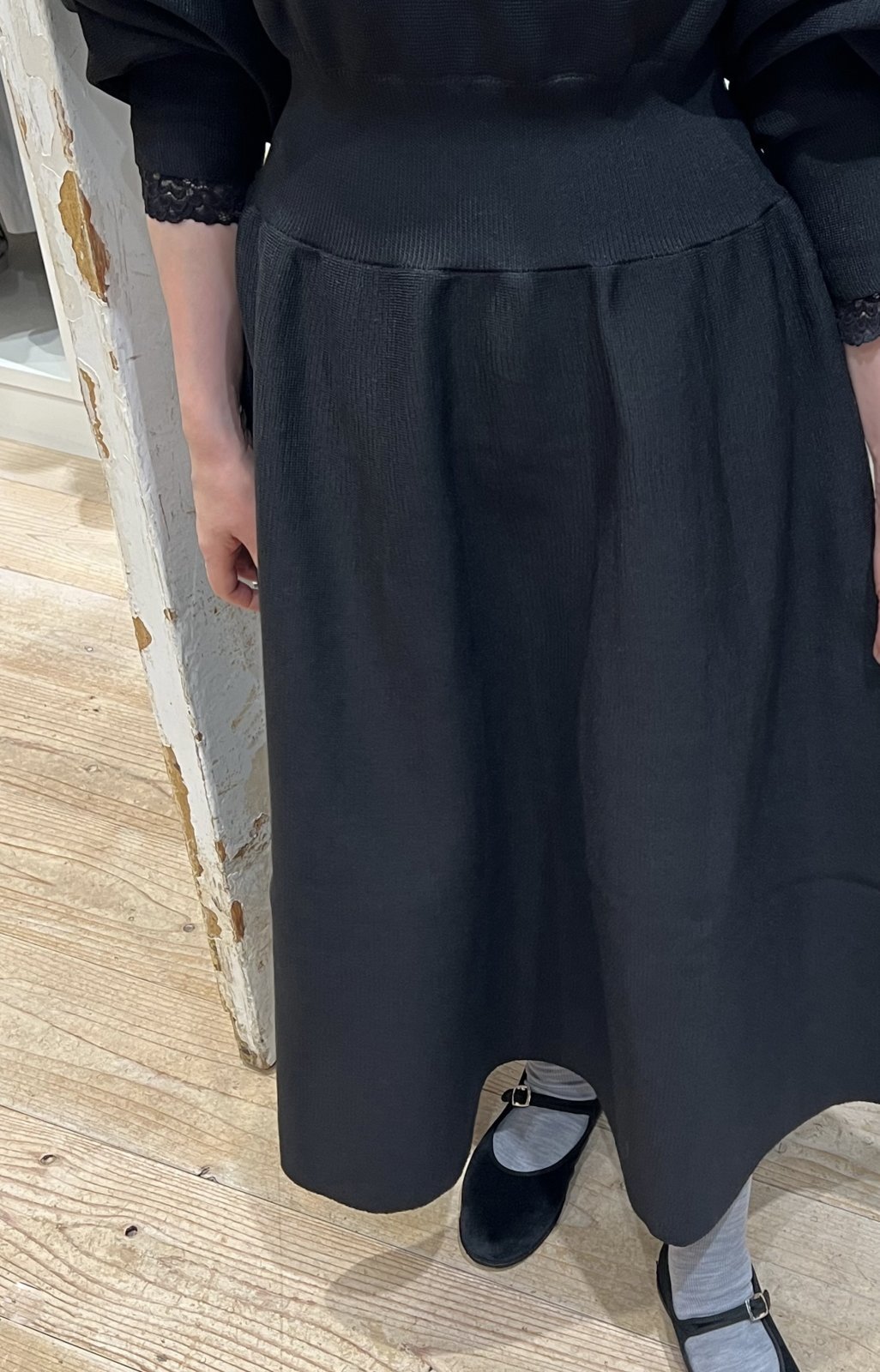 以前のAMOSSAワンピースはIラインシルエットでしたが、今回はフレアータイプにしてキャズエドゥミ別注でお作りいただきました。
