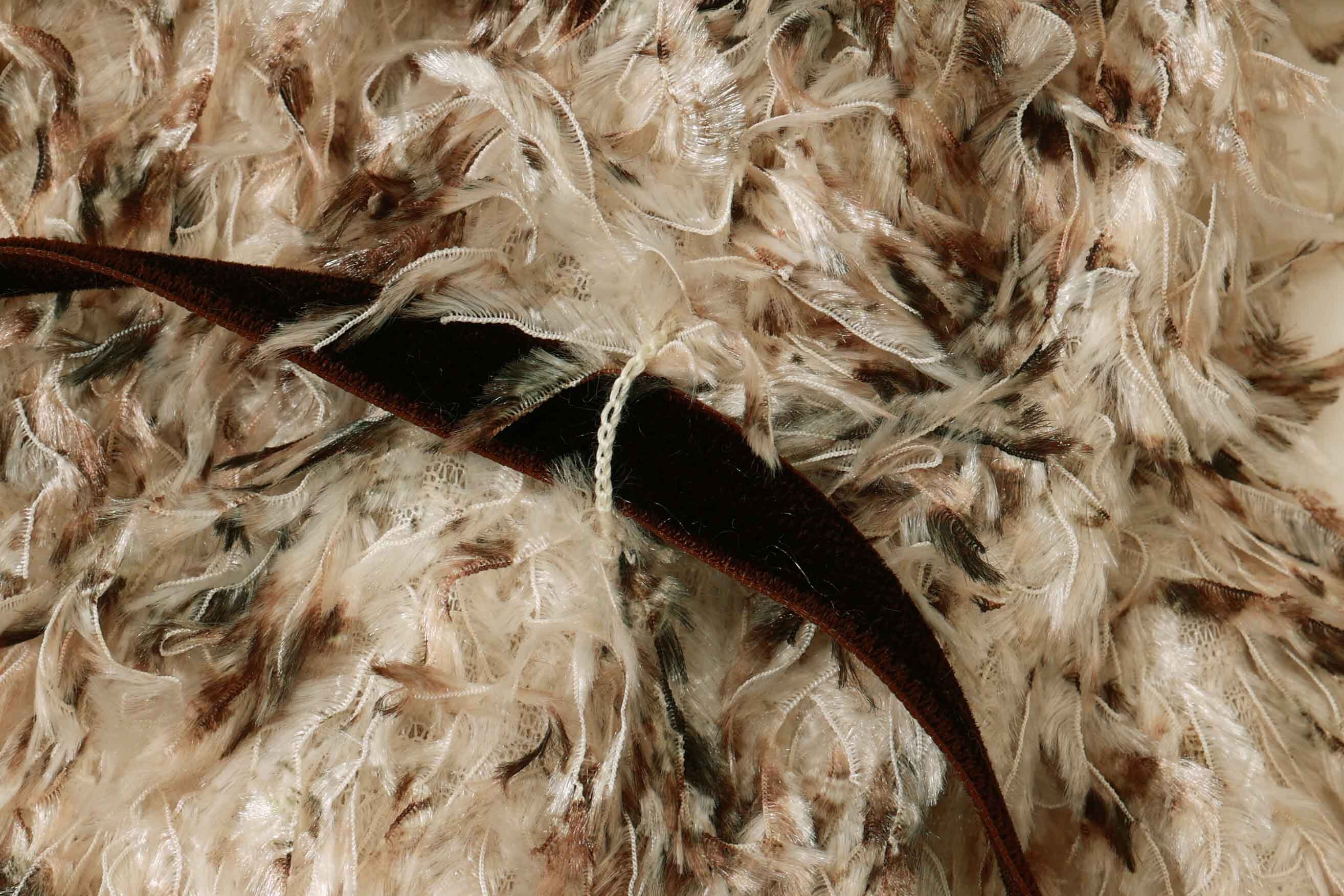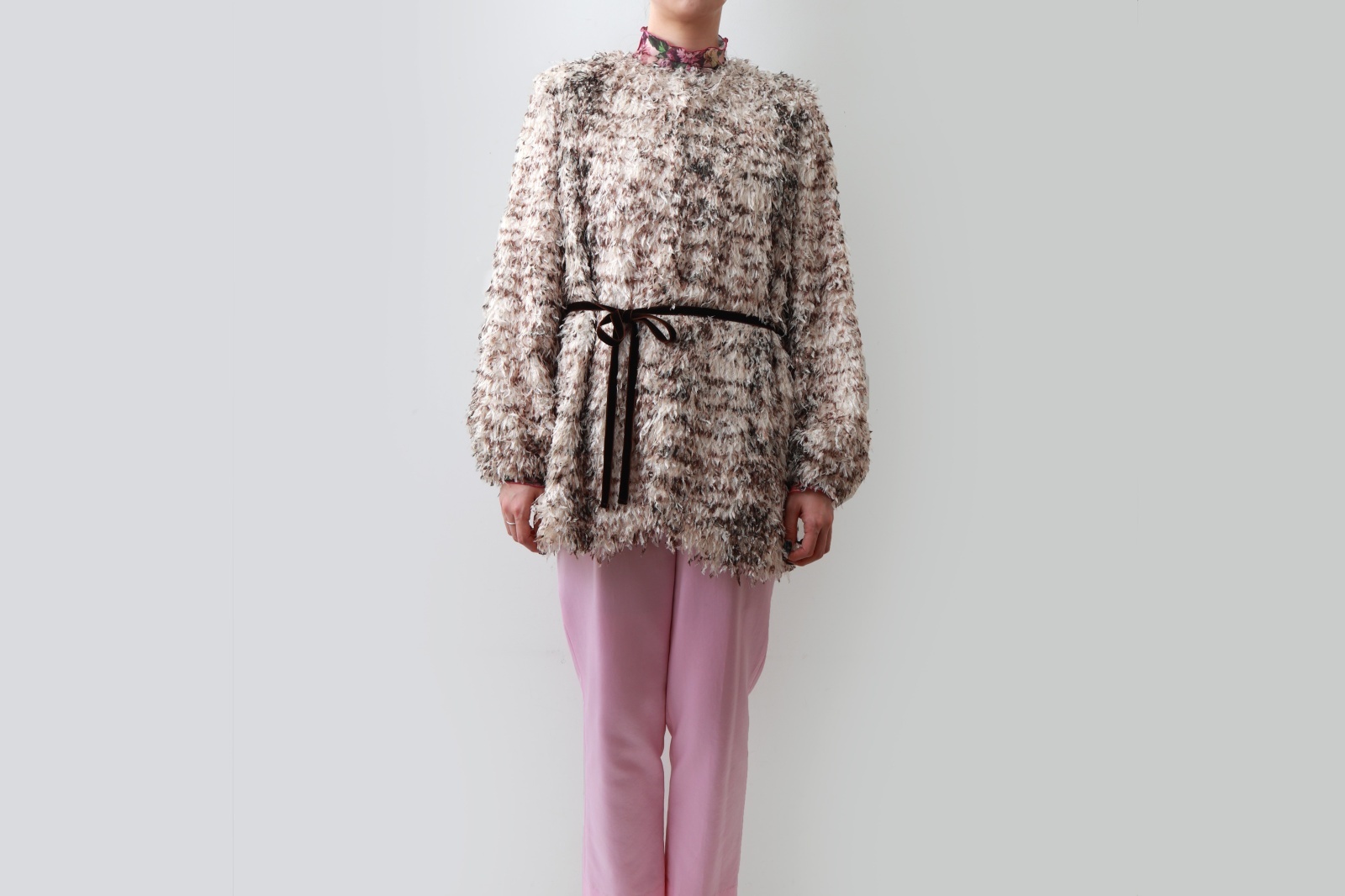 やわらかなファンシーヤーンが使用されたストレッチ性のあるカットジャカードに抽象的なプリントが施されています。