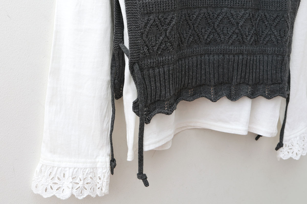 商品説明 | 秋口から活躍しそうなベストです。下にカットソーやハイネックのトップスを重ねてのコーディネートがオススメ。首元や裾にほどこされたスカラップがかわいらしい印象に。前後で着用ができます。 |