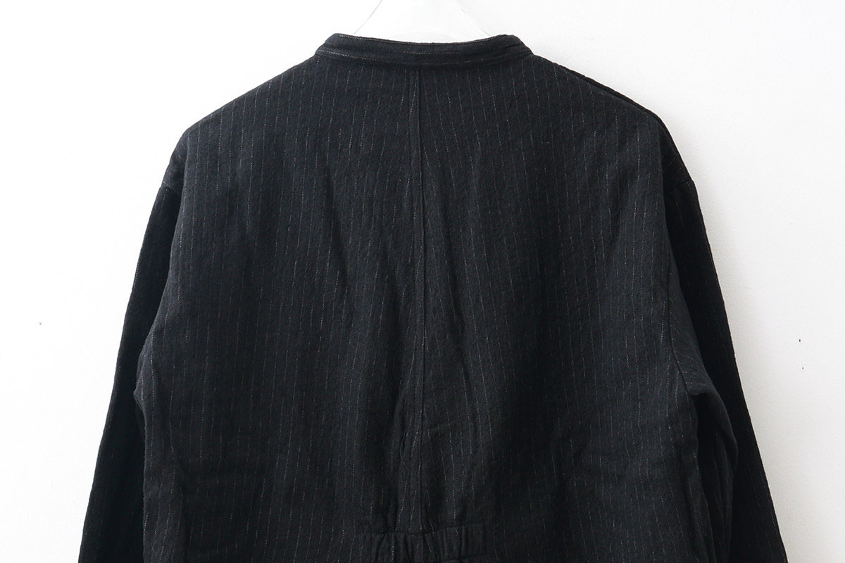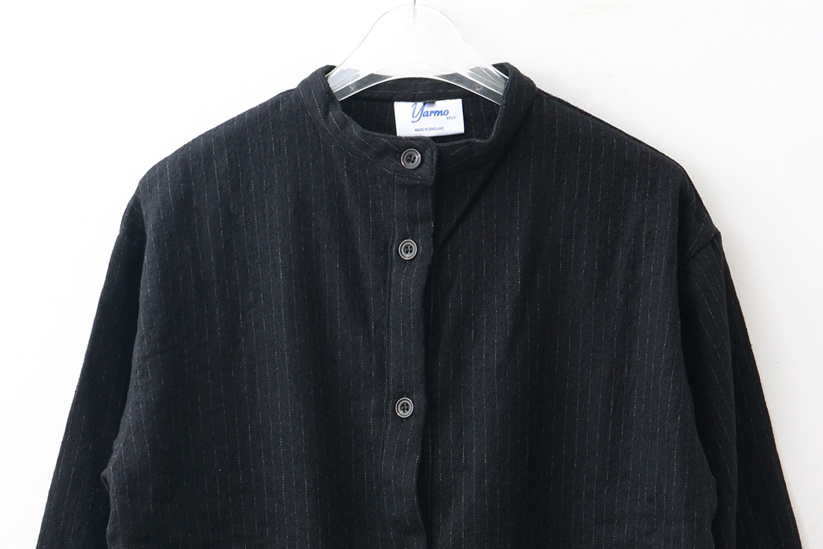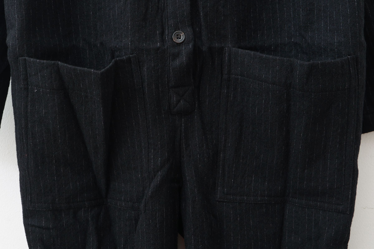 ヤーモの新定番オールインワン、Warehouse Suit。Boiler Suitと比べてよりスッキリしたフォルムとテーパードしたボトムシルエット、バンドカラーが特徴。素朴な風合いのコットンウールにチョークストライプ。インナーにニットやブラウスやシャツを重ねてアレンジをするのもおすすめ。MADE IN ENGLAND