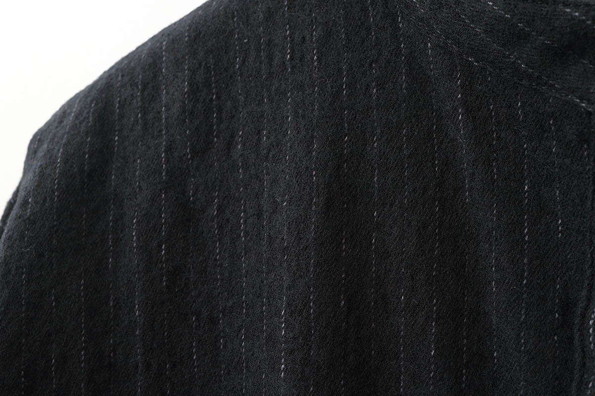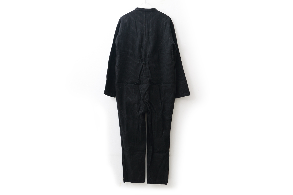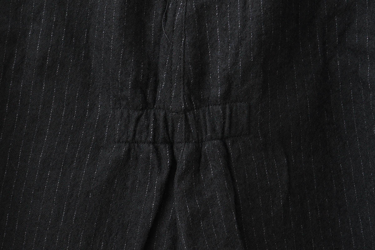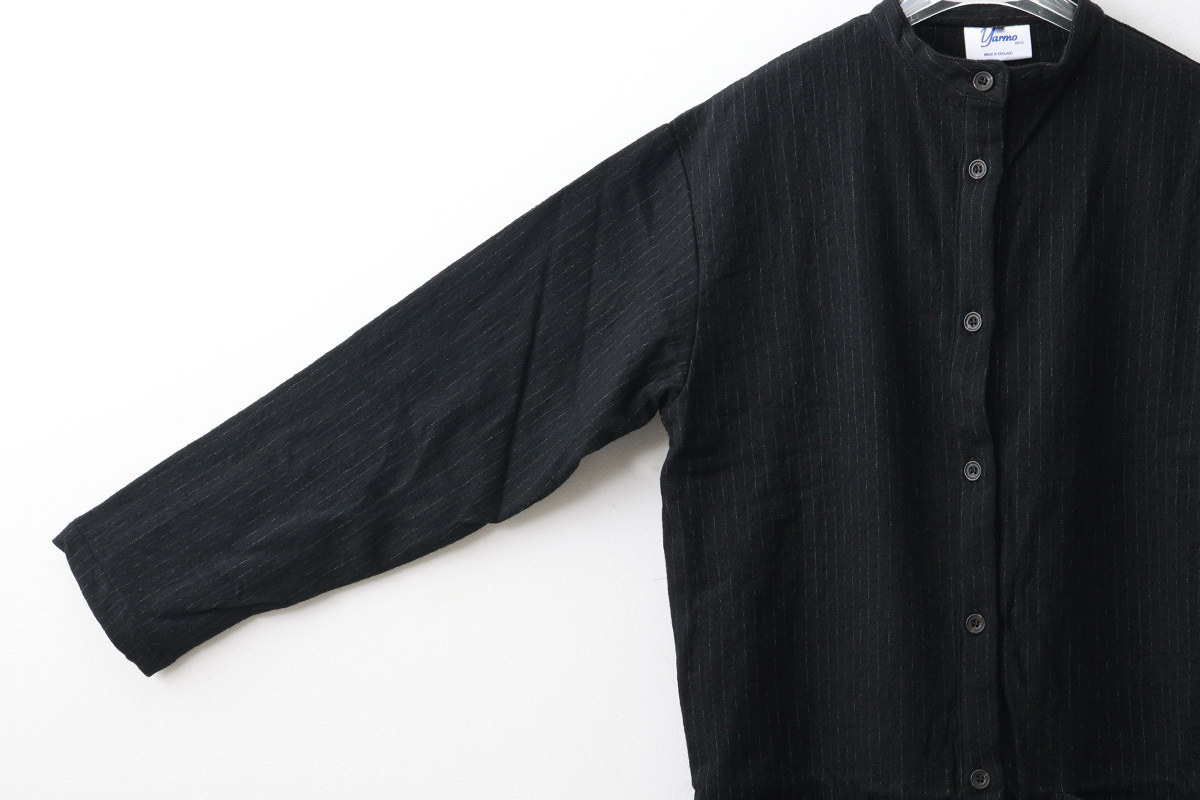 ヤーモの新定番オールインワン、Warehouse Suit。Boiler Suitと比べてよりスッキリしたフォルムとテーパードしたボトムシルエット、バンドカラーが特徴。素朴な風合いのコットンウールにチョークストライプ。インナーにニットやブラウスやシャツを重ねてアレンジをするのもおすすめ。MADE IN ENGLAND
