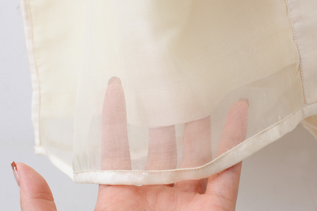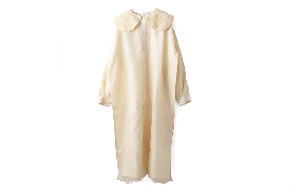 四角くカットされたオーガンジーをドットのように刺繍で留めてある、まるで紫陽花のようなテキスタイルを衿部分に使用。エアリーな無地のオーガンジー。