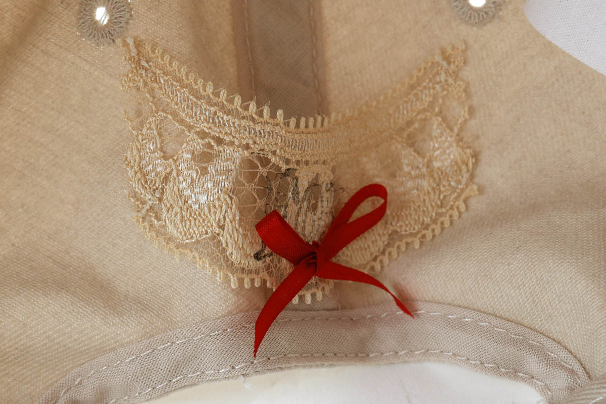 コットンの糸で編み上げたハートモチーフのブローチが添えられています。このブローチはピンで取り外しが可能なので、その日の気分に合わせて付け外しが可能。