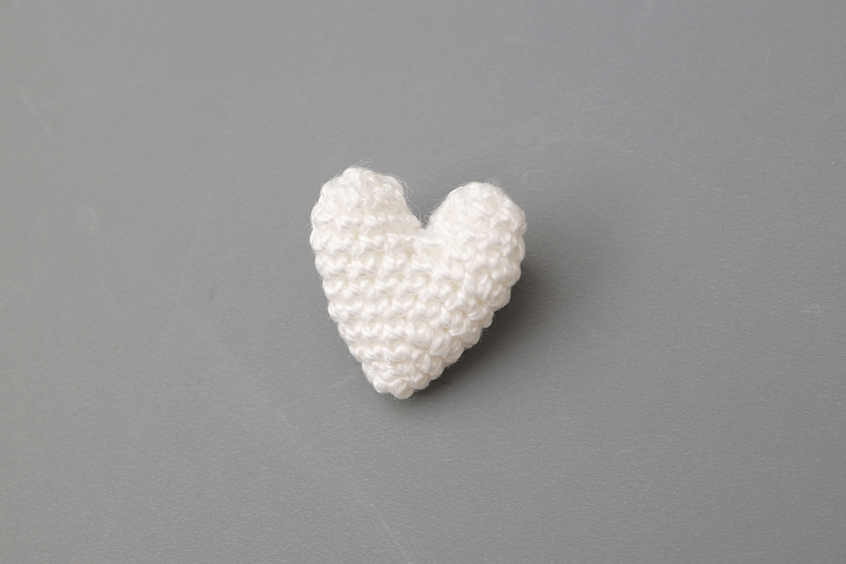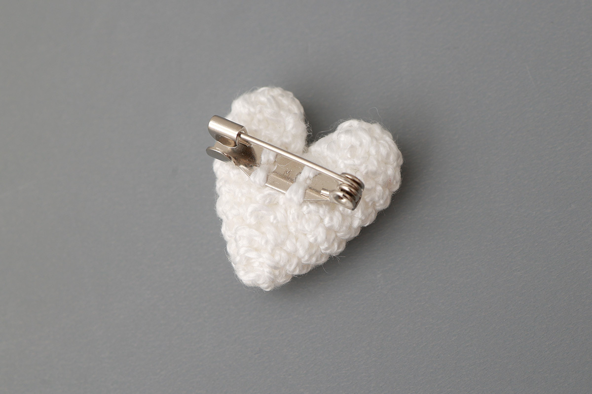 コットンの糸で編み上げたハートモチーフのブローチが添えられています。このブローチはピンで取り外しが可能なので、その日の気分に合わせて付け外しが可能。