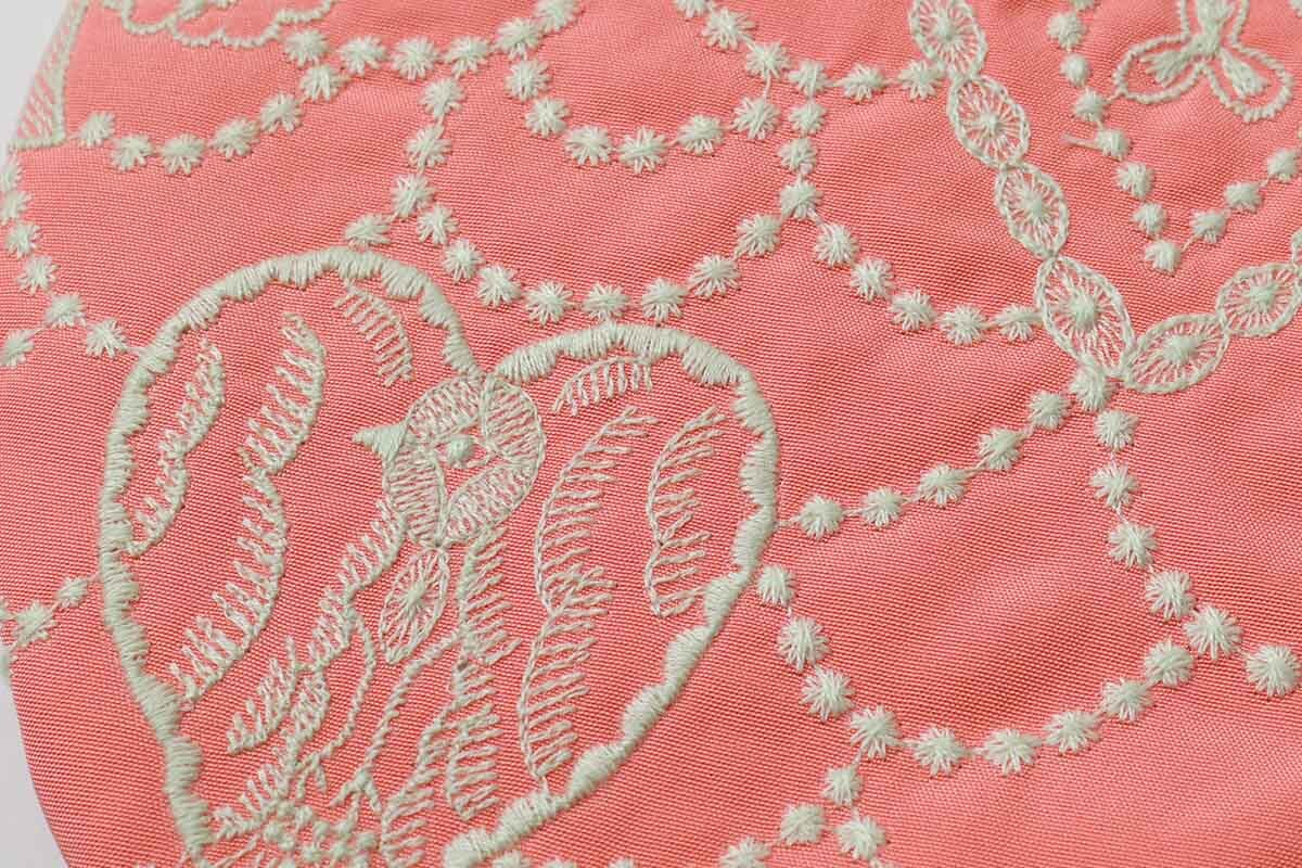 | 素材 | 絹55% 綿45% 刺繍部分/上糸 綿100% 下糸 ポリエステル100% 別布部分/ポリエステル80% ポリウレタン20% 裏生地/ポリエステル100% |