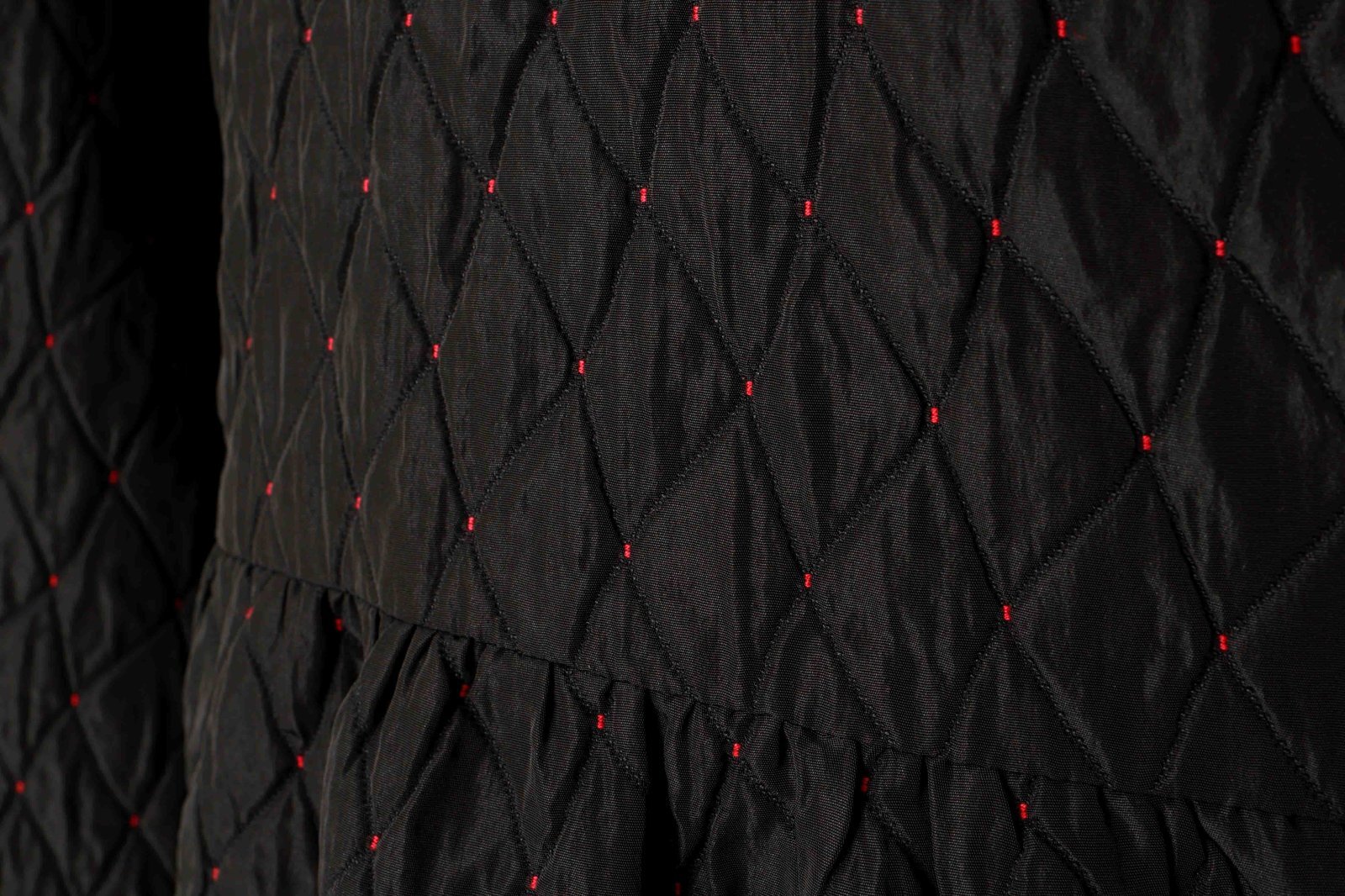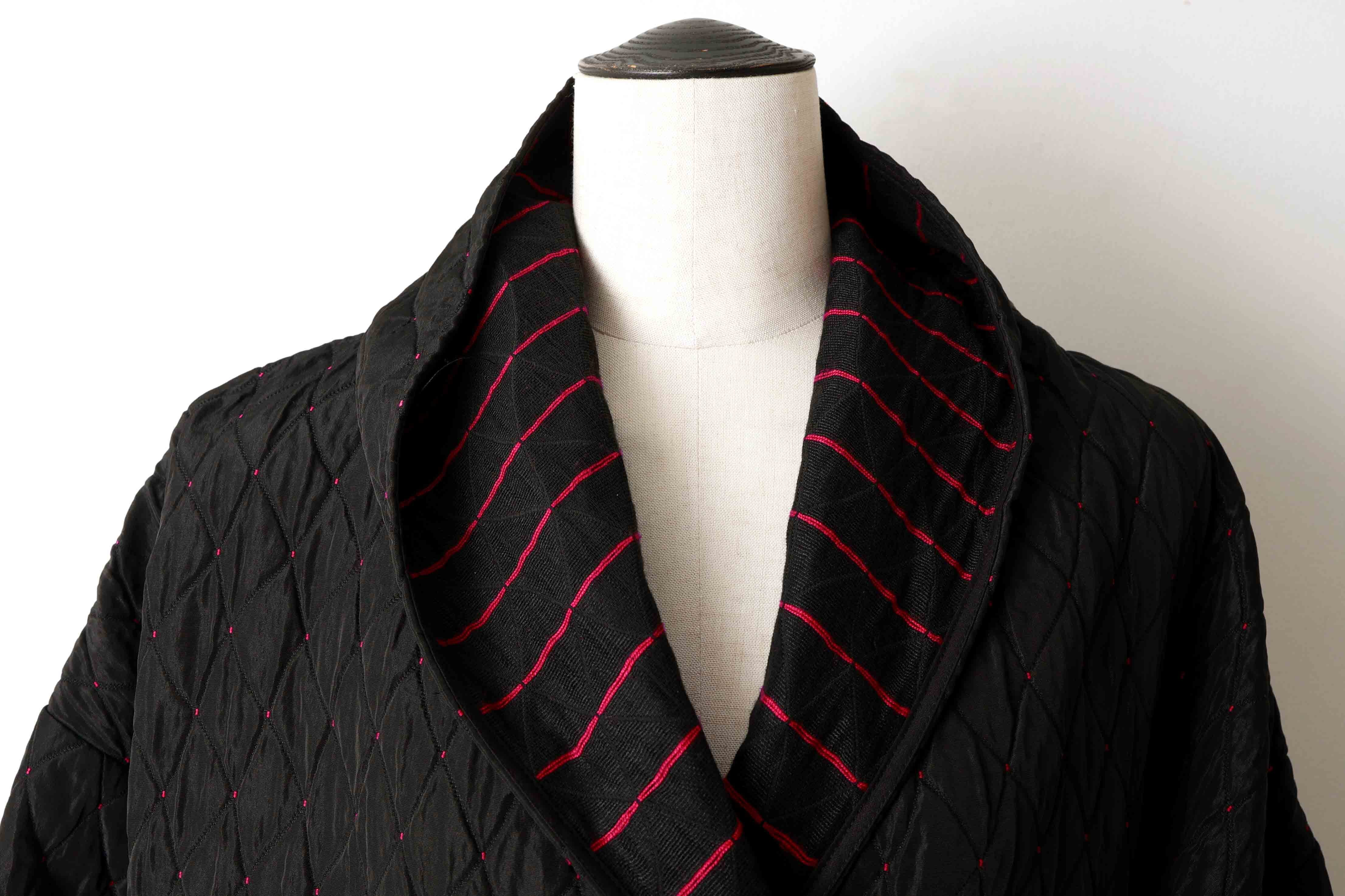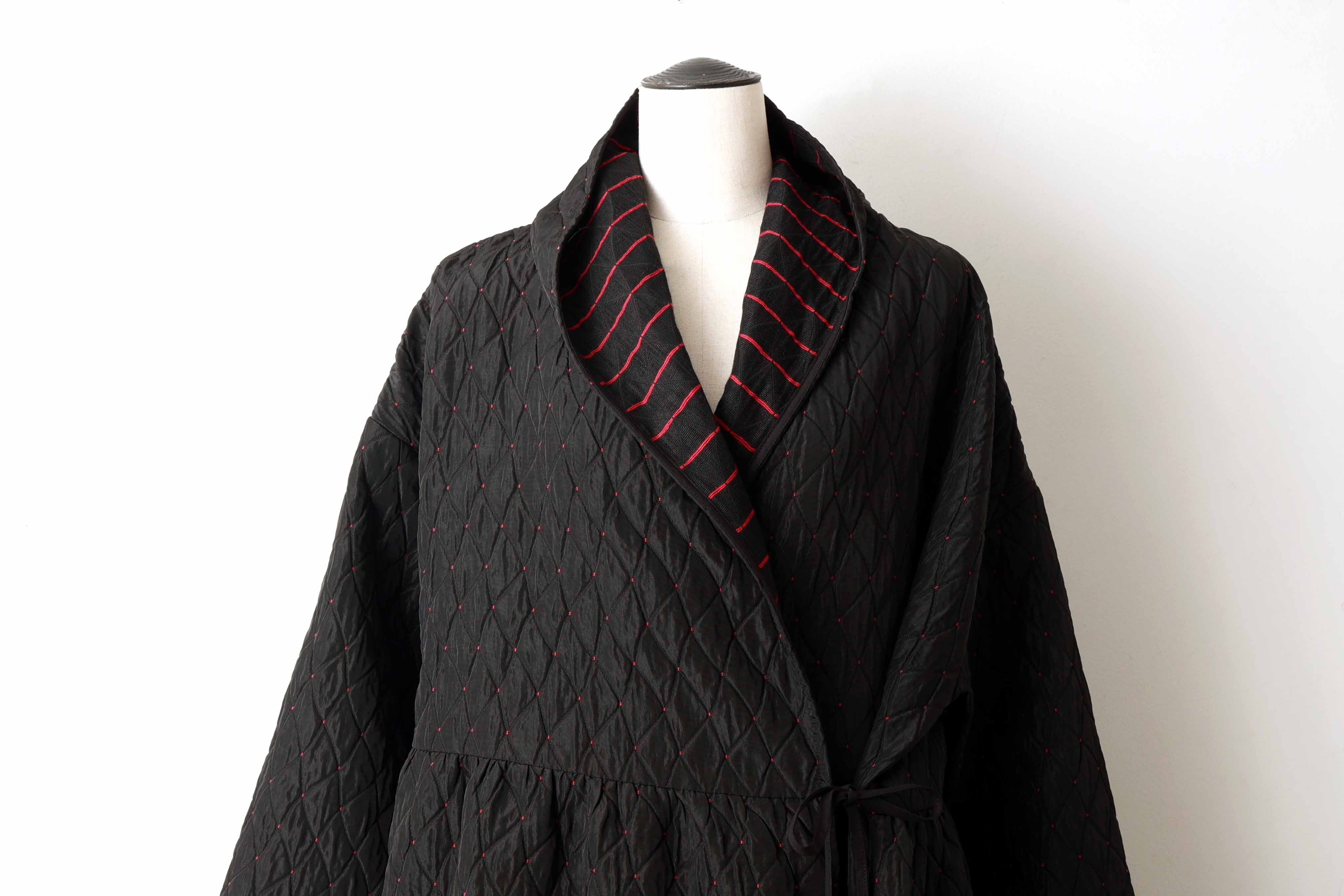 商品説明 | 差し色が素敵なキルティングコートです。 中綿キルティングではなく裏面がジャガード織りで、キルトステッチの生地が使用されています。とても軽い着心地で紐を結ぶ位置や強さで、胸元の開き具合などを調整してお召しいただけます。前を開けて羽織るだけでも、上品な着こなしになり裏地の差し色がチラリと見えてとても素敵です。季節の変わり目など気温調整が難しい時期に活躍する一着です。 |