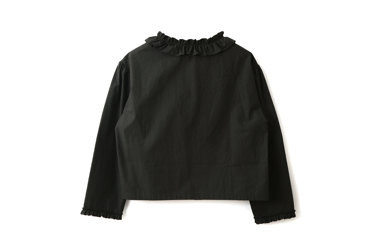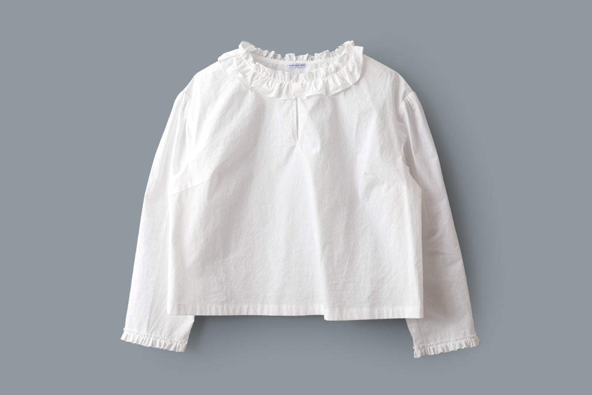 首もとがフリルになったブラウス。ドロップショルダーとゆったりとした身幅が特長です。