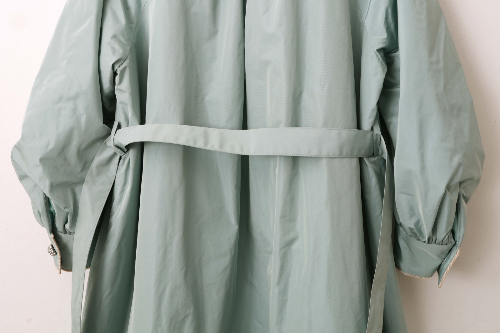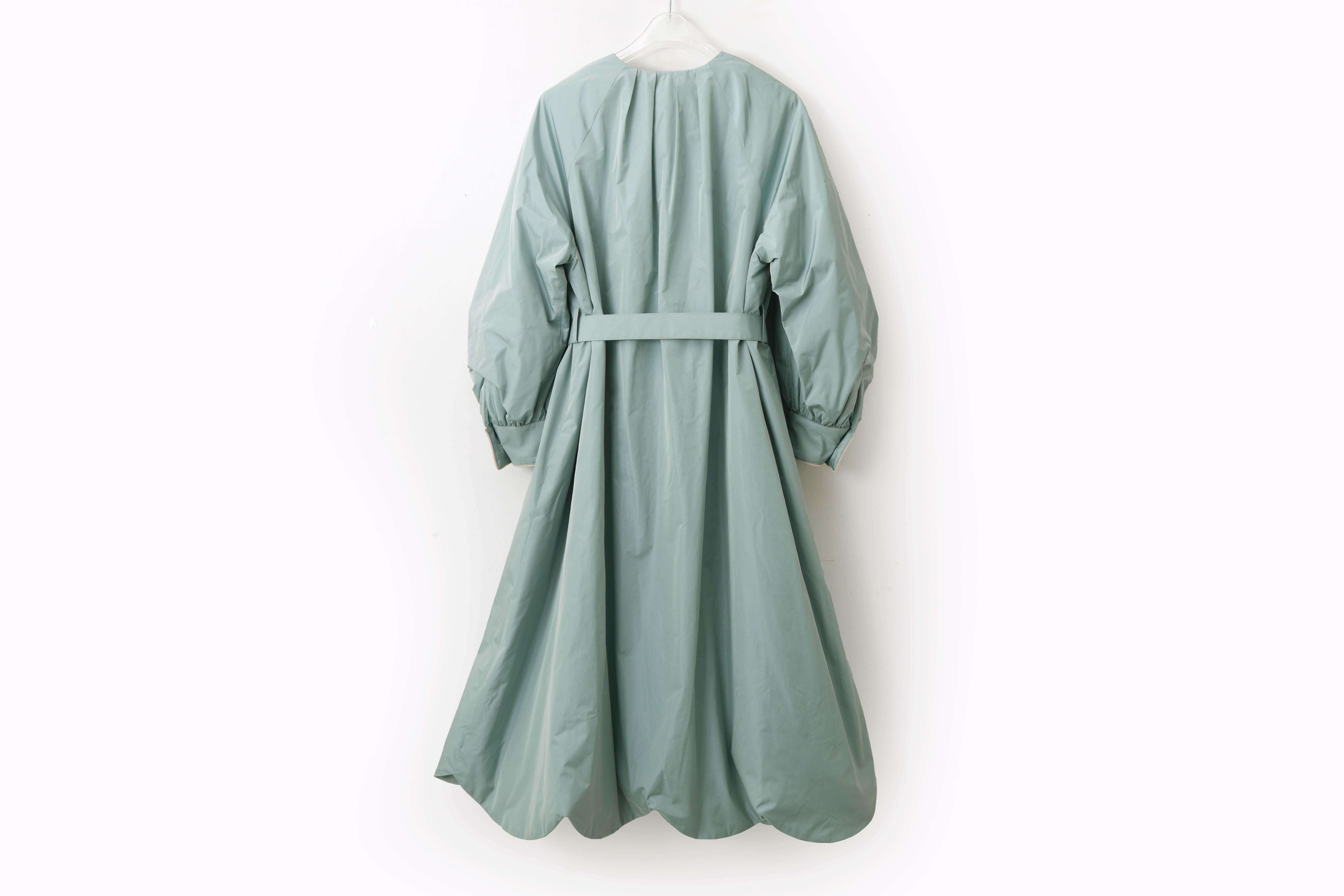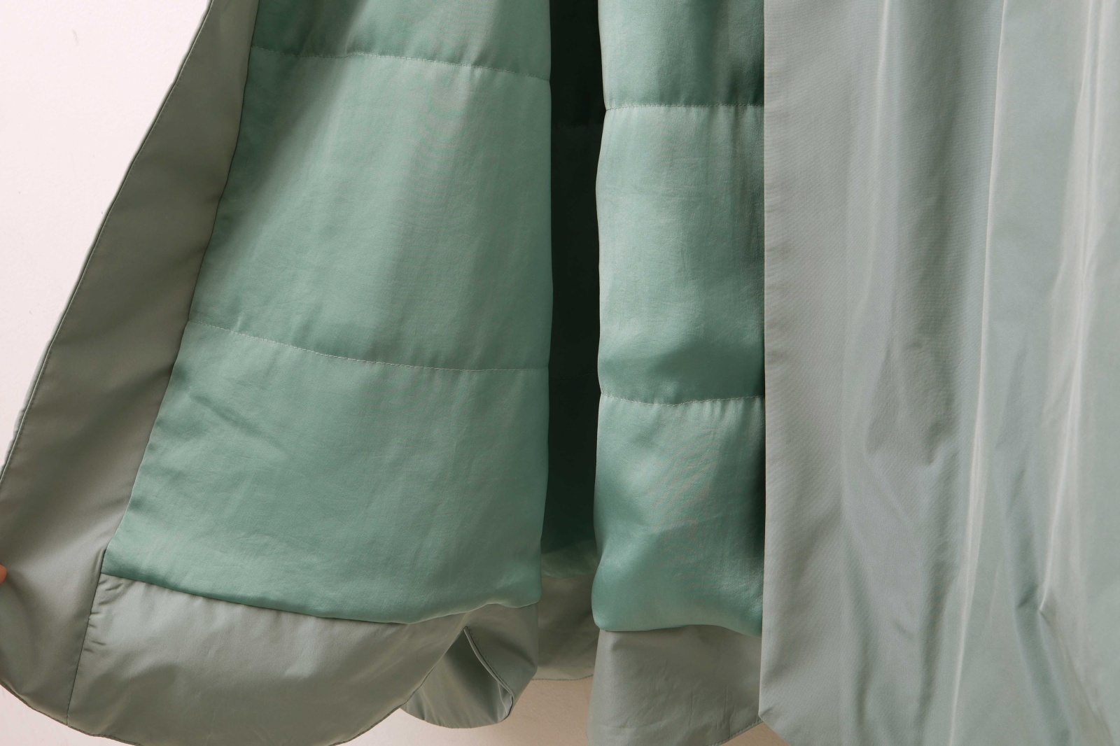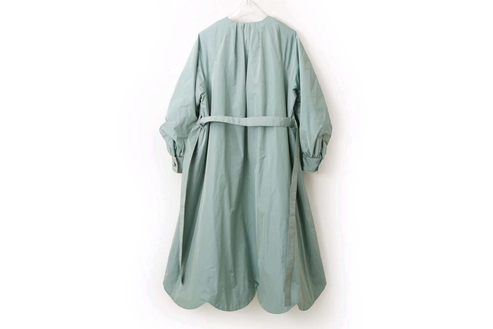 お客様からのご要望にお応えしてキャズエドゥミ別注でロングコートをお作りしていただきました。ロング丈のワンピースやスカートに合わせていただきやすい丈感で、すそのスカラップにこだわり、アンティークのボタンから型取りしたビジューボタンがポイントです。ベルトを外して綺麗めなAラインのシルエットや、ベルトを絞っていただくと腰位置が高くなりスタイルアップが叶うシルエットをお楽しみいただけます。中綿入りで軽くて暖かく、風を通しにくい仕様となっております。