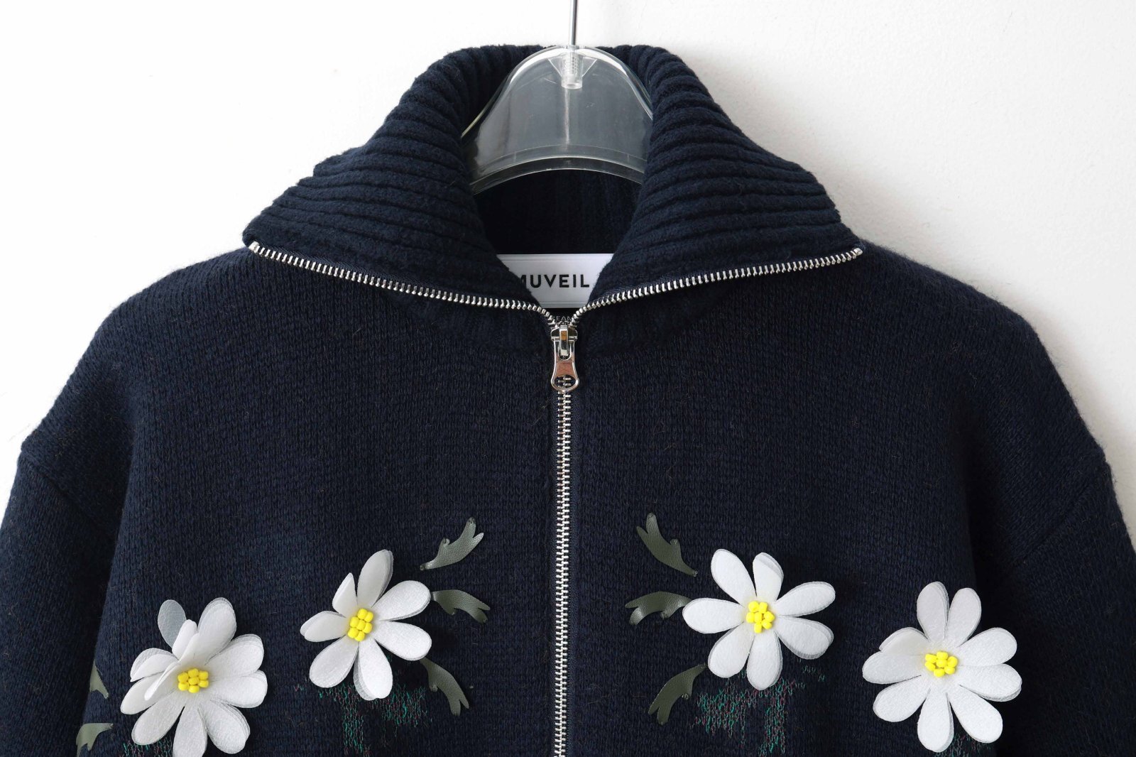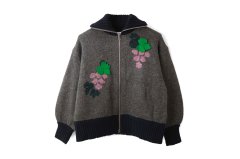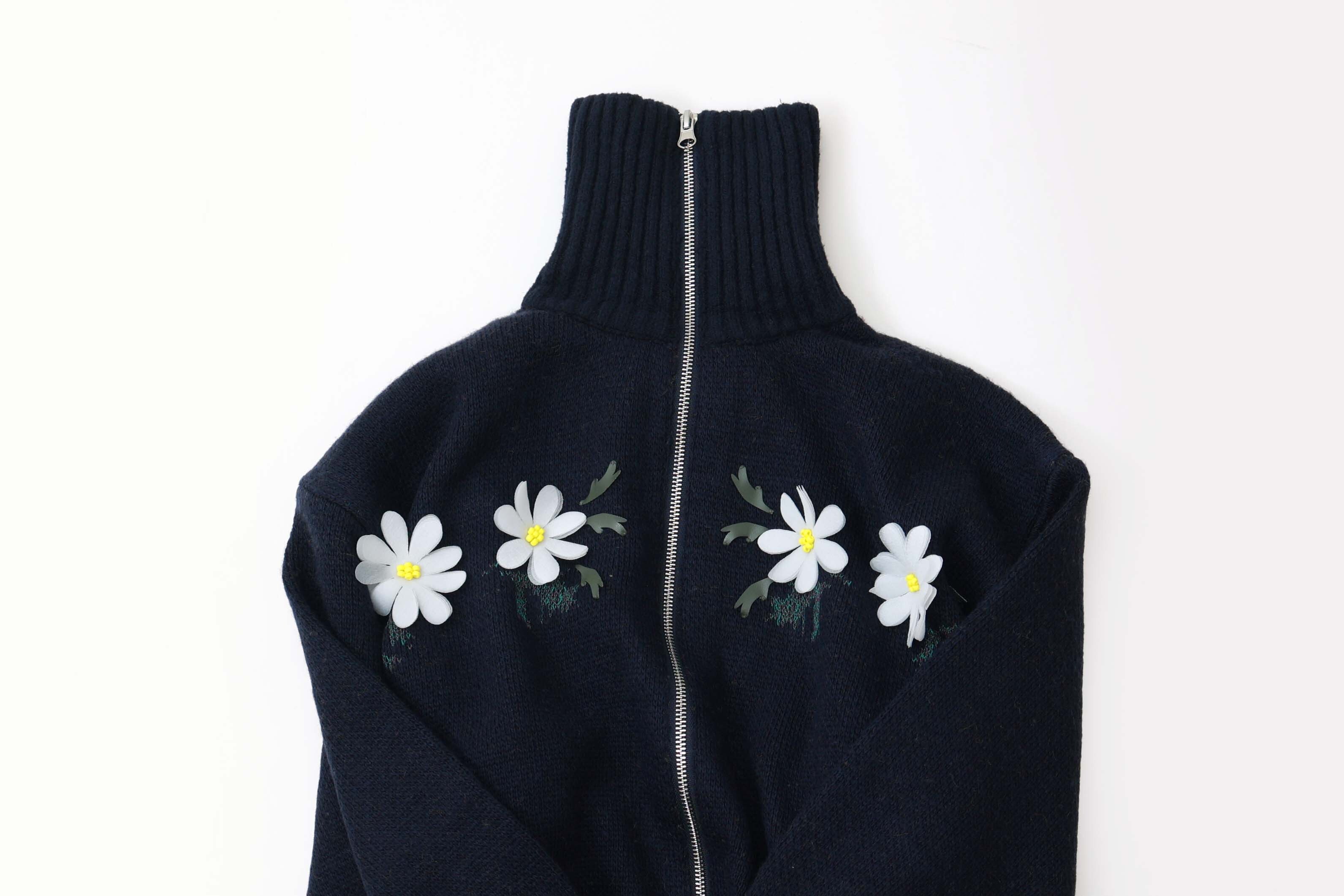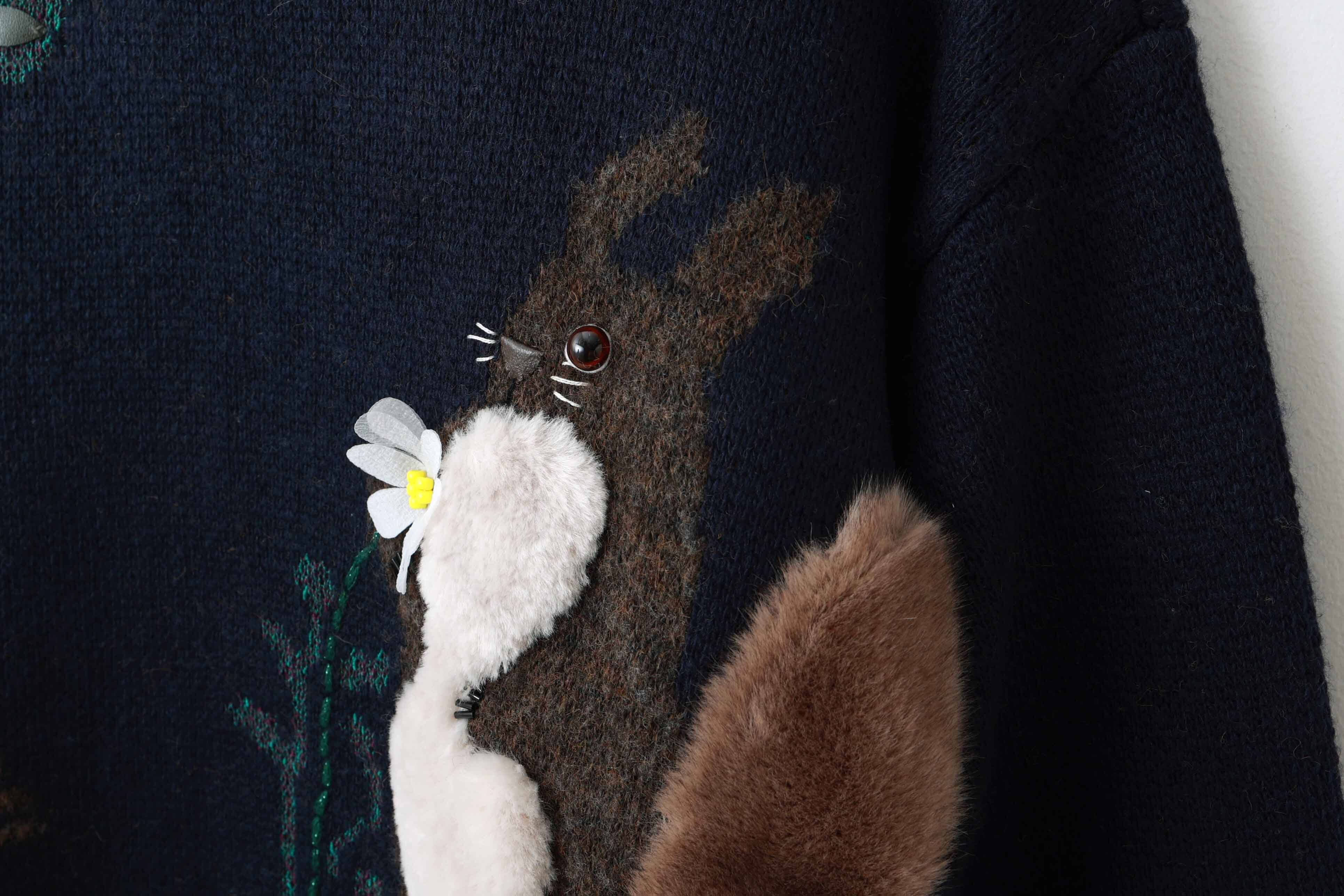 リスとおうちの庭のモチーフをニットで表現されたジップカーディガン。フロント部分にはお花、バック部分にはリスがいるお庭がデザインされています。ビーズやアップリケを手刺繍して表情豊かに仕上げられています。