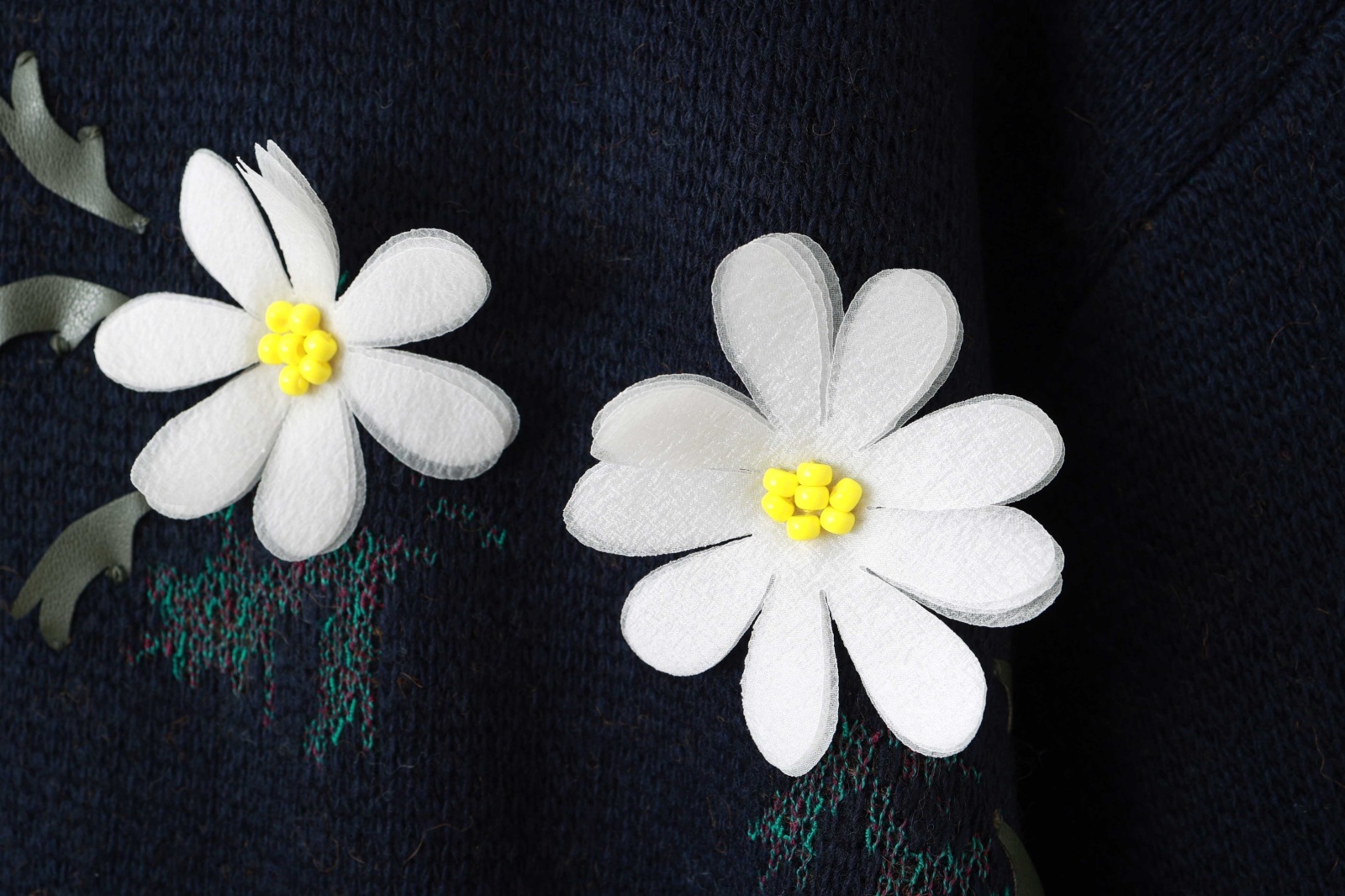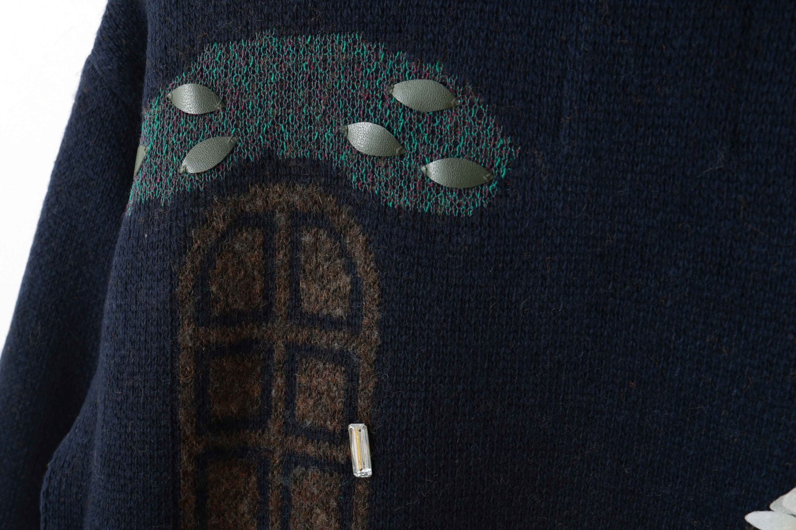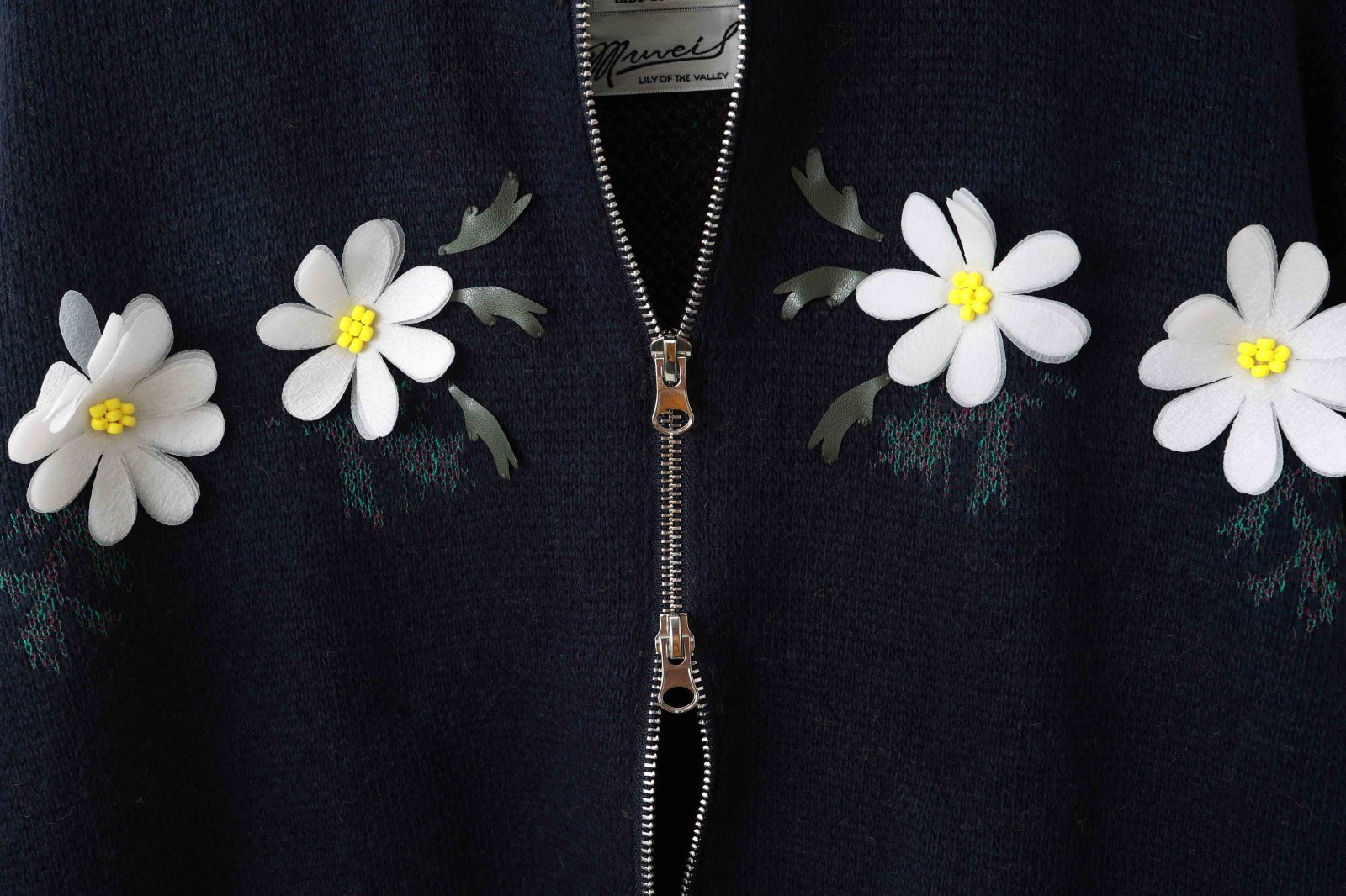 リスとおうちの庭のモチーフをニットで表現されたジップカーディガン。フロント部分にはお花、バック部分にはリスがいるお庭がデザインされています。ビーズやアップリケを手刺繍して表情豊かに仕上げられています。