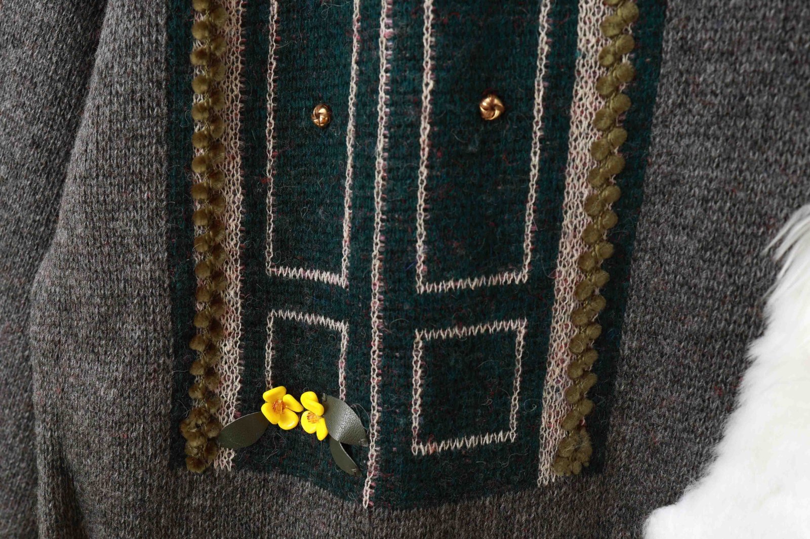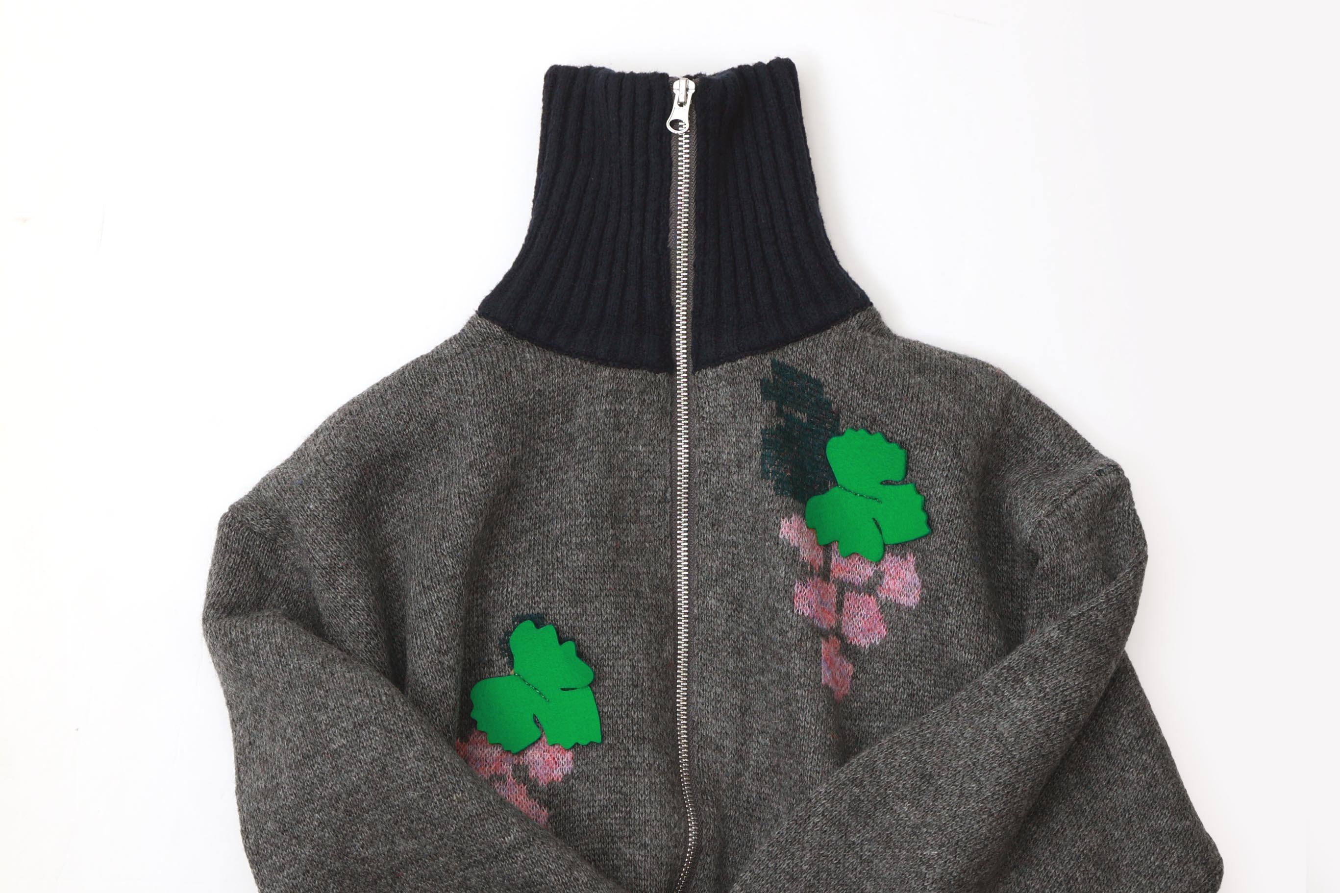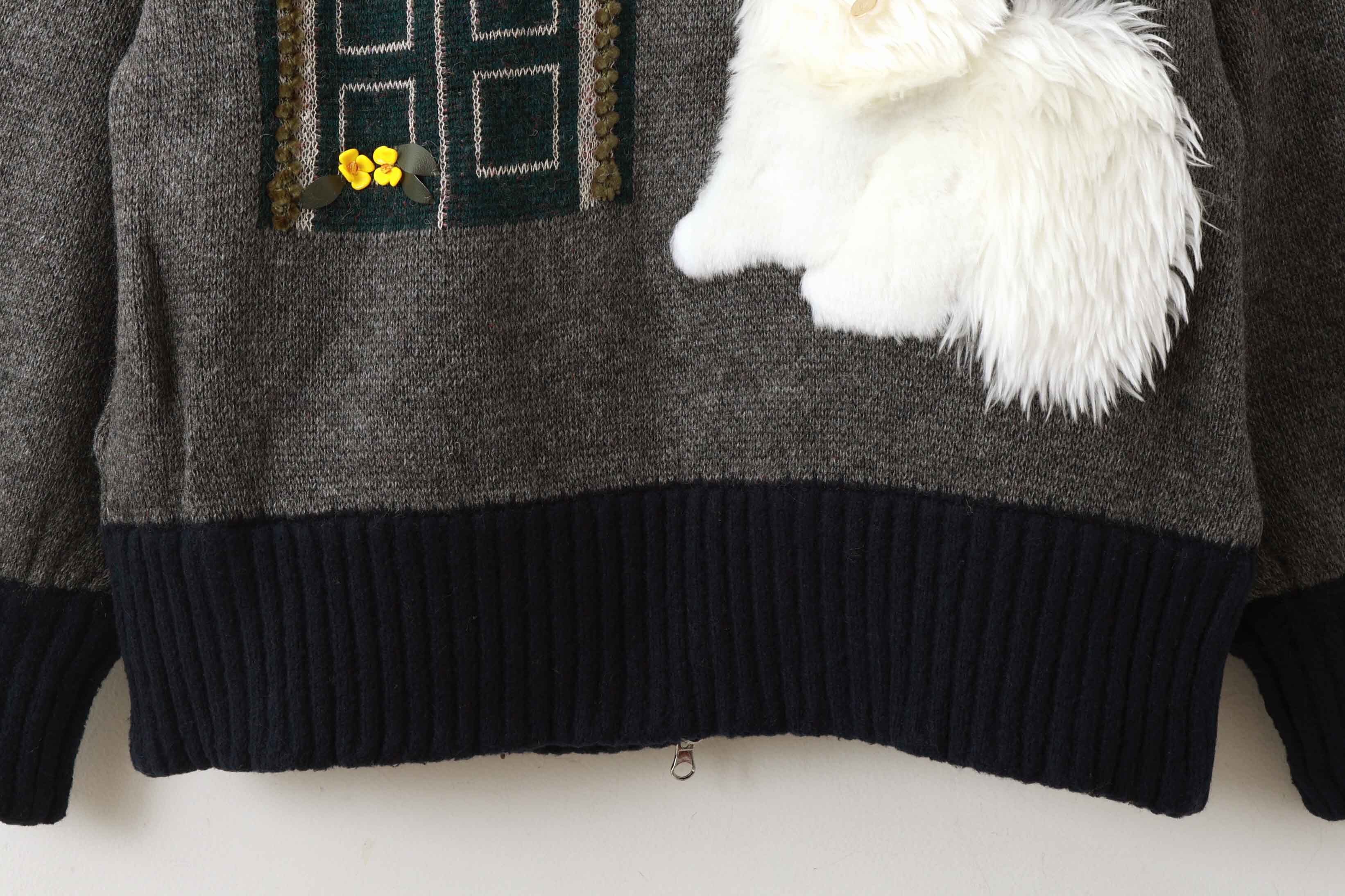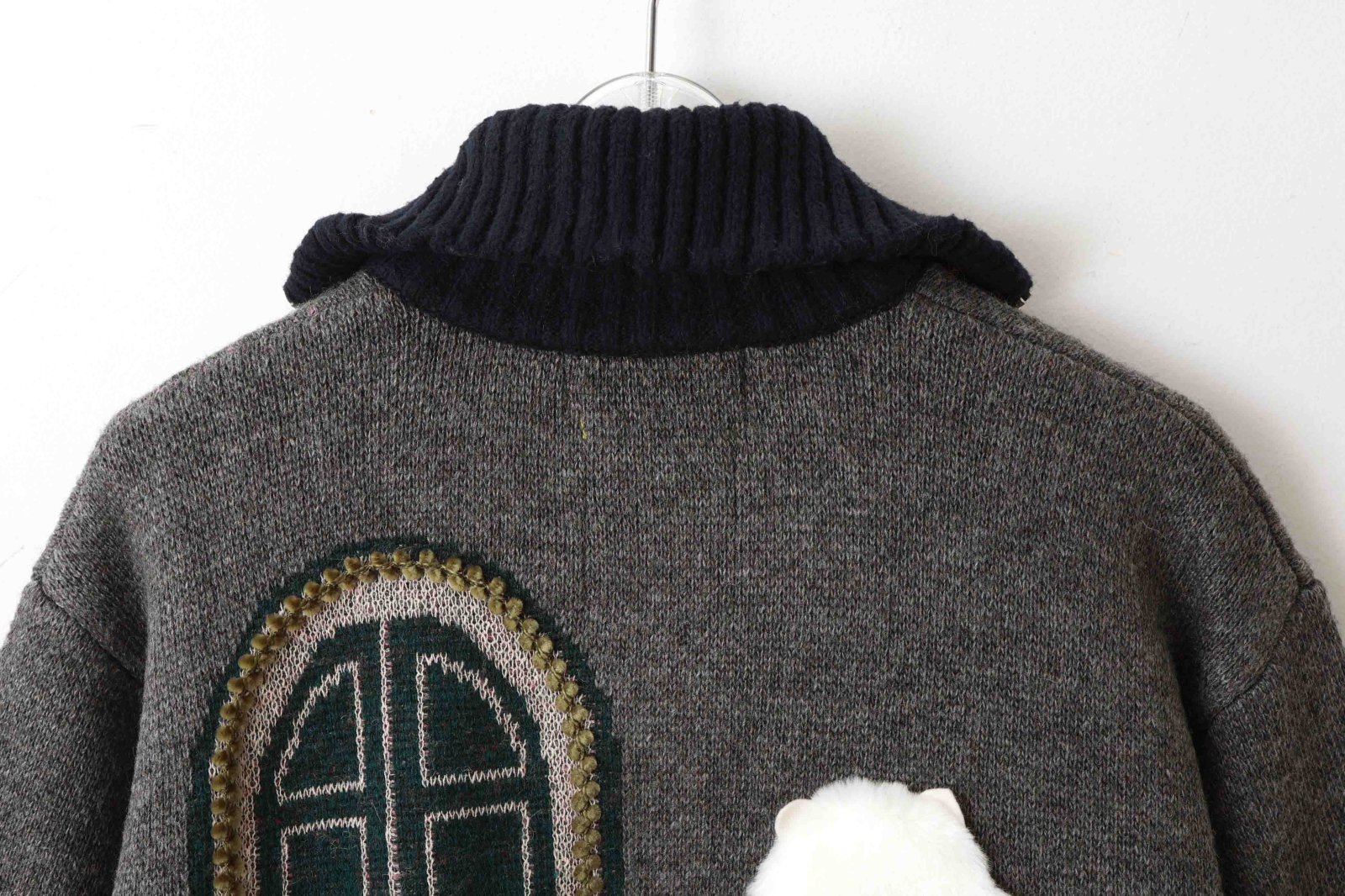 お散歩するイヌのモチーフをニットで表現されたジップカーディガン。フロント部分にはブドウ、バック部分にはイヌのお散歩風景がデザインされています。ビーズやファーアップリケを手刺繍して表情豊かに仕上げられています。