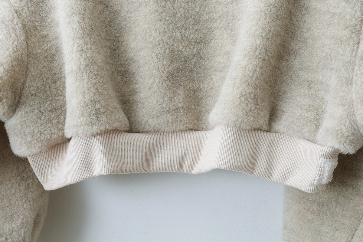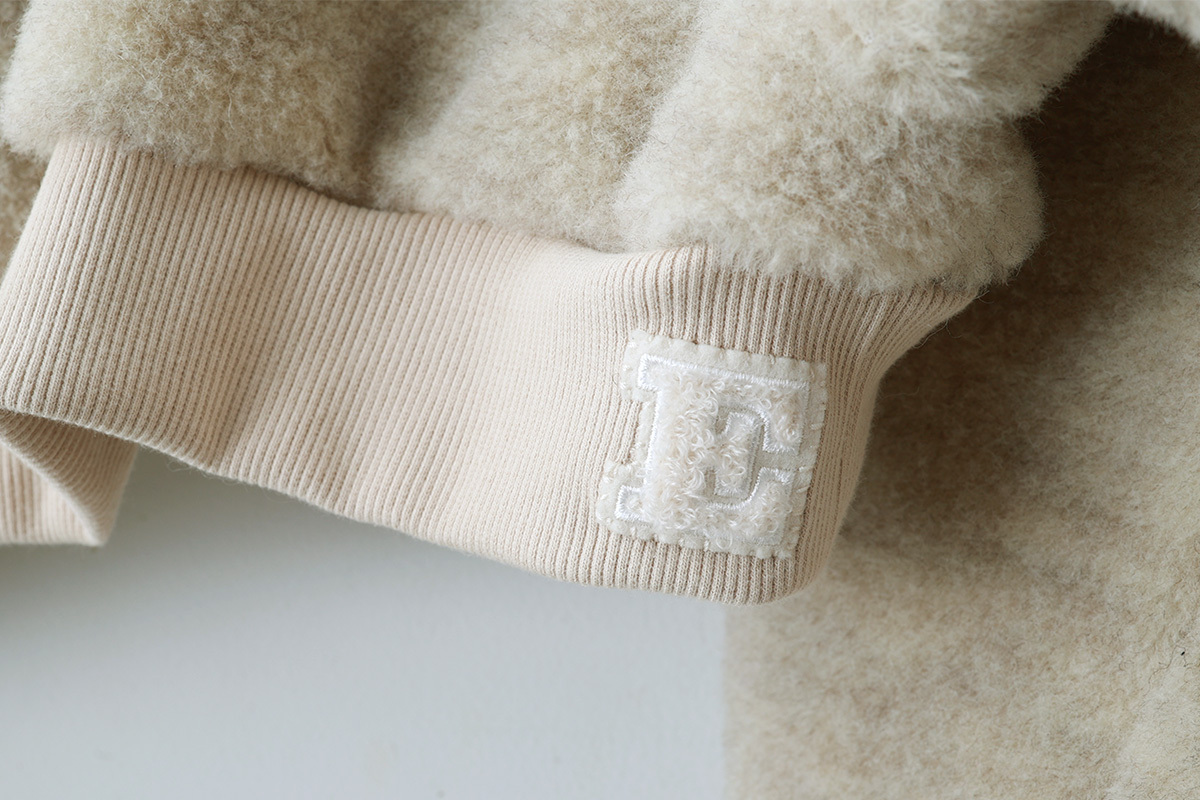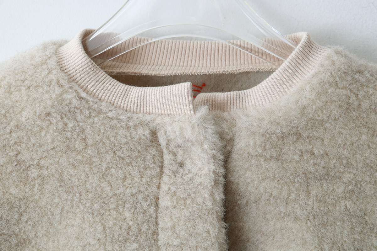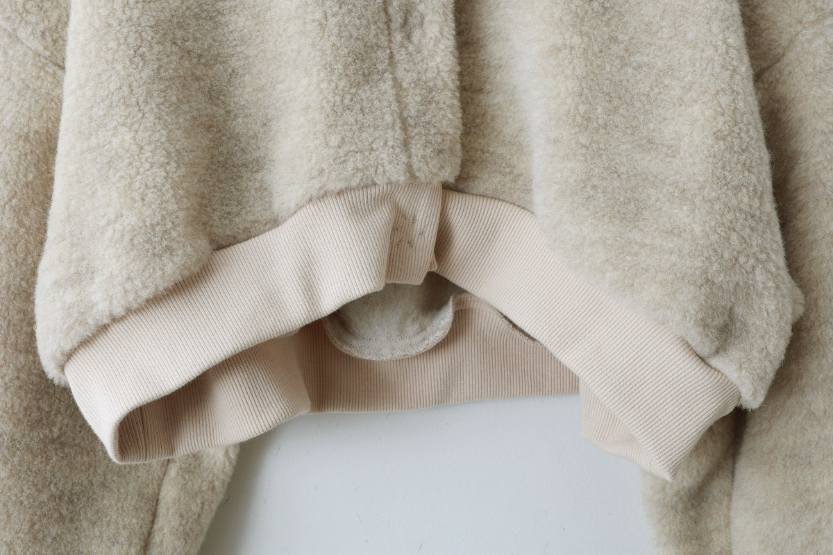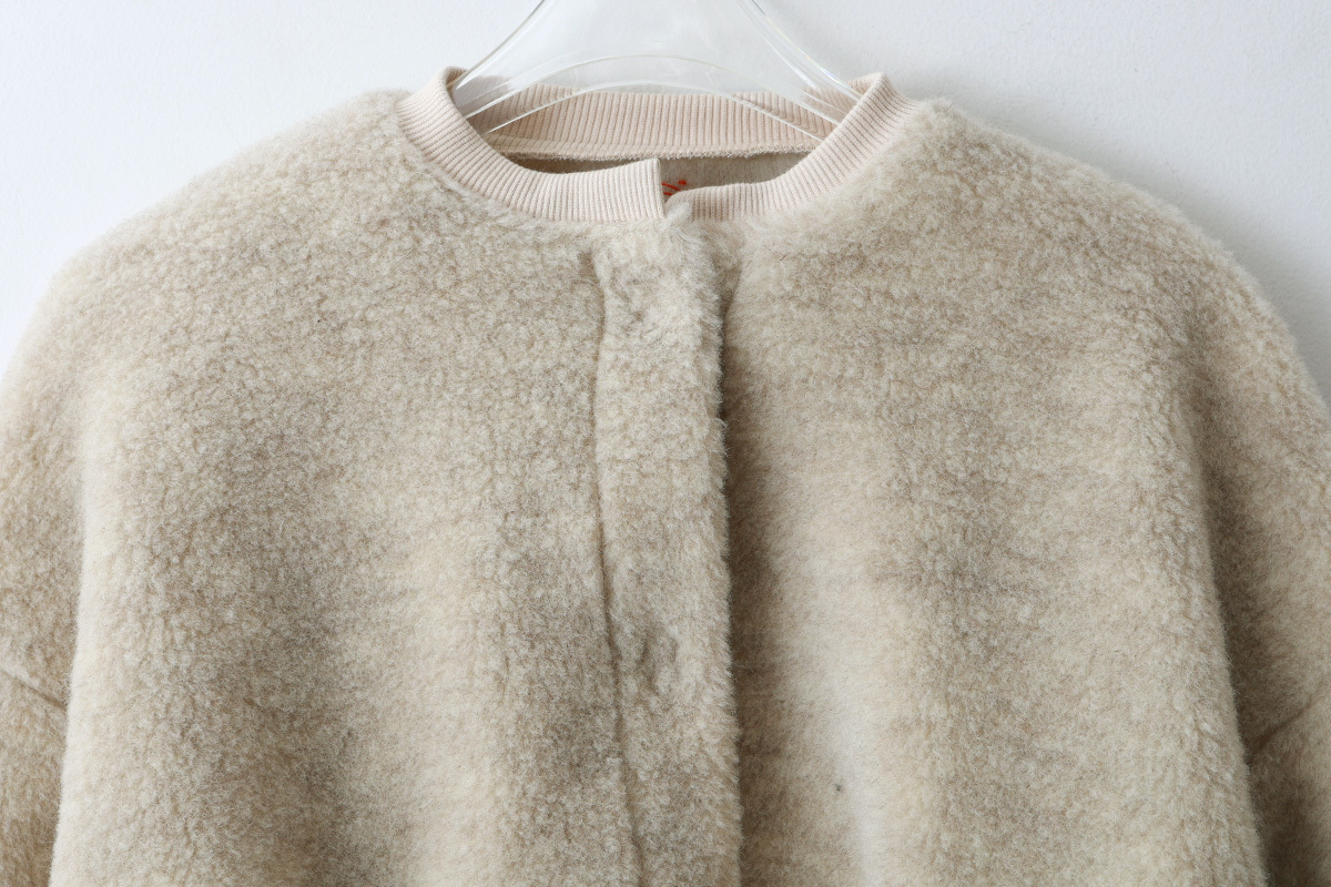 | 商品説明 | 毛100%のボアと綿100%のフライスで作られたショート丈カーディガン。 化学染料を一切使用せず自然環境に配慮して作られています。 ボレロのように着丈が短いので、ロング丈ブラウスやワンピース、サロペットの羽織におすすめです。たっぷりとした袖がかわいい。袖口はサムホール付きなので、寒い季節の防寒になります。 裾には、「E」の文字のワッペンがついています。 |