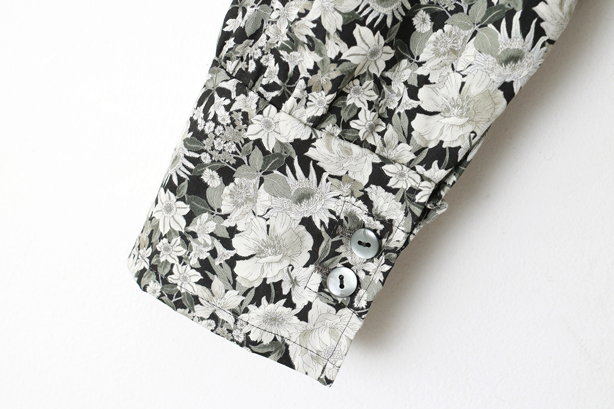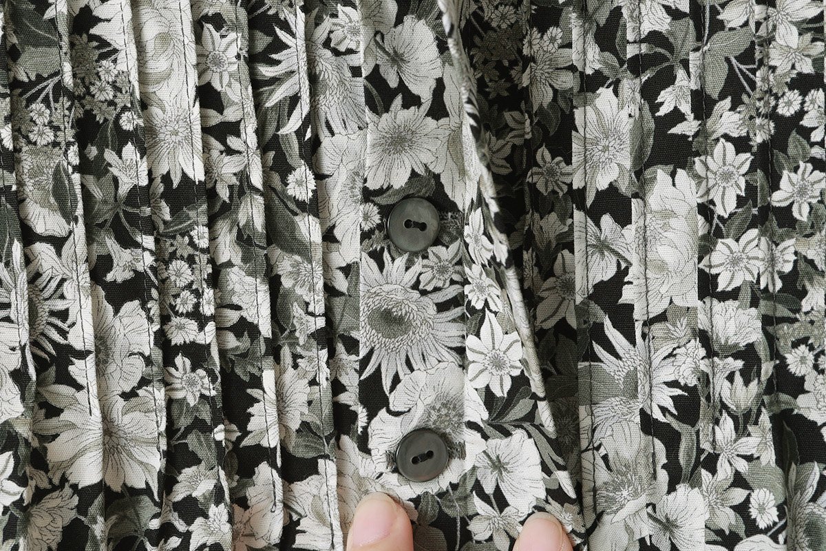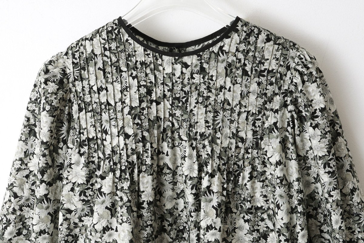 YAB-YUM定番のスカルプターワンピース。古い時代の彫刻家からインスパイアされた、前後の胸元に繊細なピンタックが並んだロング丈のワンピースです。後ろ開きでワンピースとして、前開きで羽織物としてもお召しいただけます。今シーズンはYAB-YUMでは新鮮な小花柄、衿の黒いパイピングがアクセントになっています。