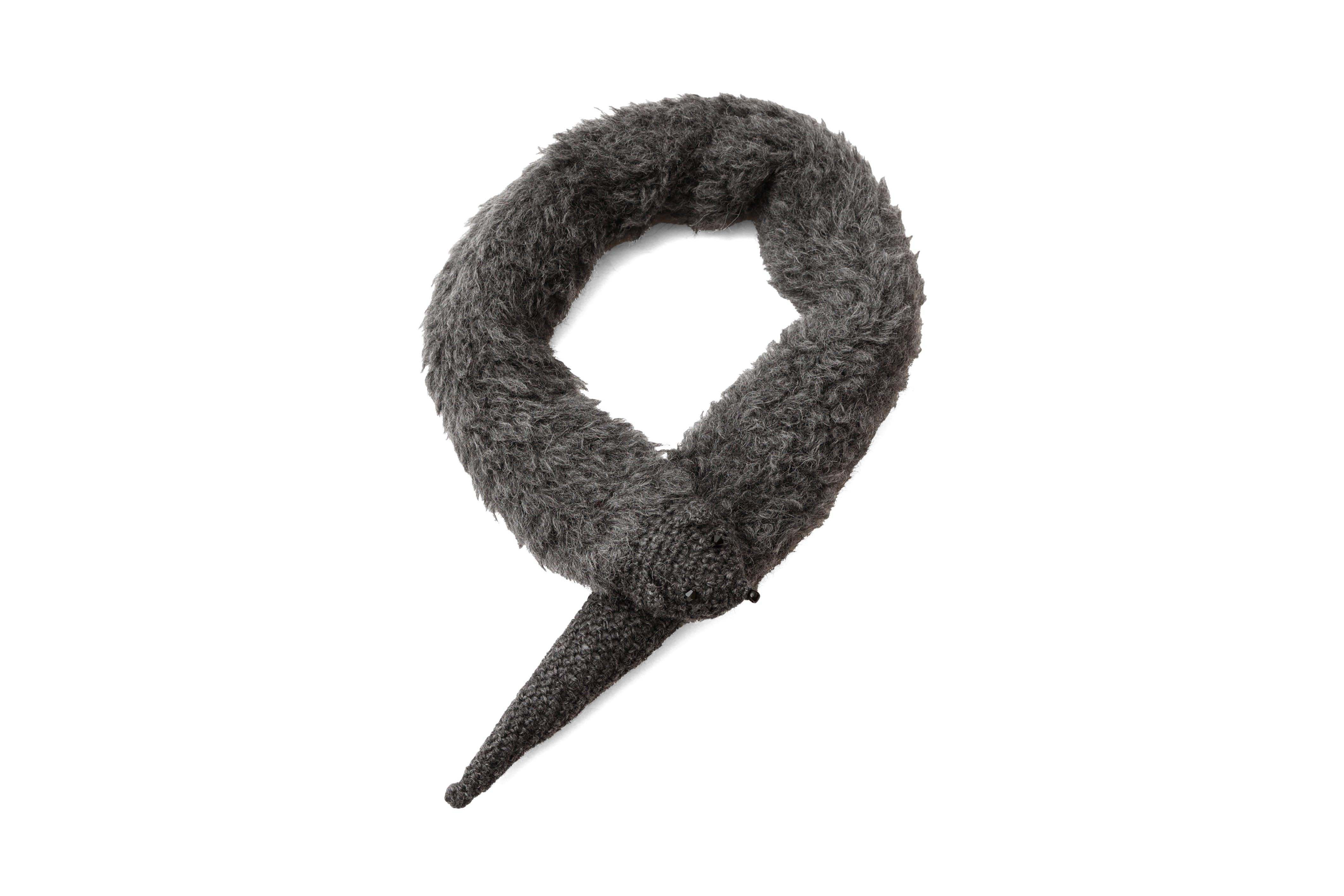 しっぽの部分をくわえて留めるデザインがかわいらしいショートタイプのキツネのマフラー。今シーズンはアルパカシャギーニット素材。目と鼻は小さなビーズが。頭としっぽは毛糸で編まれています。