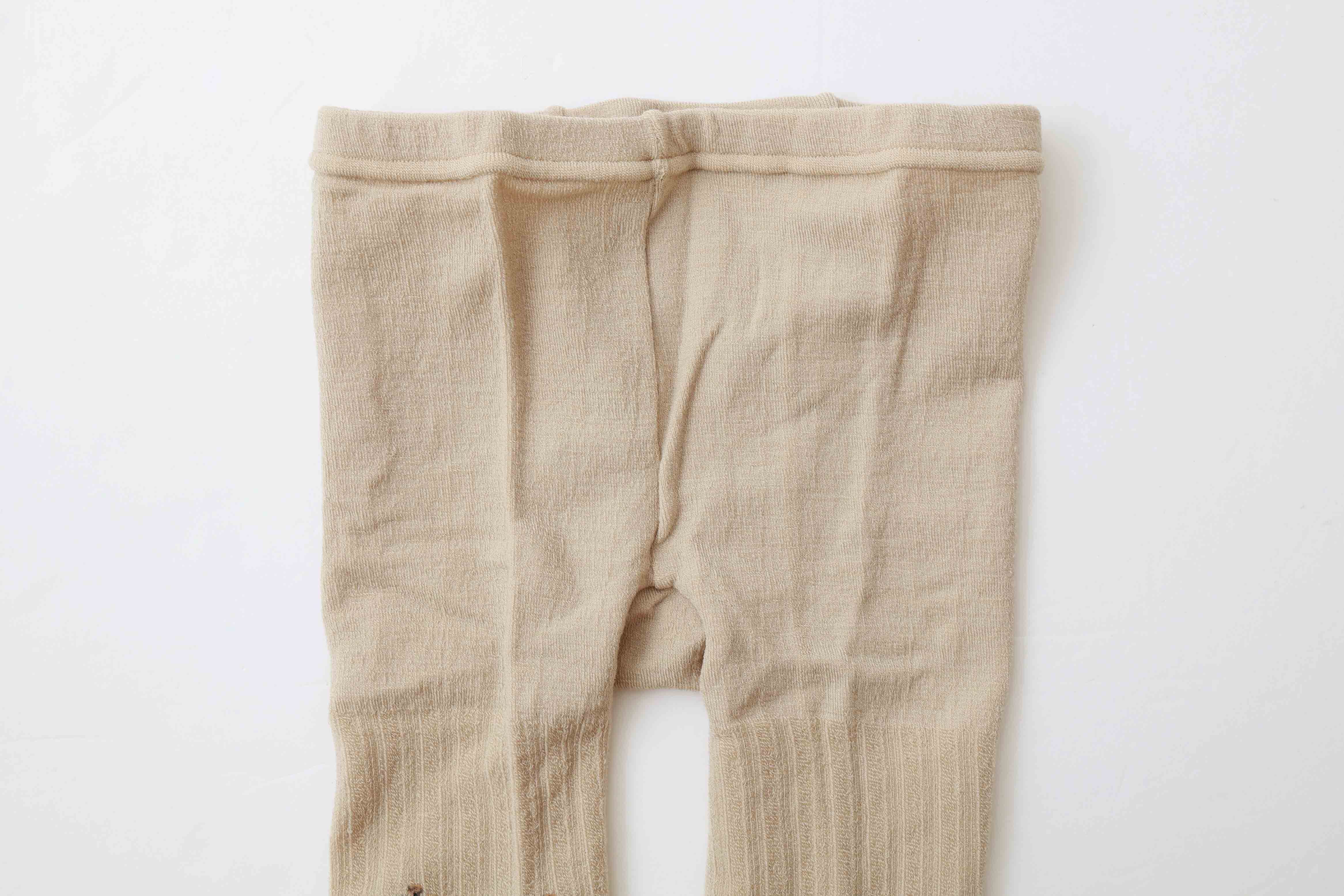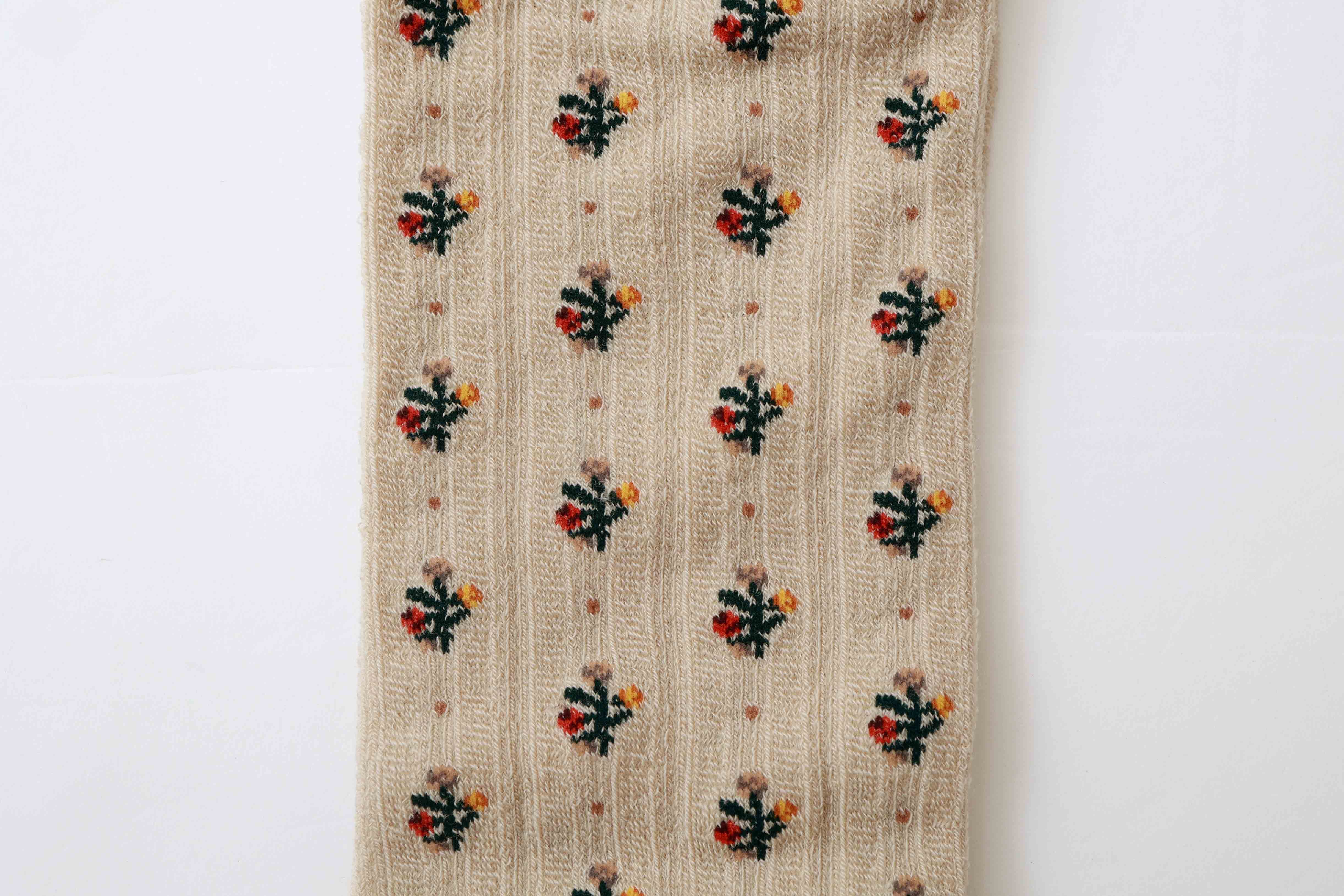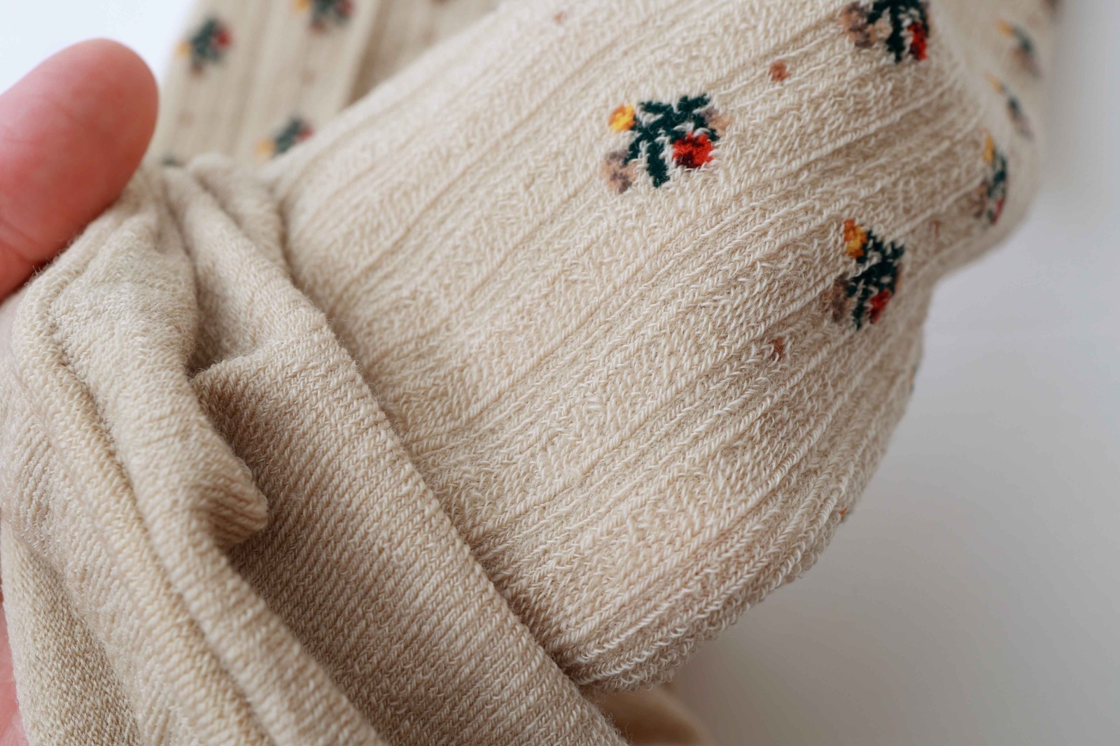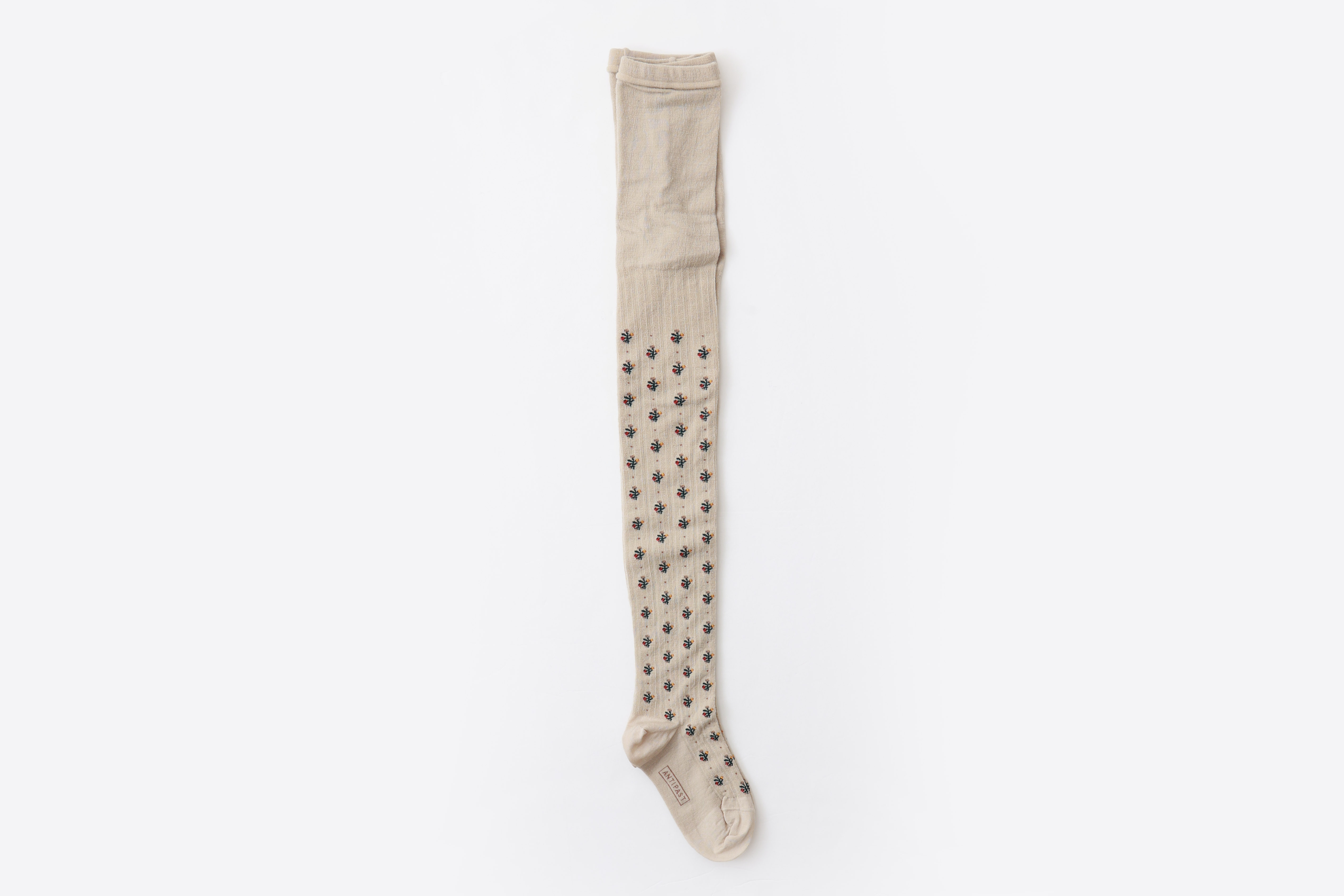 ストライプの編地に小花柄がデザインされたウール素材のタイツ。