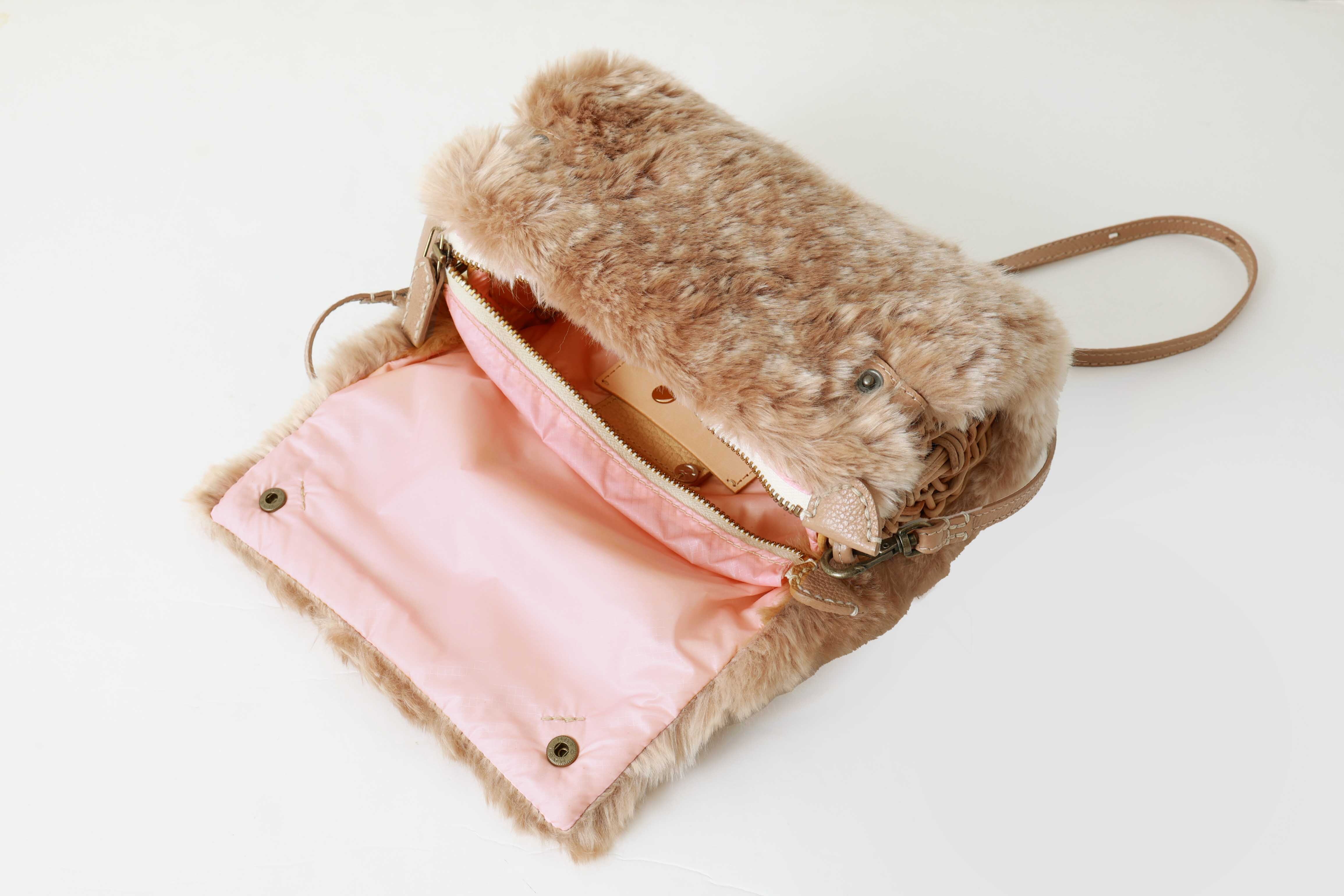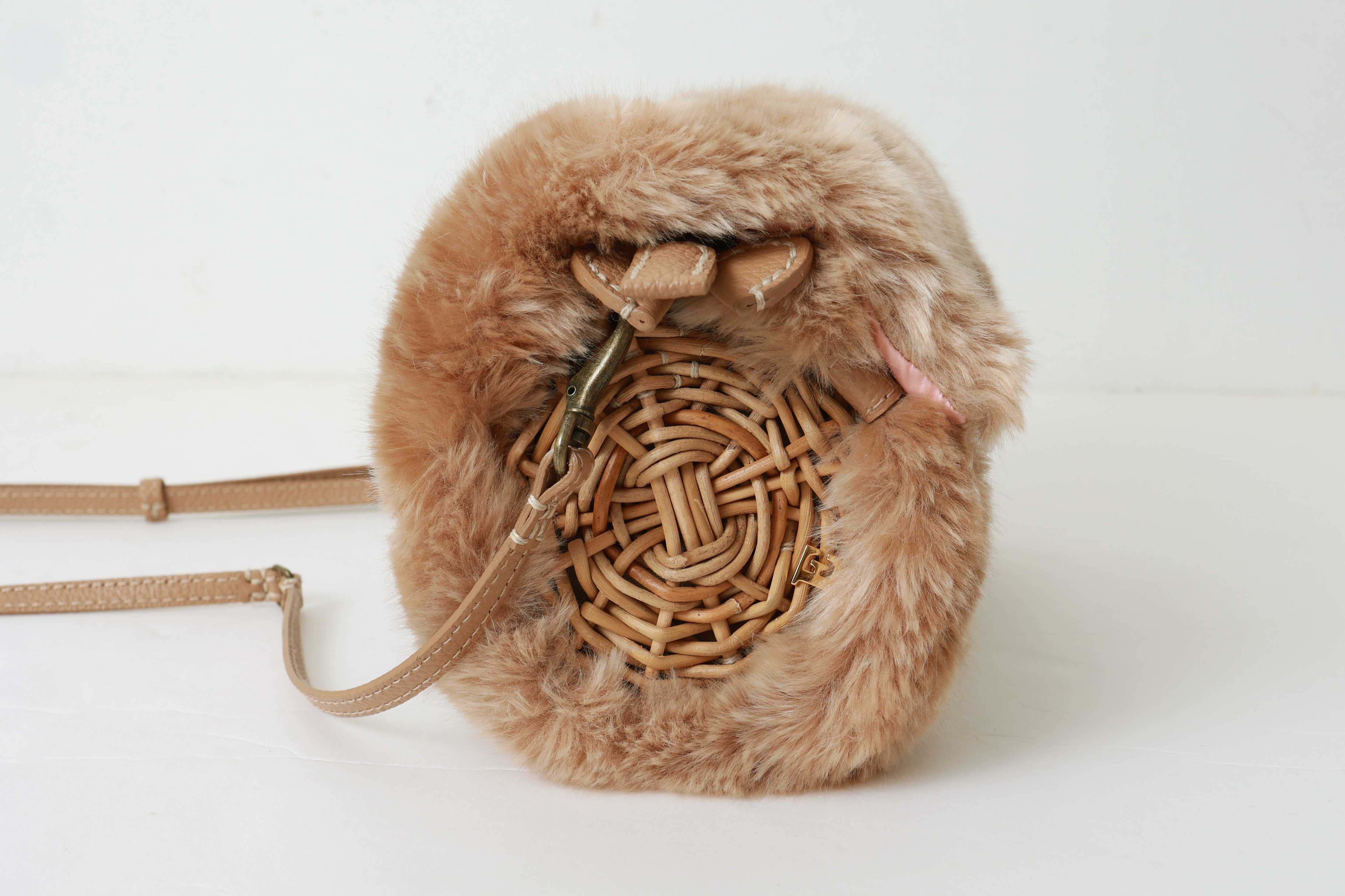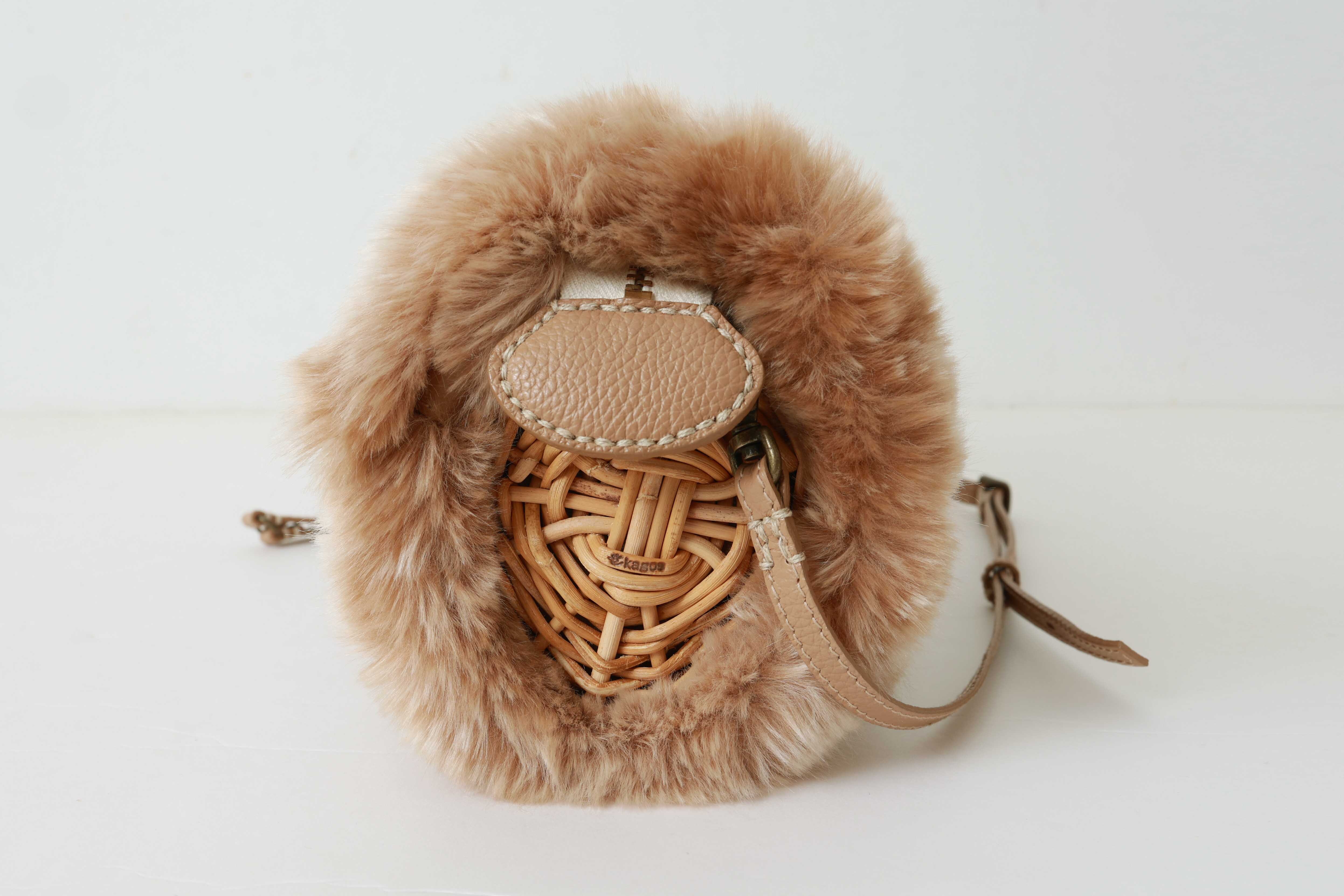 | 商品説明 | アクリル100%のバンビ柄のエコファーが使用されたロールケーキのようなバッグです。フェイクファーからちらりと覗くサイドの紅籐が素敵です。ショルダー紐は、取り外し可能で長さの調整もしていただける仕様となっております。 |