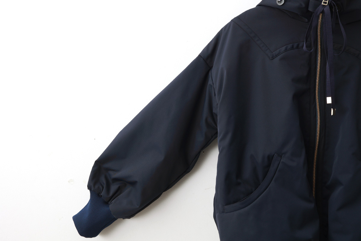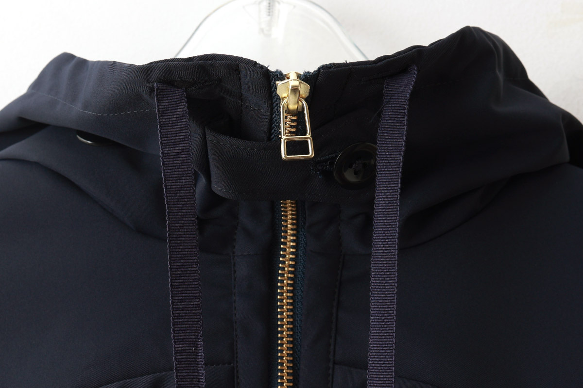 ふんわりとした丸みのあるシルエットのブルゾンです。フード留めボタンが付いていてフードが立ち上がるので風よけに便利です。中綿で軽くてあたたかな着心地。