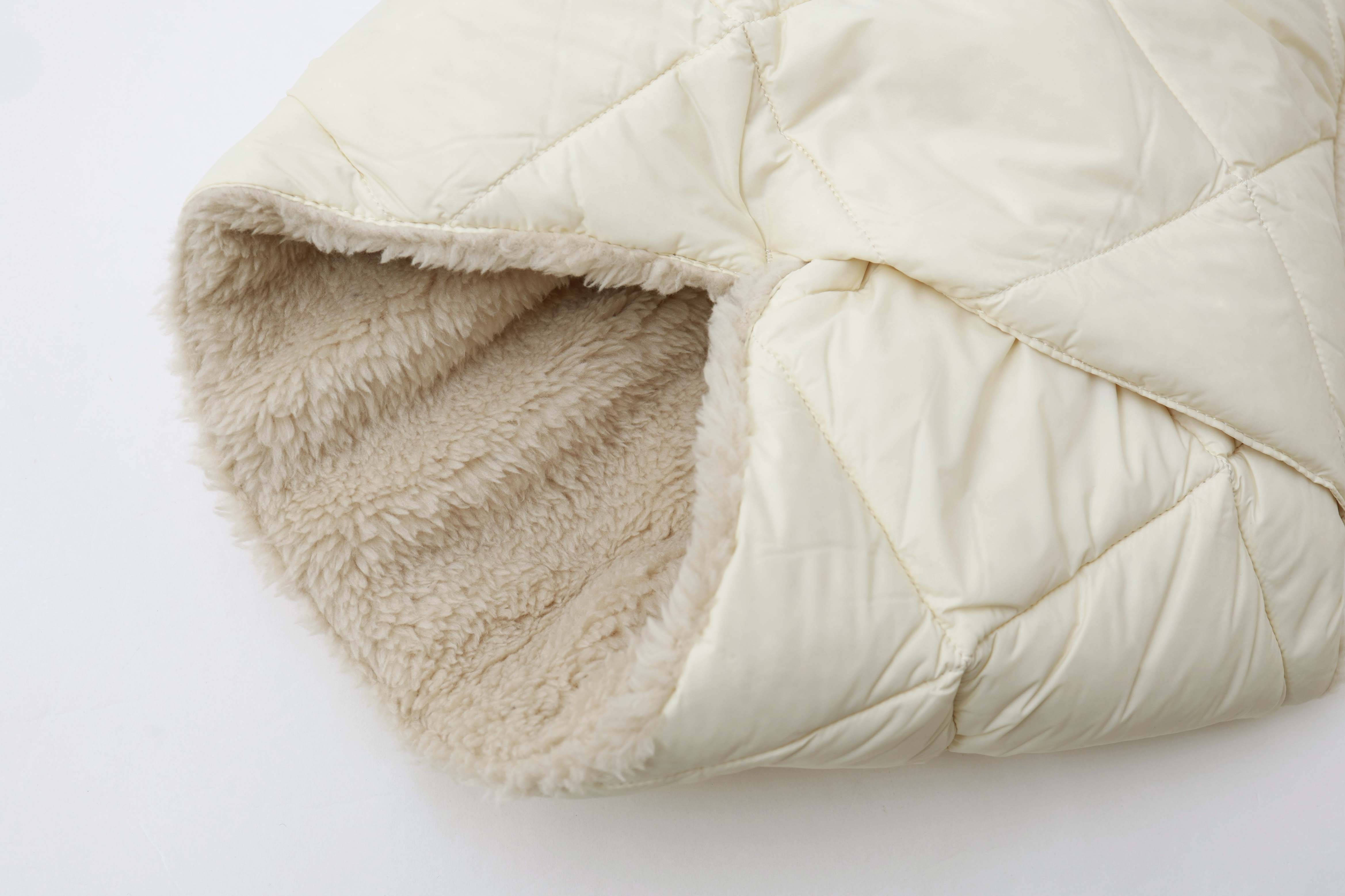 肌触り良い柔らかな生地に、保温性に優れた800FPダウンが使用され、ダイヤキルトステッチで上品に仕上げられています。