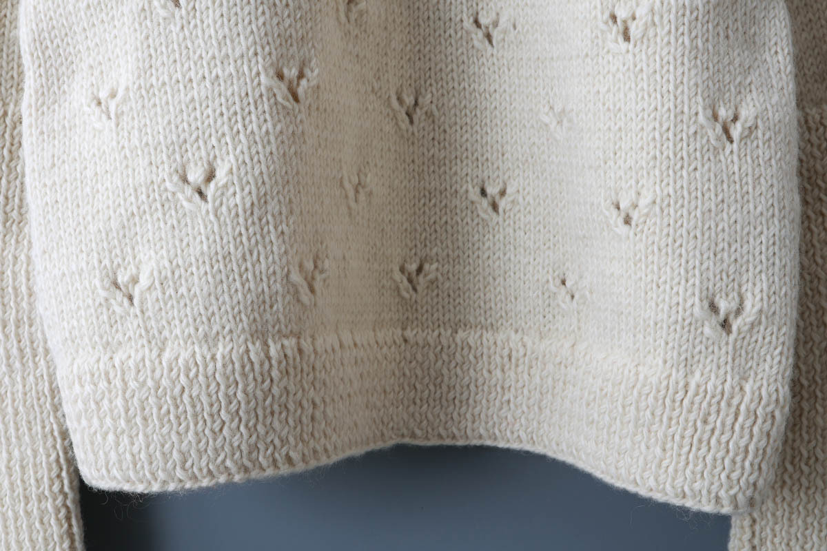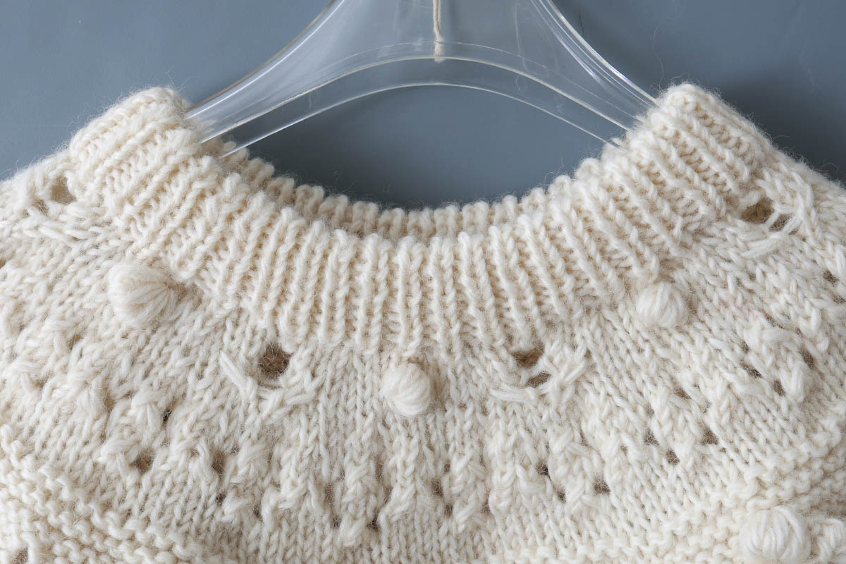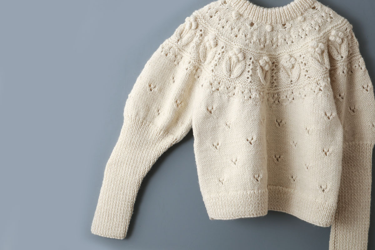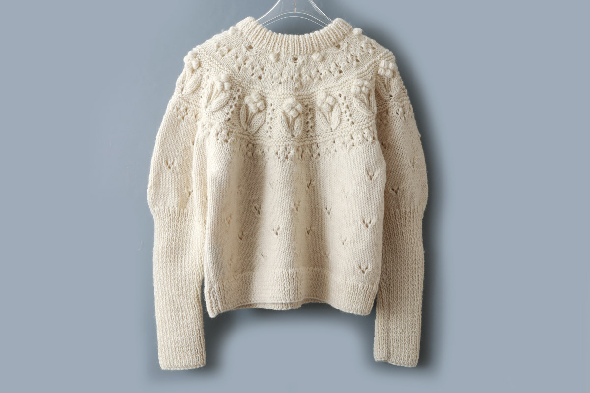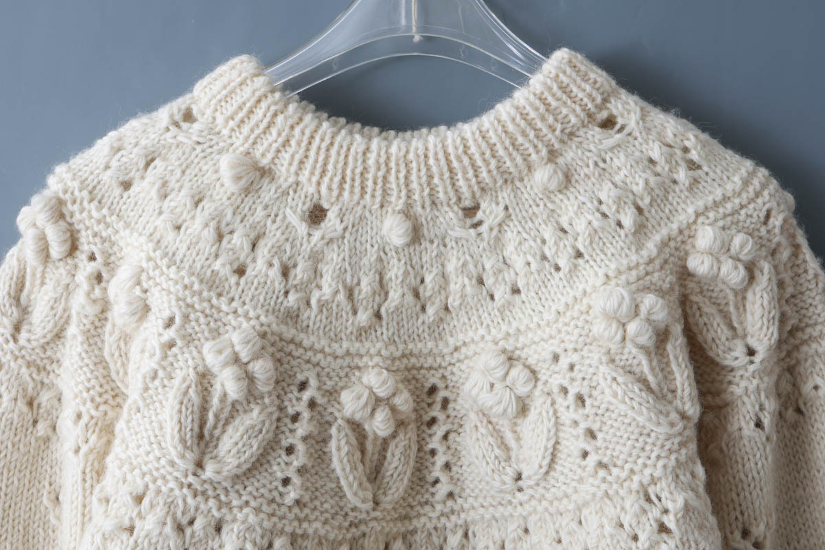 ぽこぽことした立体的な編みや透かしなどさまざまな編地が組み合わされたノスタルジックな求心ニット。