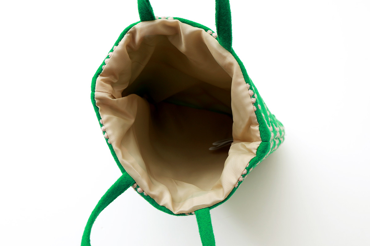 | サイズ | 上辺22cm 下辺18.5cm 縦24cm マチ巾3.5cm 持ち手26cm |