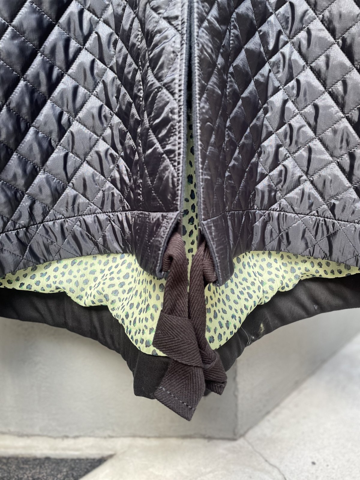 中わた入りのキルティングコート。ちらっと見える裏地にはかわいいアニマル柄が施されています。首元にはボアが付いており、防寒力も抜群です。ウエストと裾についたドローコードを引っ張ると、また違ったシルエットがお楽しみいただけます。裏返しての着用もおすすめです。