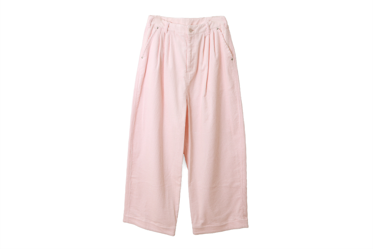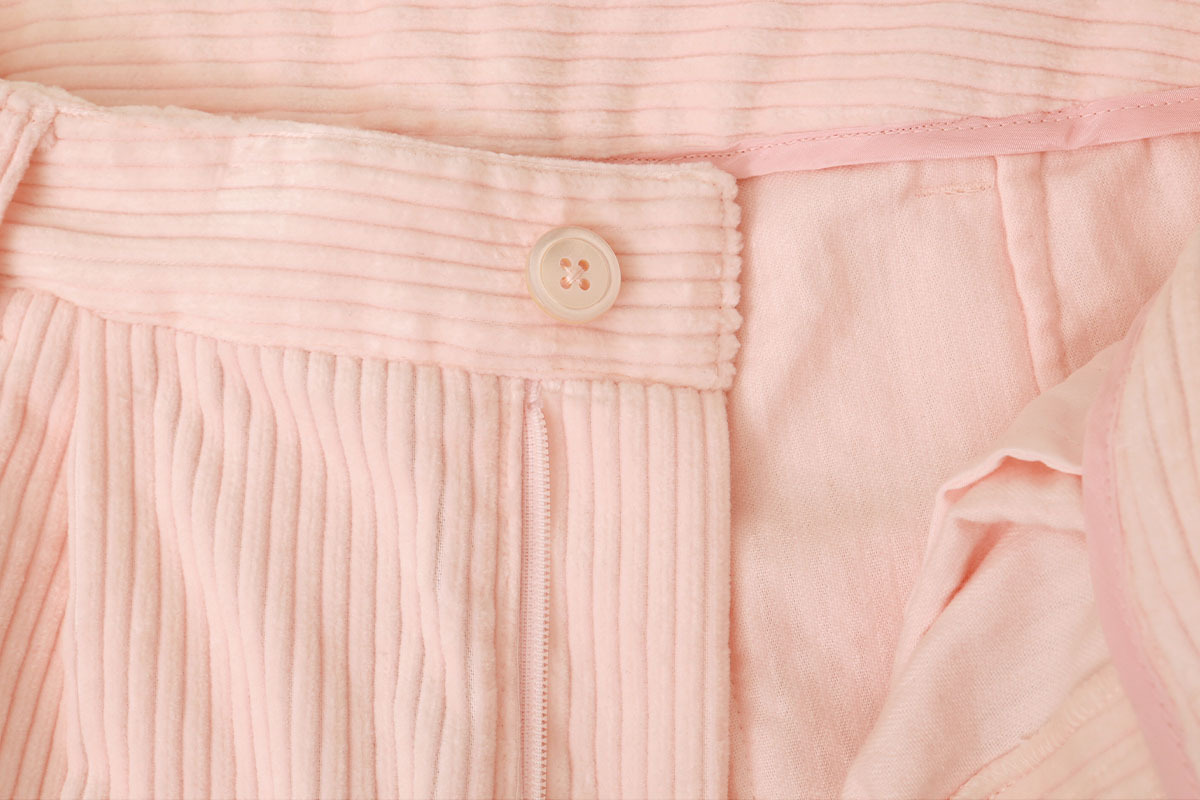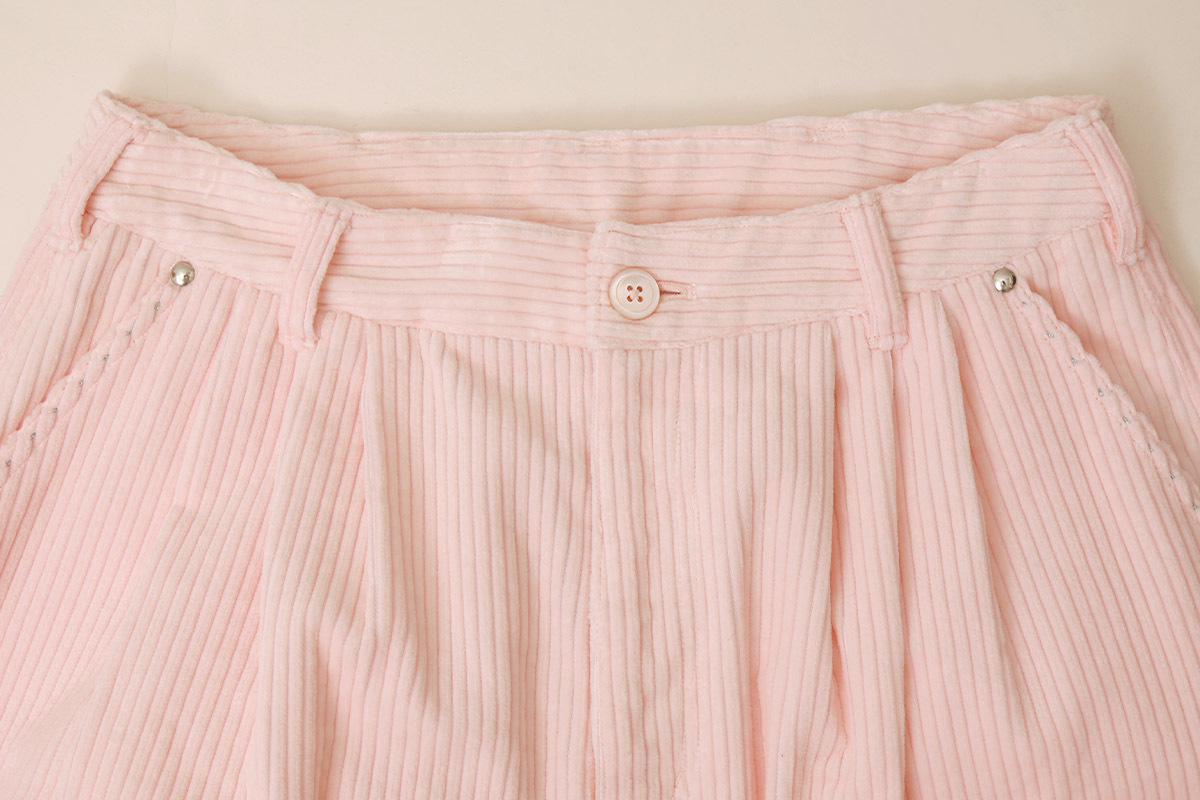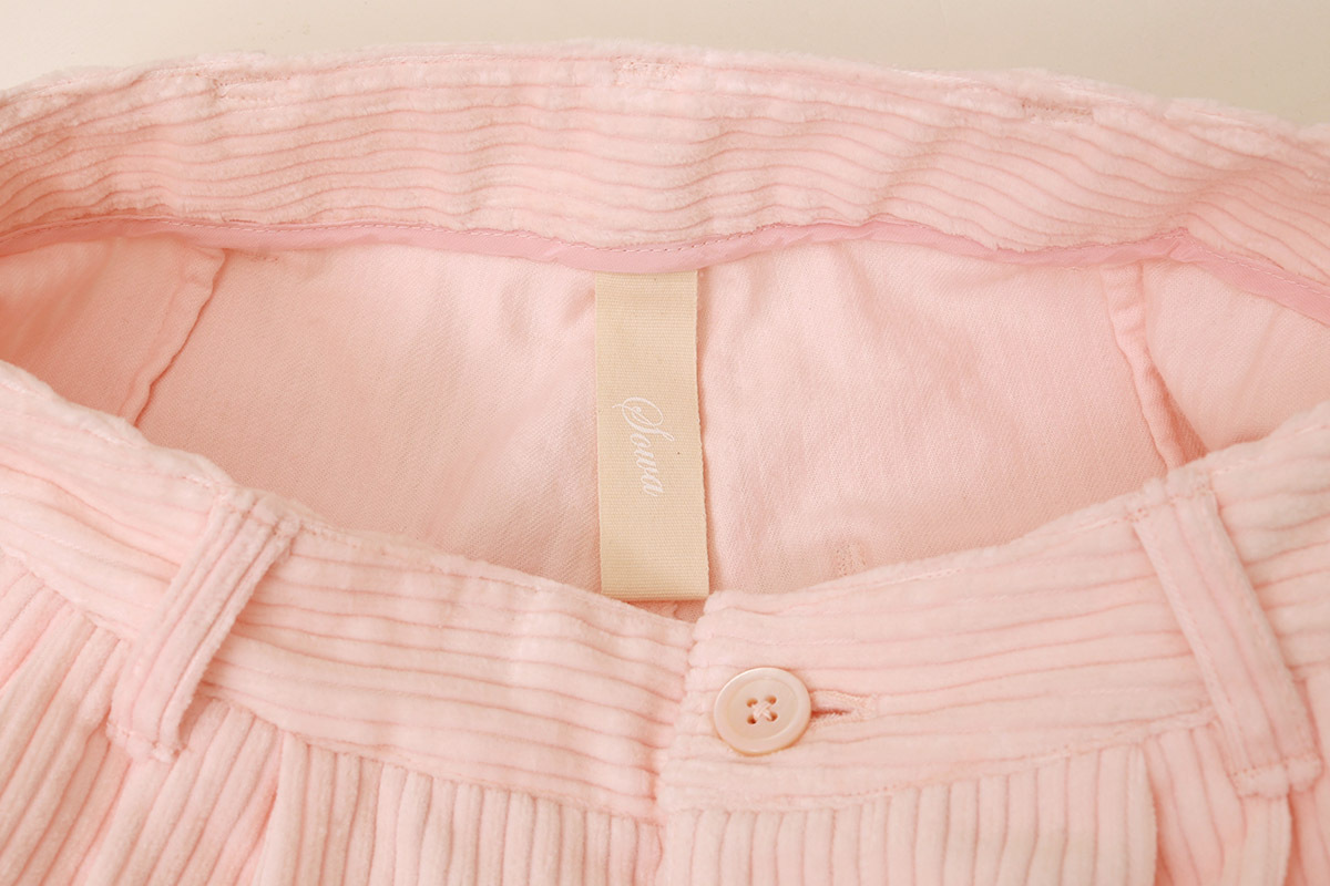 太畝のコーデュロイパンツ。後ろポケットの金糸のオリジナルタグとポケット口のシルバーのハンドステッチがポイントに。フロントに4つのタックが入っており、ゆったりとしながらもすっきりとしたシルエットです。裾には、折り返しやすいように見返しがつけられています。