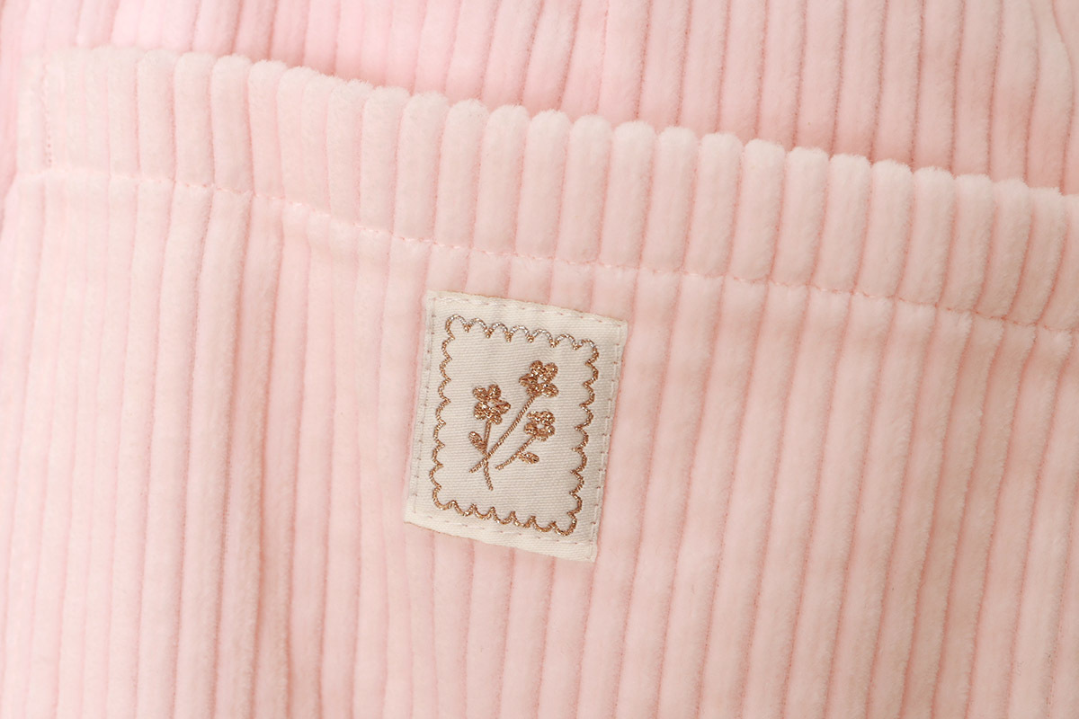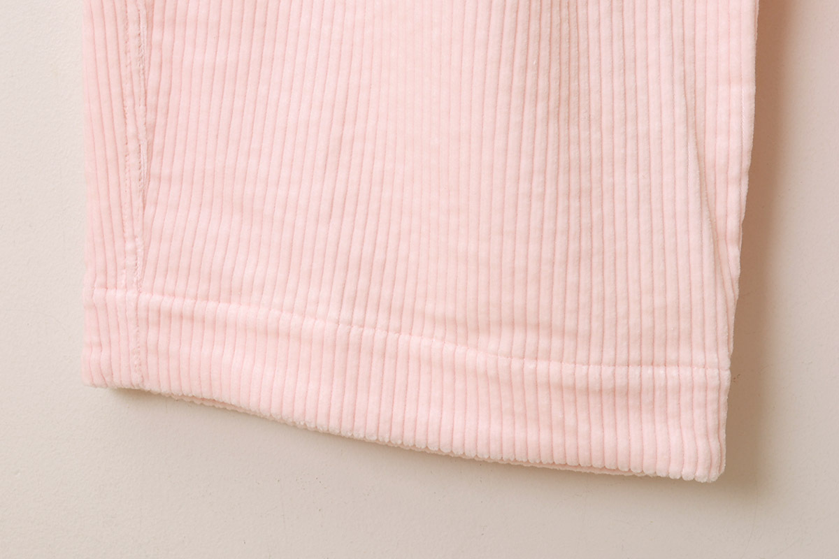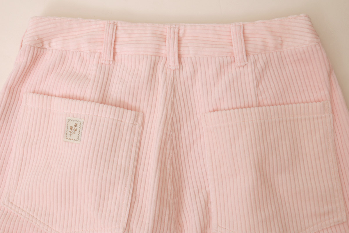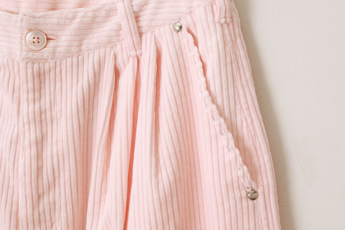 太畝のコーデュロイパンツ。後ろポケットの金糸のオリジナルタグとポケット口のシルバーのハンドステッチがポイントに。フロントに4つのタックが入っており、ゆったりとしながらもすっきりとしたシルエットです。裾には、折り返しやすいように見返しがつけられています。