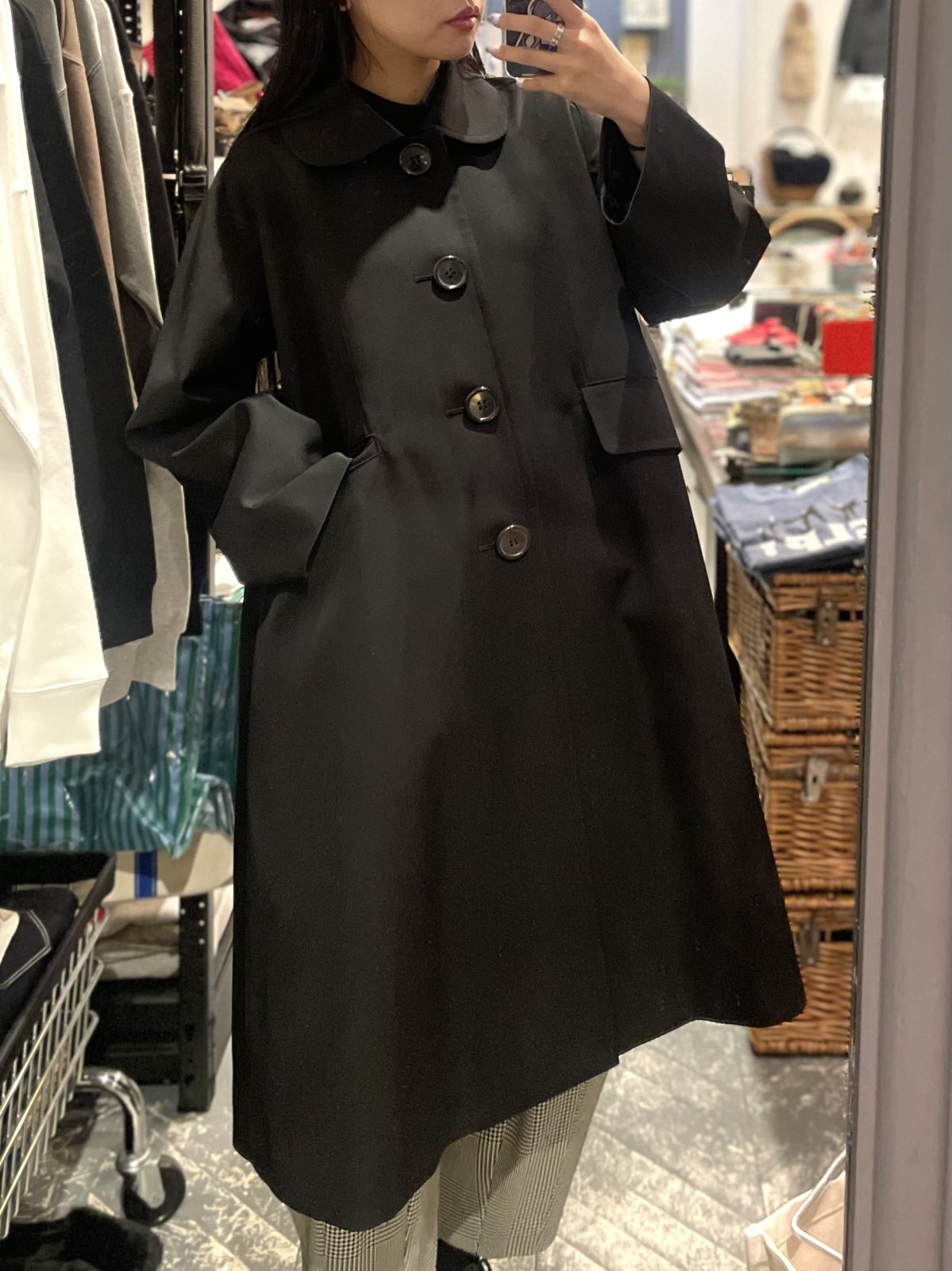 ウールギャバ素材の丸襟コート。優しい上品な光沢感でデイリー使いだけでなく、フォーマルな場面でもお使いいただけるアイテムです。大きなボタンもワンポイントでかわいい。