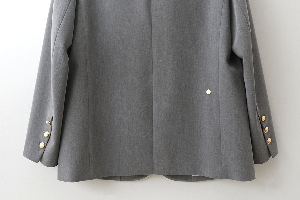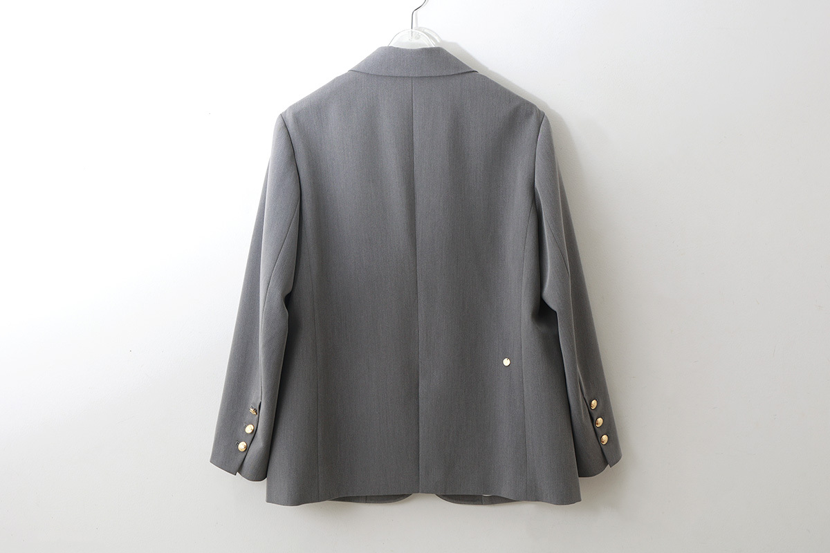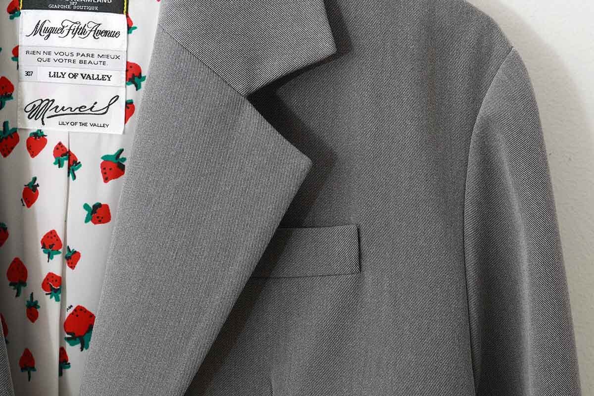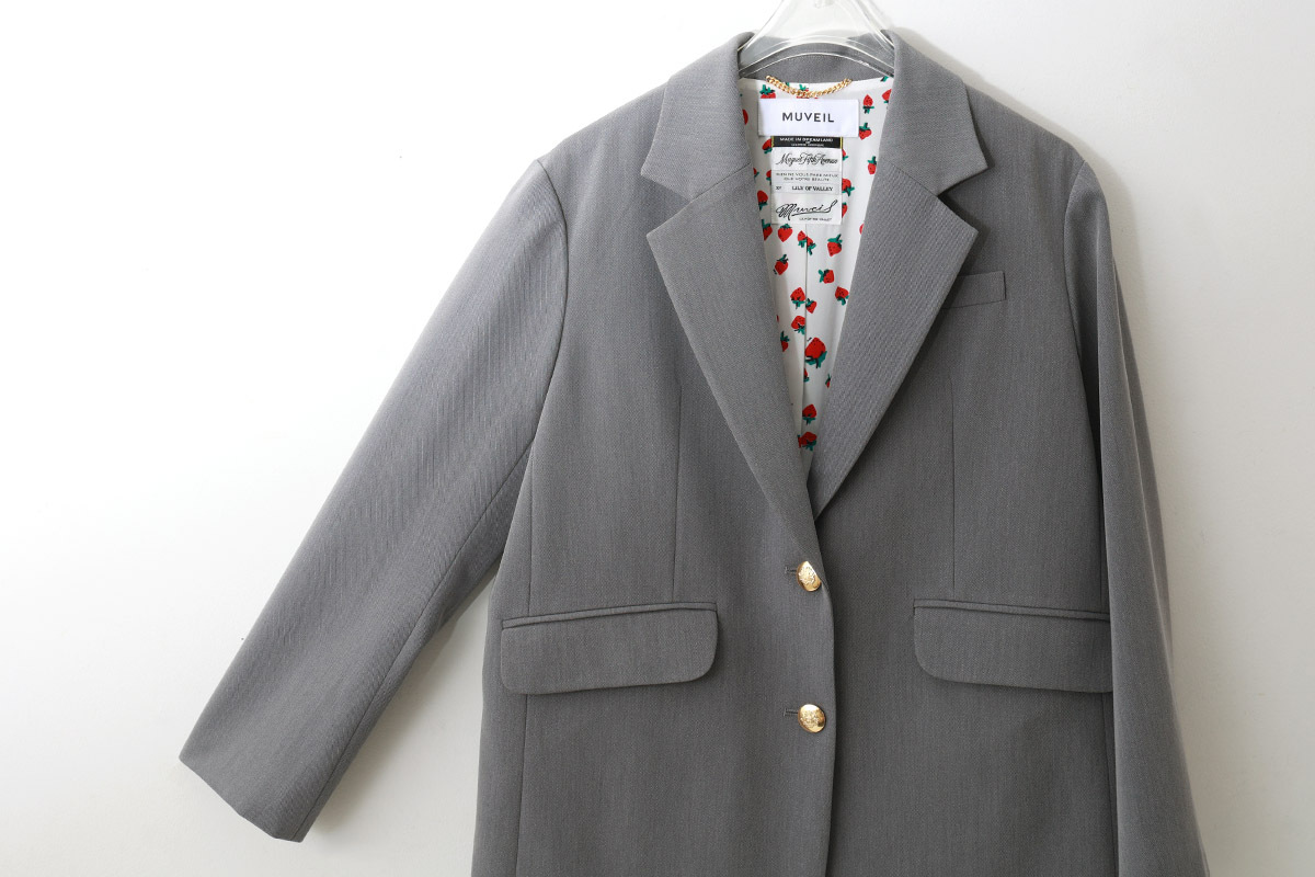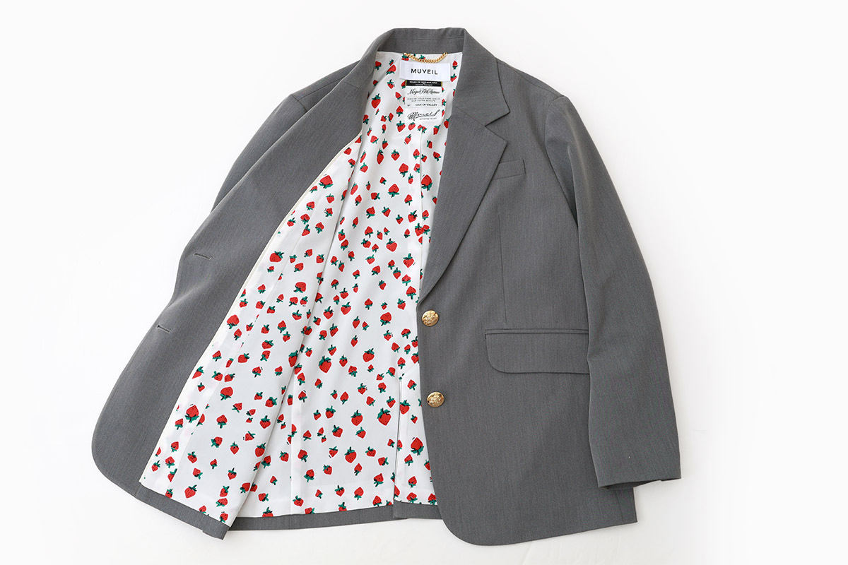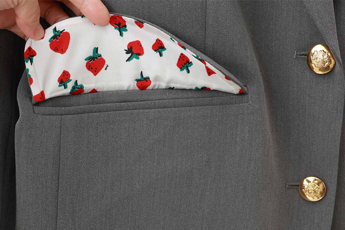 制服をイメージして作られたブレザージャケット。クラシカルな表情ながら、オーバーサイズシルエットでスタイリッシュに羽織っていただけます。裏地にイチゴ柄、落書き柄のオリジナルプリントが使用され遊び心がプラスされています。袖口裏には配色のモスステッチ仕様が施され、袖をひと折りした時のポイントに。柔らかく、肌触りの良いポリエステルレーヨン素材が使用されています。裏地と同じ柄のプリントプリーツスカートとのスタイリングもおすすめです。