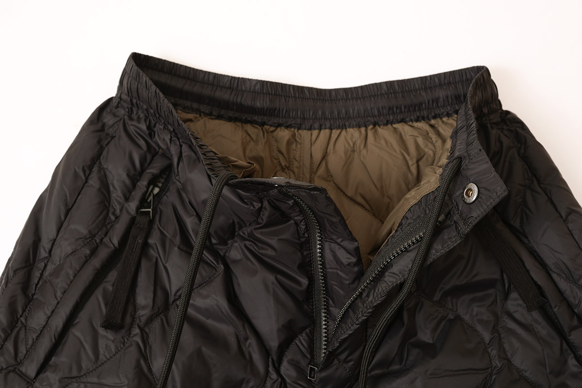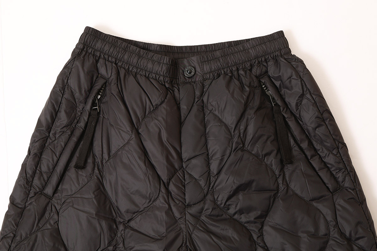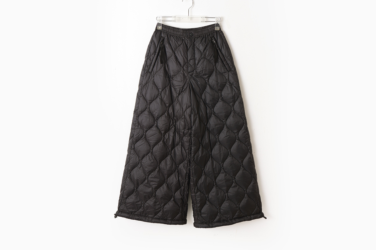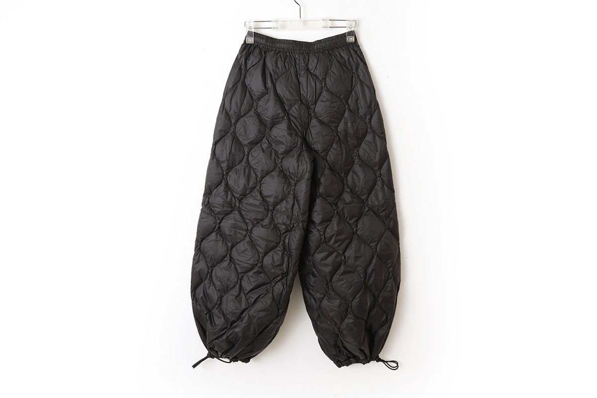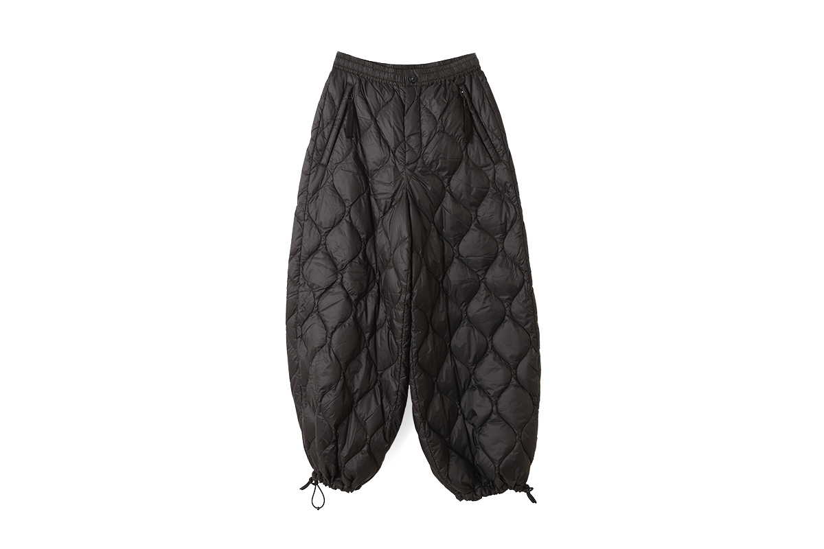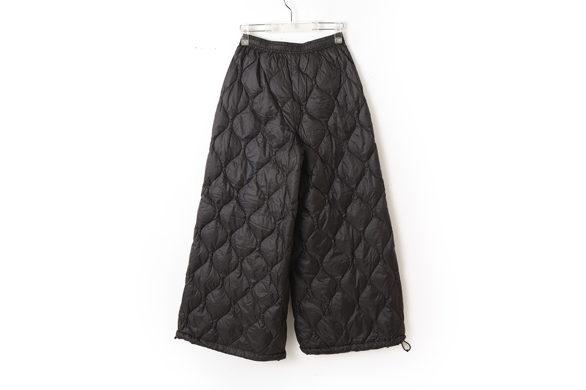 柔らかく気心地を重視した、ゆったりしたシルエットのミリタリーダウン。スカートのようにふんわりとしたボリューム感のワイドパンツです。裾は広めのデザインですが、アジャスターで絞ることでシルエットを変えることができ、9分丈でバランスよく履きこなせます。暖かく履き応えのあるパンツです。同シリーズ(MILITARY LINE)のダウンウェアやダウンマフラーなどと合わせていただくこともおすすめします。