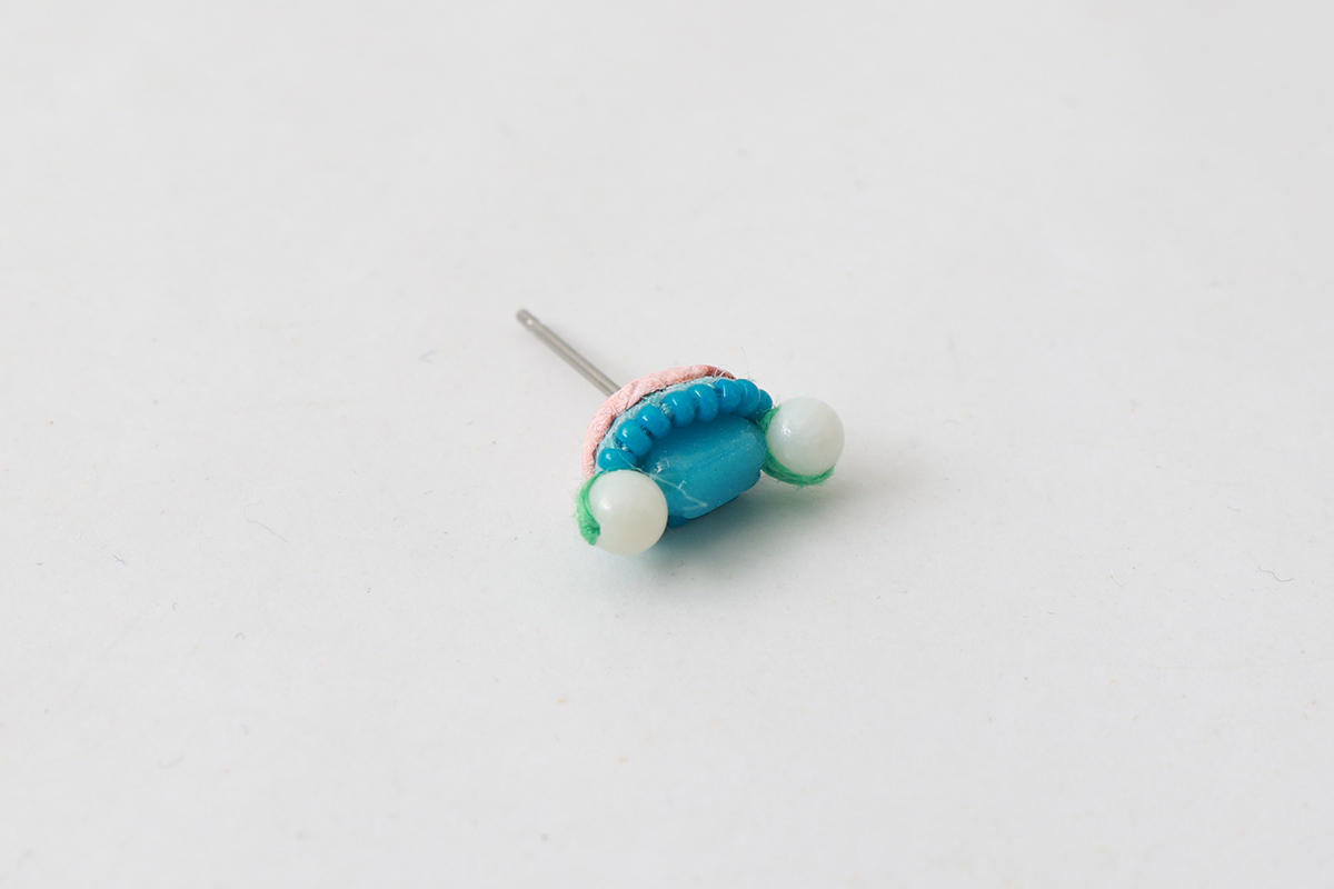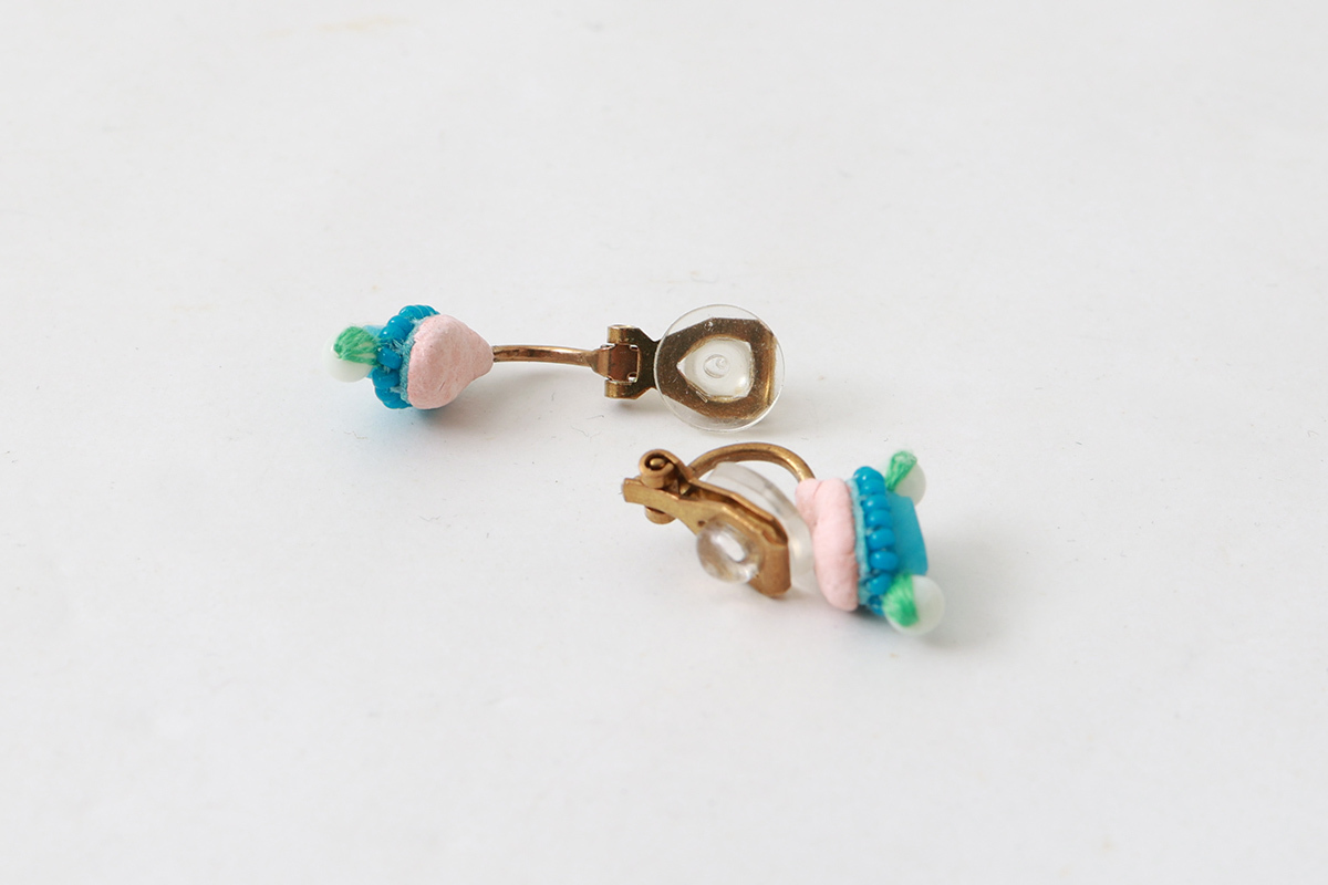 | 素材 | イヤリング金具/真鍮(フランス製) ピアスポスト/純チタン(日本製) キャッチ/真鍮 本体表/ビーズ(硝子等) シルク 本体裏/本革 |