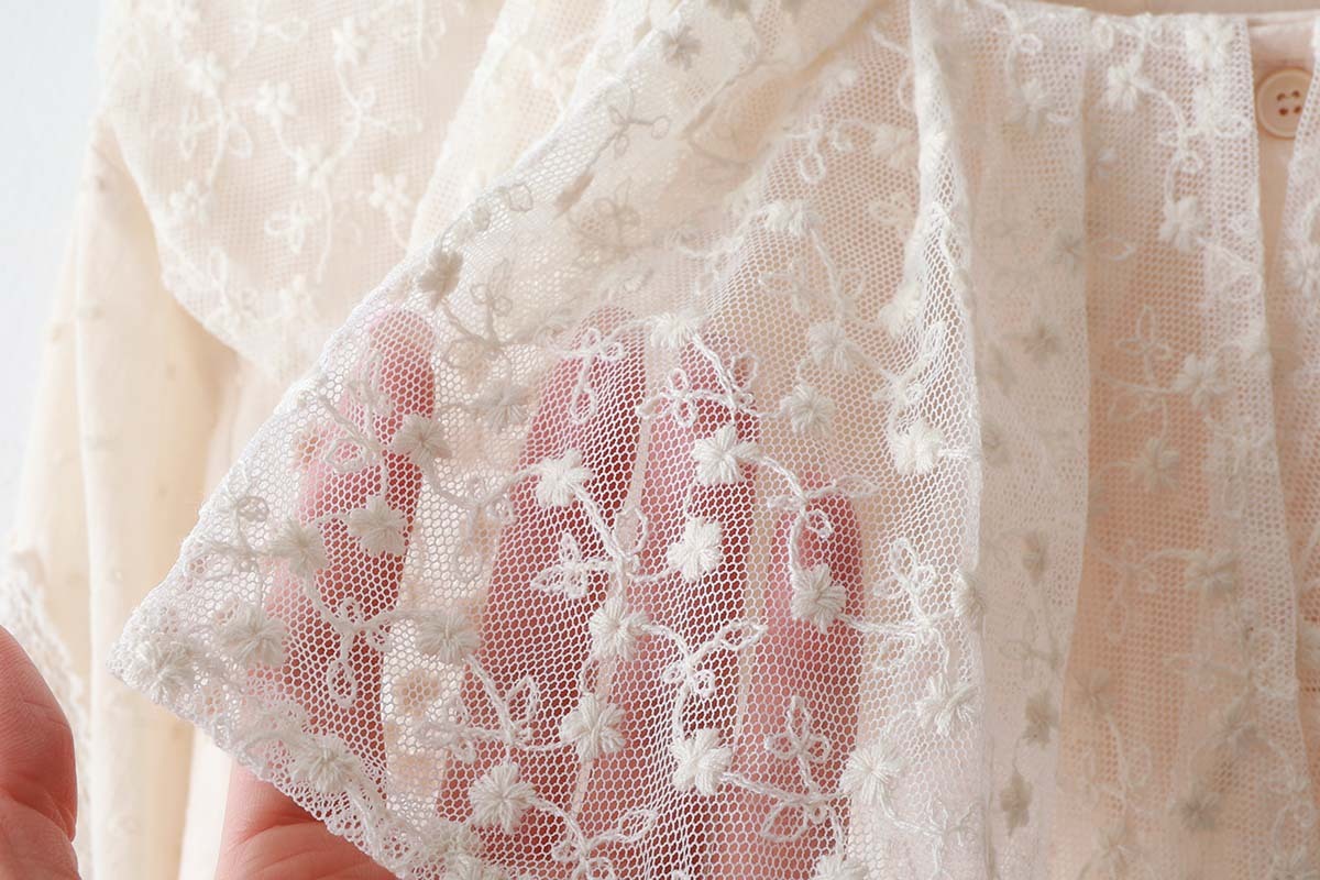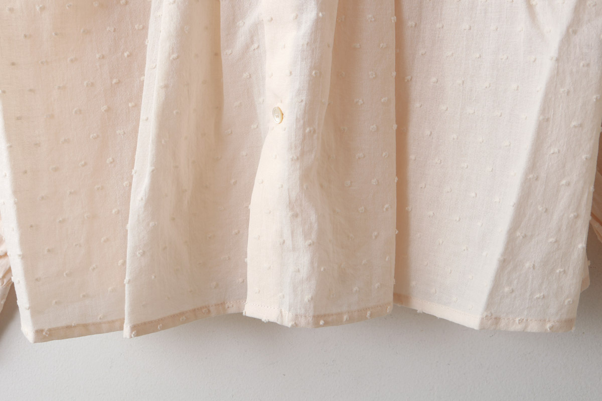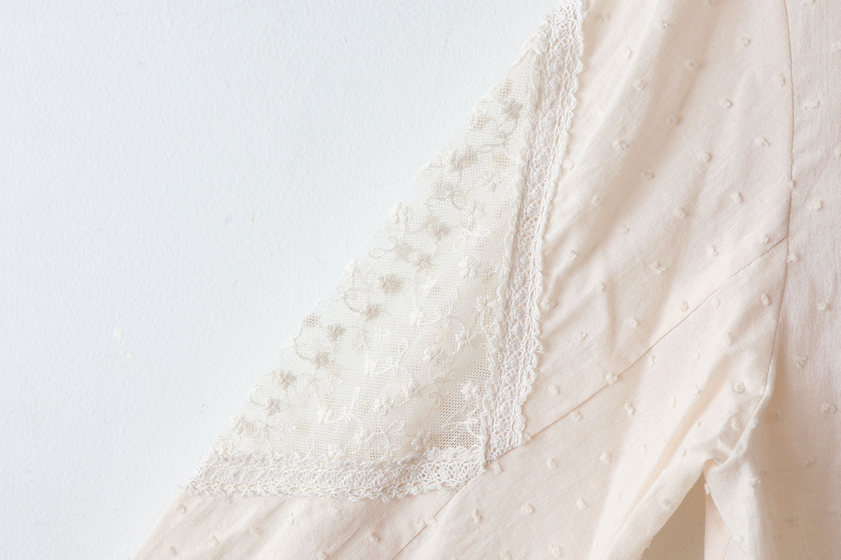 スノーカットドビーとレースを組み合わせたヴィンテージのようなシリーズ。袖にチュール刺繍の切り替えを施された贅沢な1枚。インナーや素肌がほのかに透けます。