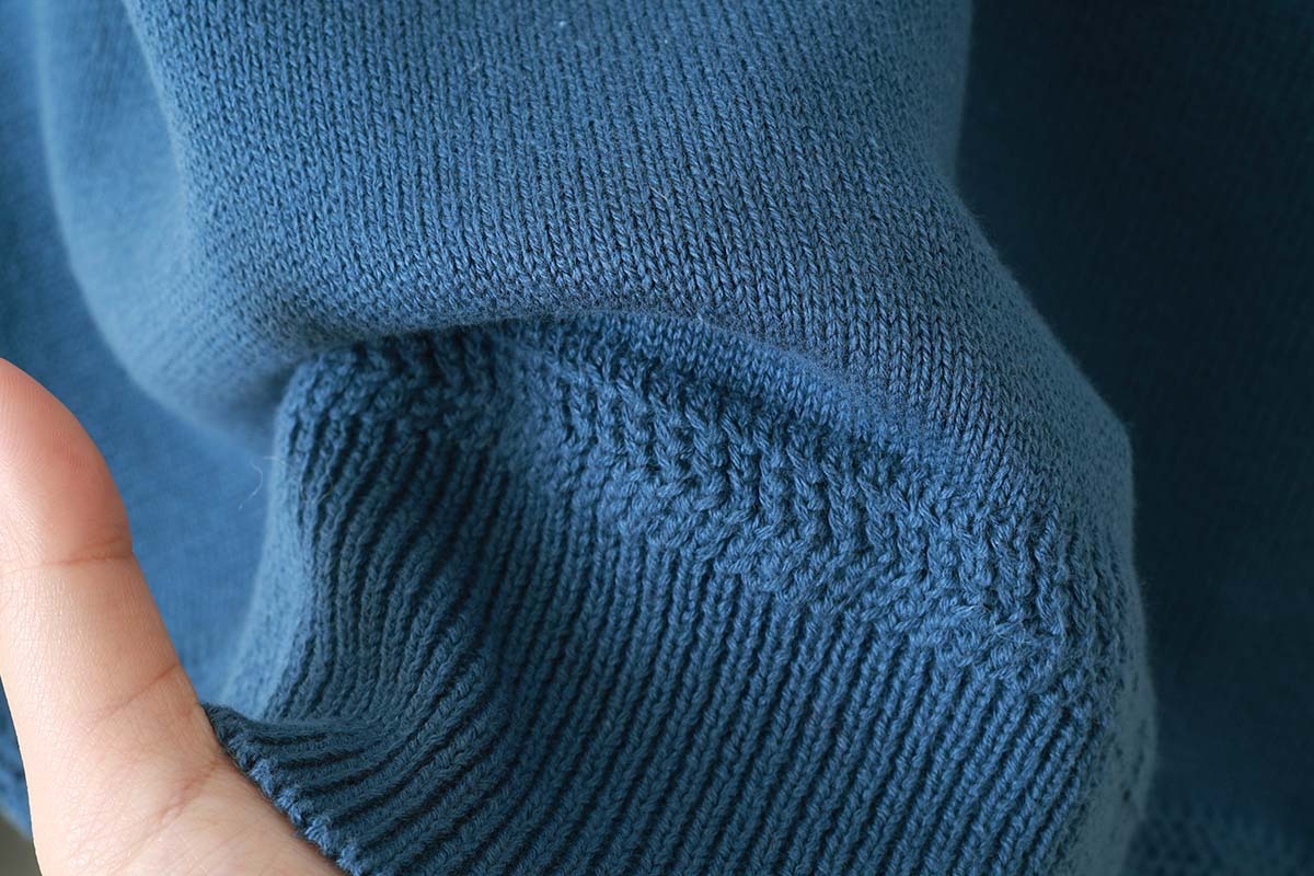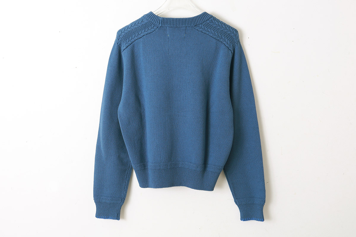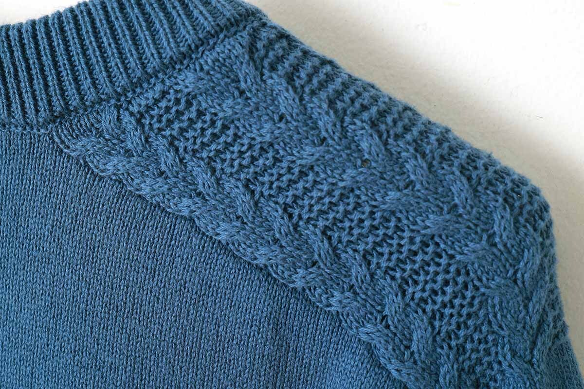 インターシャで編み込まれた肩の模様編みと、袖口に施された毛糸のブランケットステッチがポイント。