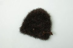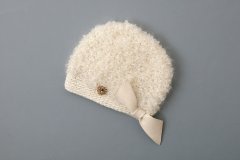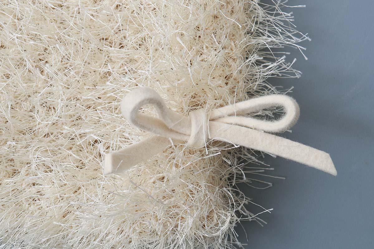ポリモールは、毛足が長くもこもことした豪華な風合いを持つモールヤーン(シェニール糸)の一種。独特の柔らかさと光沢が特徴です。後ろには毛糸と同系色のフェルトリボン。サイドにはきらりと光るアンティーク調のボタンがアクセントになっています。