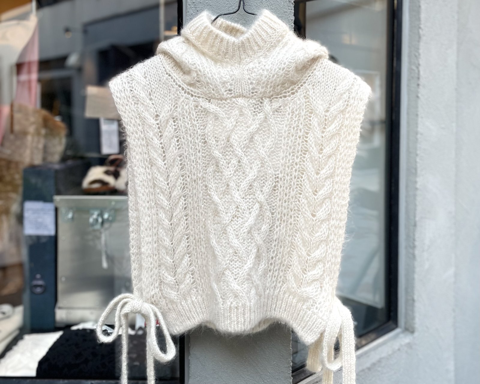 山形県のニットウェアブランド「BATONER」とコラボレーションしたニットベスト。ハイネックのフードでマフラーいらずのあたたかさ。サイドのリボンで調節できるので、トップスやワンピースの上など色々な重ね着が楽しくなるアイテムです。