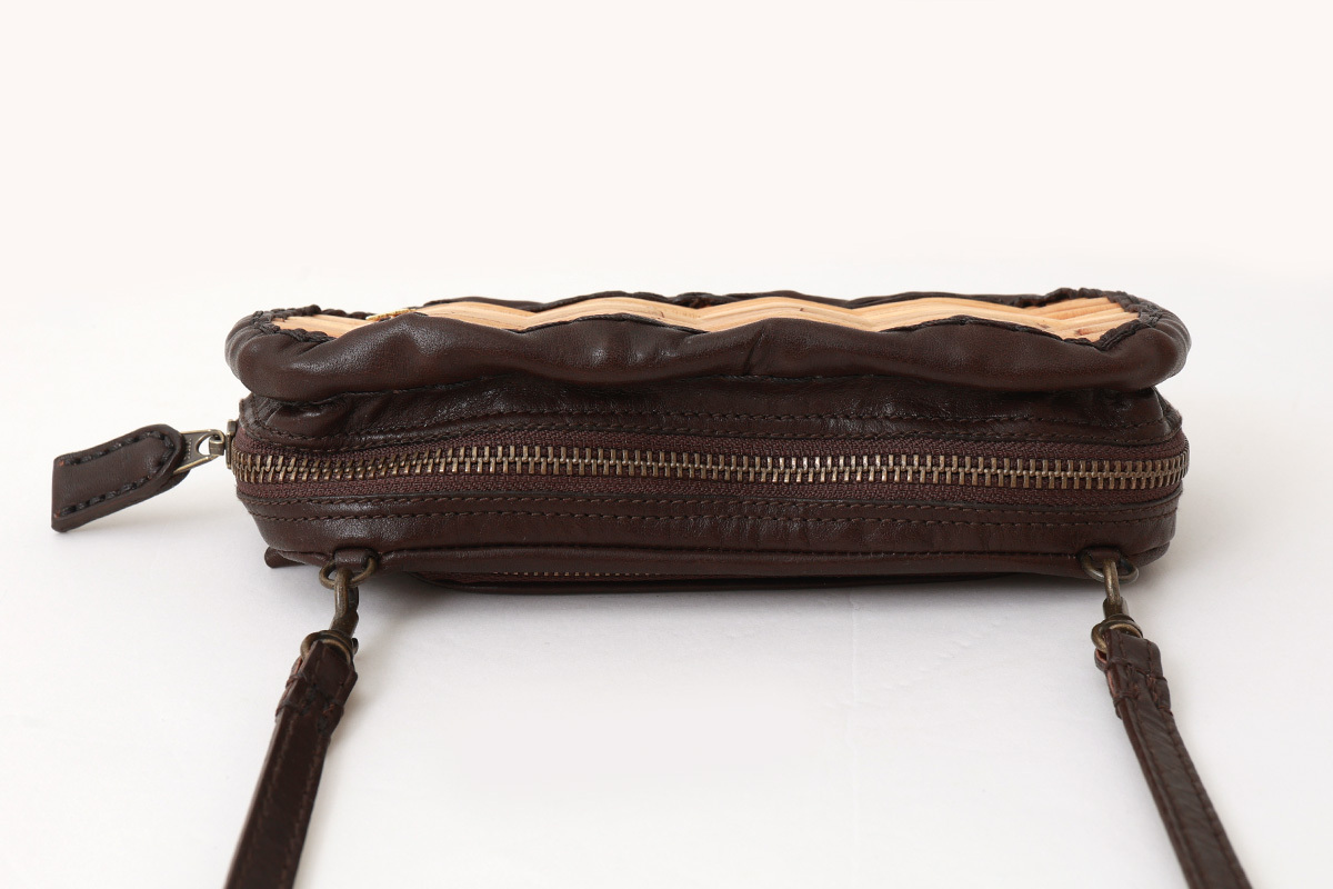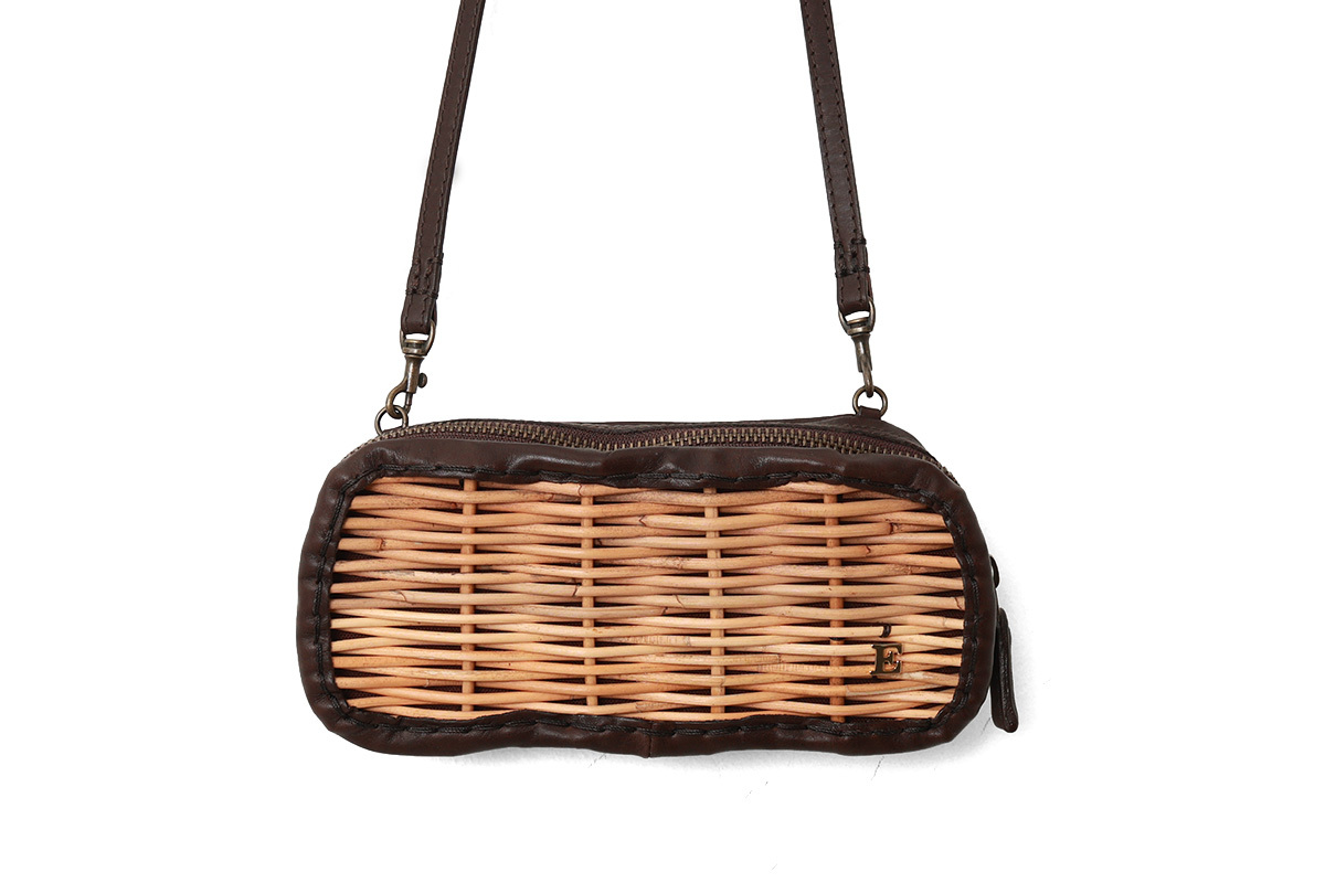紅籘と牛革ソフトの組み合わせの長財布。牛革ソフトは渋なめしの限界の厚さ0.8cmまで薄くしてタイコ染色をしソフトな仕上げのものにアイロンをかけ、自然な艶を出した素材。エバゴスといえば紅籘のかご。紅籘を使ったお財布は他にはありません。たっぷり収納できる長財布。新しくポシェットのように肩からかけることのできるショルダーベルつきで、取り外し、長さ調節可能です。