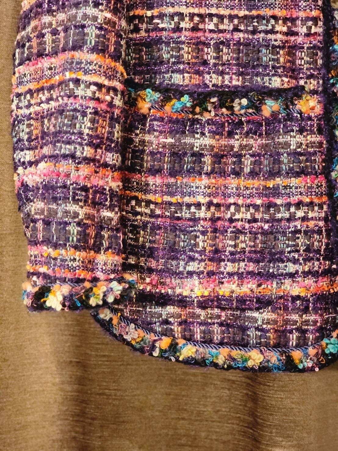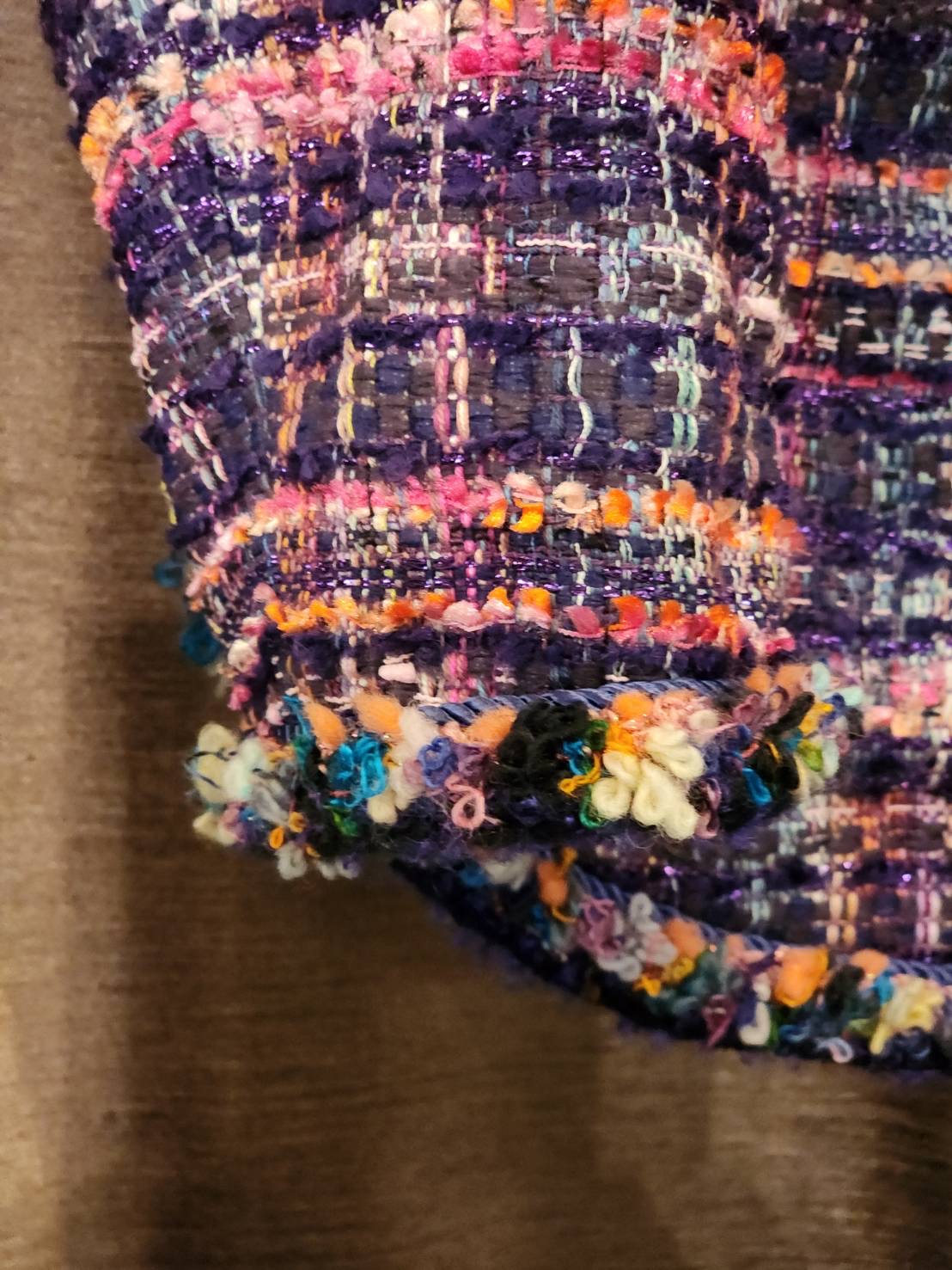 フランスのマリア・ケント(MALHIA KENT)社のツイードを使用したジャケットです。襟ぐりから前立て、袖口やポケット口のトリミングには全て手編みのブレードが施されており、細部にわたって丁寧な手仕事のぬくもりが感じられます。